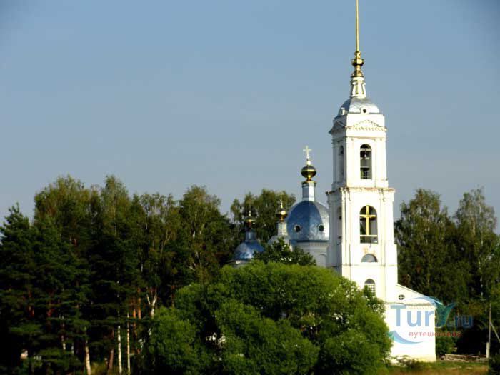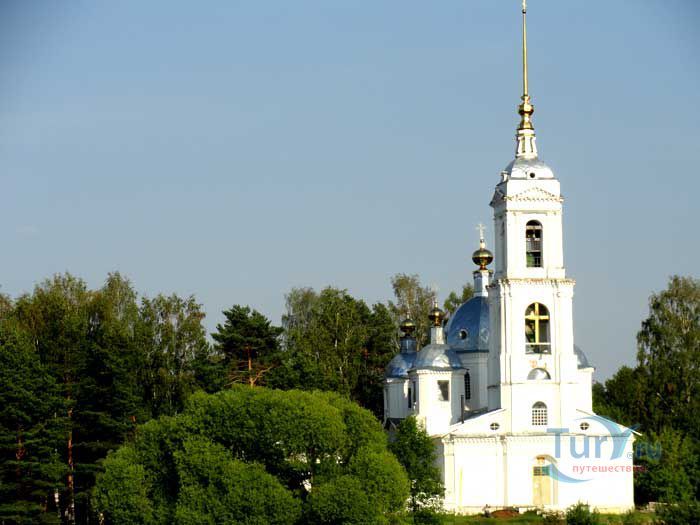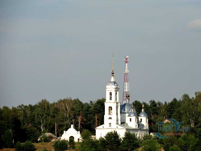 Церковь Сашки пастушка стоит на живописном берегу реки Волги недалеко от села Охотино. С водного простора реки открывается великолепный вид на белокаменный храм. Собор завораживает своим видом не давая отвести от себя взгляд, величественно возвышаясь в зеленой бахроме деревьев и переливаясь в отблесках солнца золотыми куполами.