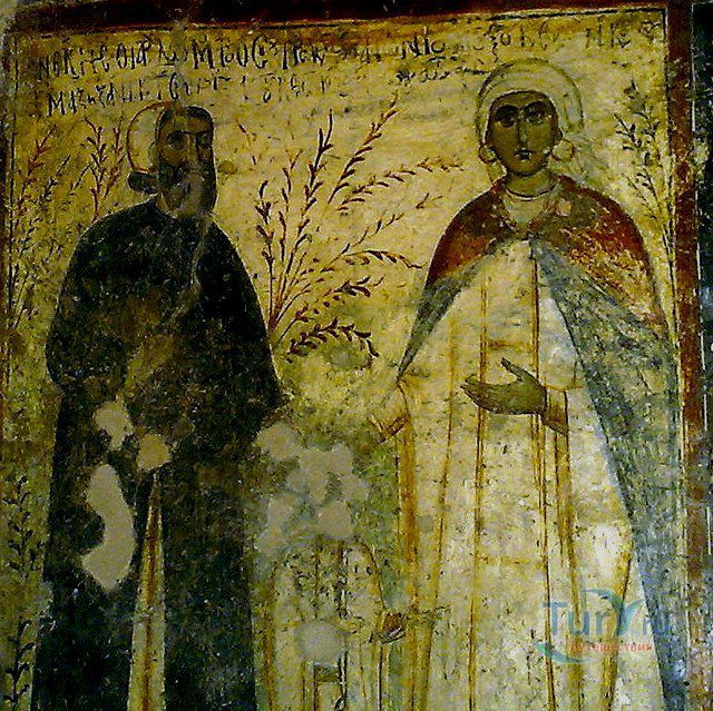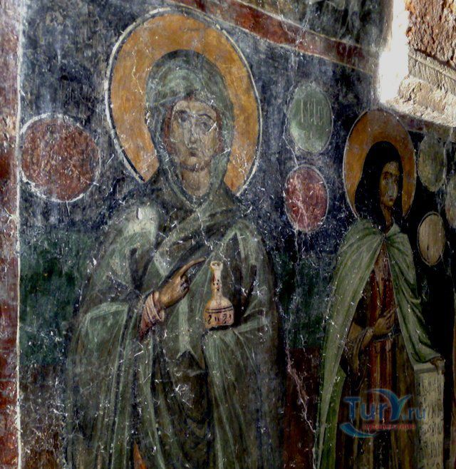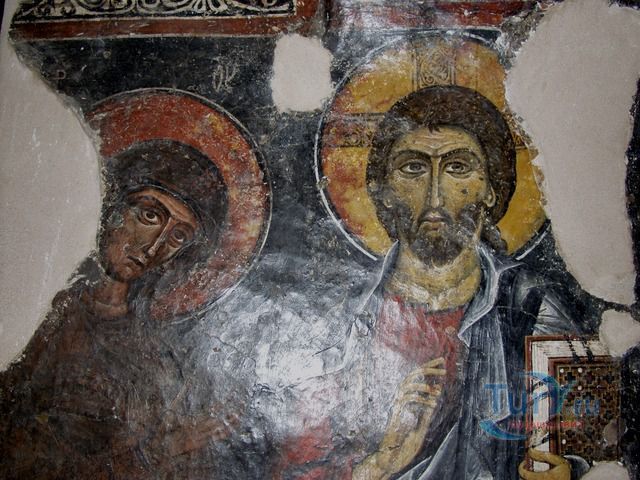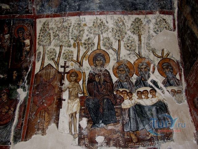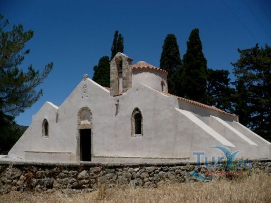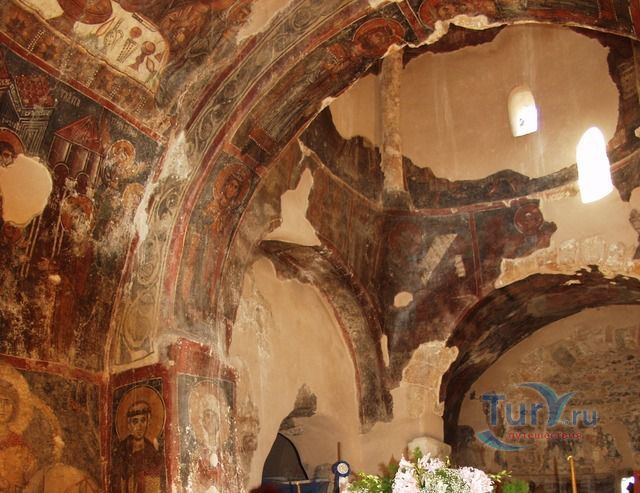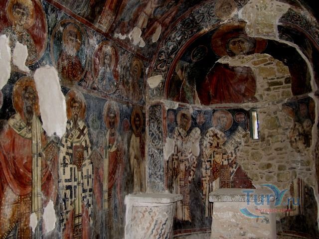 Византийская церковь Успения Девы Марии, Святого Антония и Святой Анны украшена росписями, представляющие различные религиозные темы. Центральный проход посвящен Деве Марии, а проход на север посвящен Святому Антония и имеет несколько картин, изображающих Страшный Суд. Многие чудеса были связаны с иконой Панагия Кера. По преданию, во время византийского периода иконоборчества, икона Панагия была увезена в Стамбул. В настоящее время икона, которая украшает монастырь только копия оригинала, которая была нарисовала в 1732 году. Все настенные росписи яркие, выразительные и эстетически совершены. Они были спрятаны в течение сотен лет, чтобы избежать уничтожения со стороны турецких оккупантов.