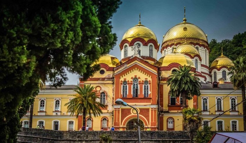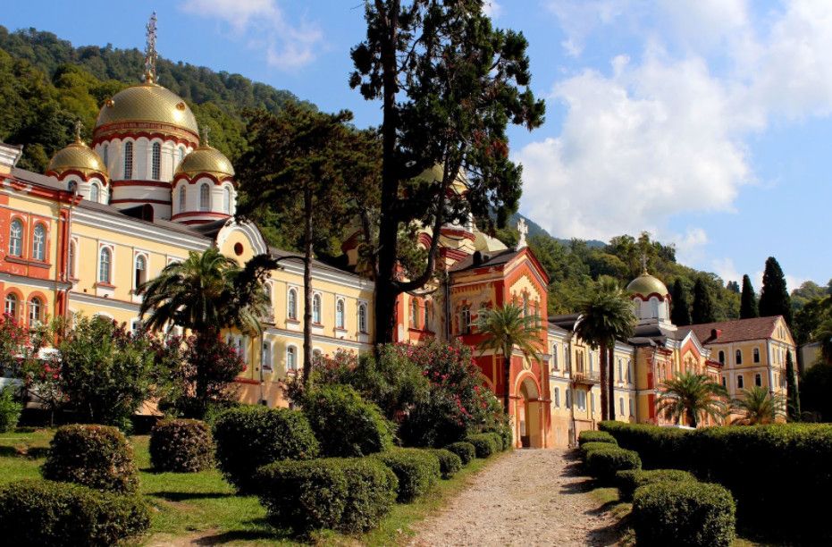 Новоафонский монастырь был основан в XIX веке русскими монахами из знаменитого монастыря на Святой горе Афон в Греции. Это грандиозное и величественное сооружение возводилось на протяжении более 15 лет и сегодня является одной из знаменитейших святынь православия. Монастырь расположен на высоте 75 метров над уровнем моря, у подножия Иверской горы, недалеко от древнего храма Симона Канонита. Издалека монастырь производит впечатление сказочного города из русского фольклора. Те же величественные купола, осененные крестами и золотые маковки церквей. Крупные храмы – трехкупольная церковь Вознесения, Церковь Святого апостола Андрея Первозванного и Церковь Святых угодников Афонских. Рядом с ними широкая, выложенная разноцветной плиткой, дорога, уводящая под высокую арку ворот. В центре западного корпуса возвышается 50-метровая колокольня с часами. Но самое грандиозное сооружение монастыря – это Пантелеймоновский собор. Он не только производит впечатление своими размерами: длина - 53,3 метра , ширина - 33,7 метра, но и поражает красотой и архитектуры и внутреннего убранства. Собор - крупнейшее культовое сооружение Абхазии. В нем может одновременно поместиться более трех тысяч человек.