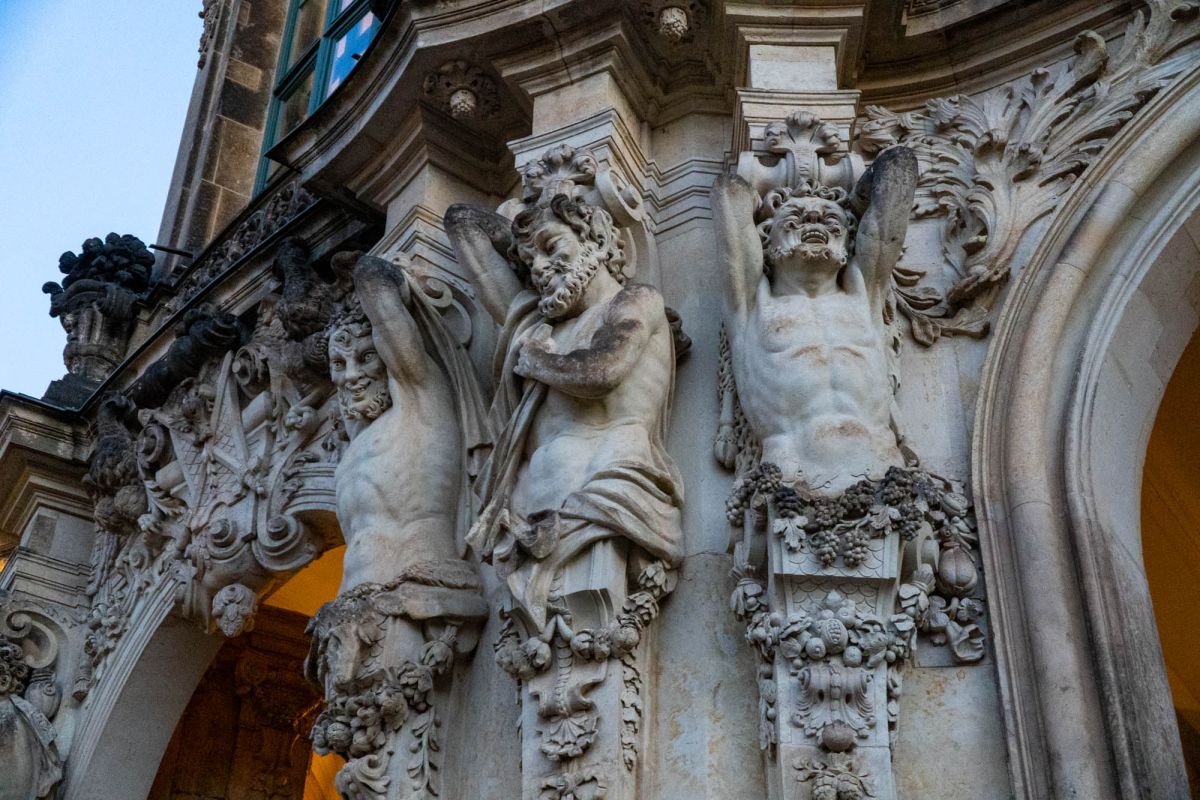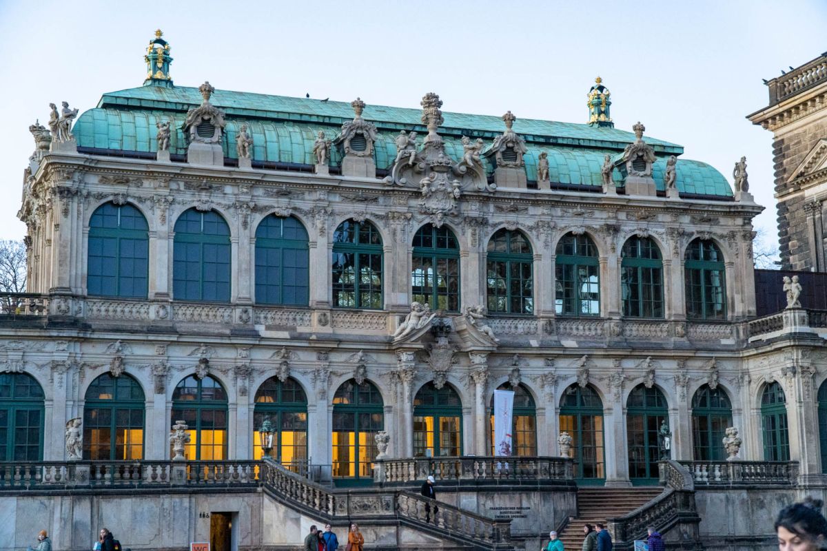 Дрезденский Цвингер - это символ столицы культуры, которая на протяжении столетий как магнит притягивала к себе поэтов и художников, зодчих и музыкантов. Дворцовый ансамбль, находящийся в Альтштадте (Старом городе) Дрездена (Германия), яркий памятник немецкого барокко (1711–1722, арх. М.Д.Пёппельман), состоящий из изящных нарядных павильонов, объединенных галереями, и здания Дрезденской картинной галереи, построенной в стиле неоренессанса (начата в 1847 Г.Земпером, закончена придворным архитектором Крюгером к 1855). Целый комплекс строений сгруппирован вокруг двора с фонтанами: прямые одноэтажные галереи сменяются дугообразными контурами ворот и павильонов. Южной границей Цвингера служат Прямые галереи и Коронные ворота, увенчанные королевской короной из золоченой меди, а северной – пристроенное в середине 19 в. здание Картинной галереи. С восточной и западной стороны композиция почти зеркально повторяется: Закругленные галереи в плане образуют подобие подковы, опирающейся на два небольших павильона. По центру западной «подковы» расположился Павильон на валу. Два небольших павильона, соединенных с ним Закругленными галереями, называются Физико-математическим (по названию коллекции, которая в нем находится почти 300 лет) и Французским, так как на его верхнем этаже размещались картины французских мастеров. За Французским павильоном, примыкающим к Картинной галерее, находится знаменитый грот – Купальня нимф, попасть в который можно, пройдя через первый этаж Французского павильона. Подобная композиция повторяется и на восточной стороне. В центре между обеими восточными Закругленными галереями расположен павильон, называемый Колокольным, так как по обе стороны часов, установленных в его среднем окне, висят белые колокола из мейсенского фарфора, бьющие каждый час. Небольшой прямоугольный павильон, примыкающий к Картинной галерее на восточной стороне, называется Немецким, так как в его верхнем зале расположен отдел немецкой живописи. Подобный же павильон, стоящий перпендикулярно Прямой галерее, – это Павильон, в котором размещается Музей фарфора.