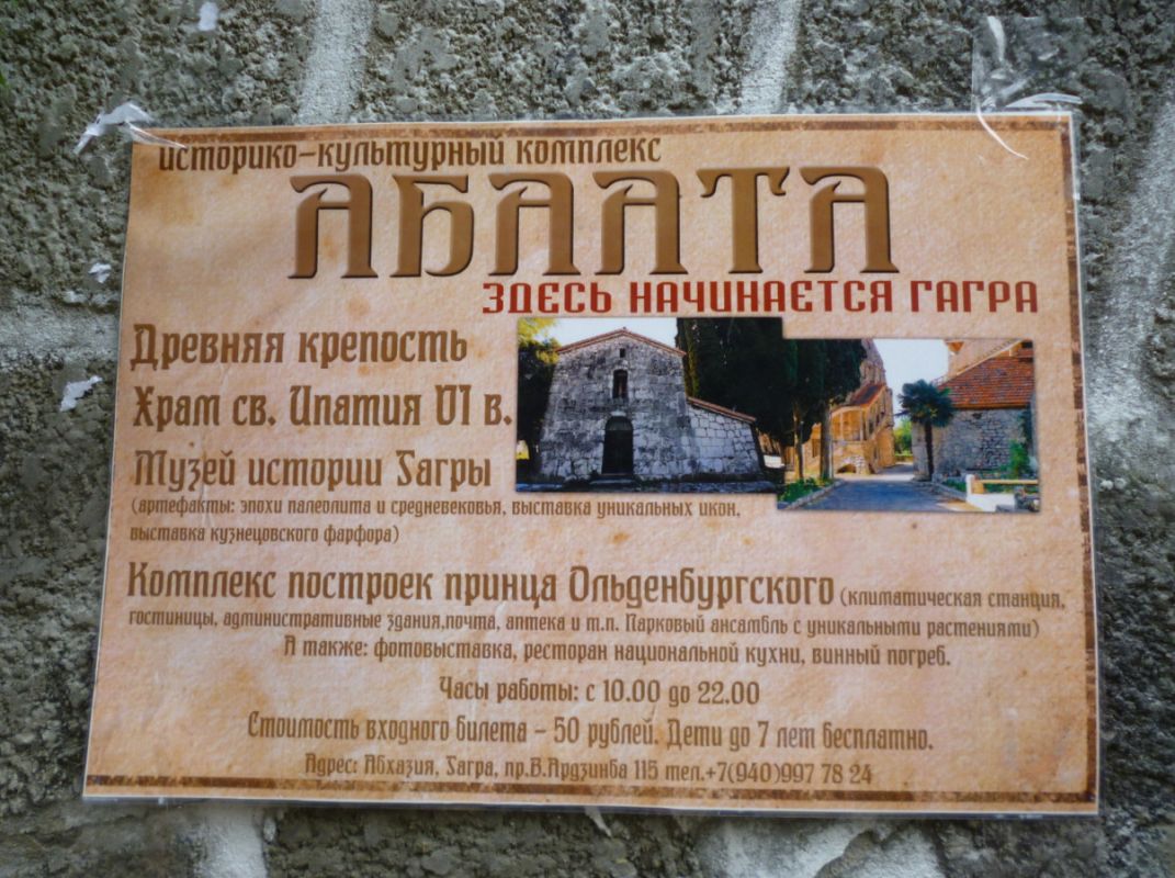 Крепость Абаата - древнейшее фортификационное сооружение Абхазии, расположена в городе Гагра, на территории Гагрского приморского парка. Данная местность была заселена ещё в I веке до нашей эры - сначала греки основали здесь торговую факторию Триглиф, затем римляне построили на её месте крепость Нитика, а в IV-V веках, для защиты подступов со стороны Жоэкварского ущелья, в окрестностях современной Гагры была возведена мощная крепость, названная абхазами Абаатой. В VI-VIII веках внутри крепости христиане построили храм Покрова Божьей матери, в последующем освящённый в честь Святого Ипатия Гагрского. В XIV-XV веках в крепости обосновались генуэзцы, основавшие на месте нынешней Гагры факторию Какара. На протяжении истории своего существования крепость не раз переходила из рук в руки - ею владели римляне, генуэзцы, русские и коренные абхазские племена, и каждый раз в архитектуру крепости вносились всё новые изменения. В 1830 году крепость Абаата занял русский гарнизон, а в 1854 году, во время Крымской войны, военные покинули крепость, взорвав ее укрепления. В начале XX века принц Ольденбургский приказал разрушить часть крепостной стены, построить на территории цитадели гостиницу и облагородить прилегающую территорию. Не уцелела и обращённая к морю крепостная стена - она была размыта морским прибоем и более не восстанавливалась. До наших дней от крепости Абаата сохранились лишь часть крепостных стен и храм Святого Ипатия. Сегодня на территории Гагрской крепости находятся Гагрский историко-краеведческий музей Абаата, гостиница и ресторан.