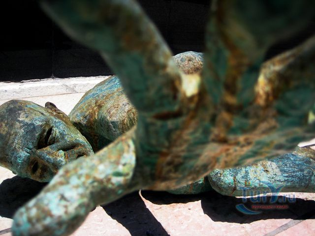 В любое время суток из любой точки Мемориала вытянутая к небу рука видна неразделимо с её отражением в тёмной воде пруда, устремлённым вниз, как символ извечного противостояния добра и зла.
