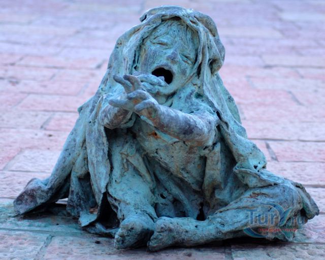 Рука с вытутаированным идентификационным номером узника Освенцима окружена множеством фигур жертв, обращённая кверху ладонь застыла в ожидании помощи.