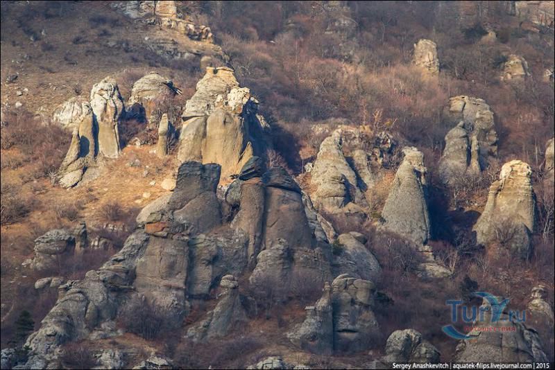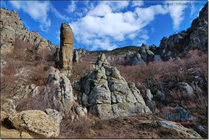 В Алуштинской долине, на западном склоне горы Демерджи находится удивительное творение природы – Долина привидений. Миллионы лет ветер, словно искусный скульптор, работал над скальным материалом и, в конце концов, сумел создать скульптуры, поражающие наше воображение – группу хаотически разбросанных скал, похожих на древних идолов.