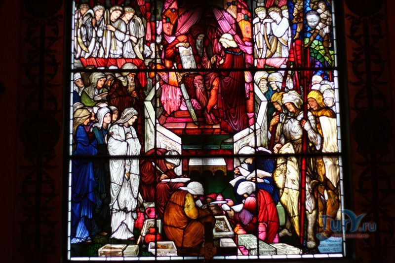 Кафедра покрыта резьбой со сценами из жизни Иисуса и портретами проповедников, алтарная стена украшена барельефами библейской тематики, а витражные окна рассказывают историю Рождества.
