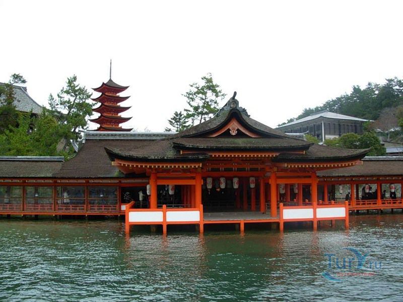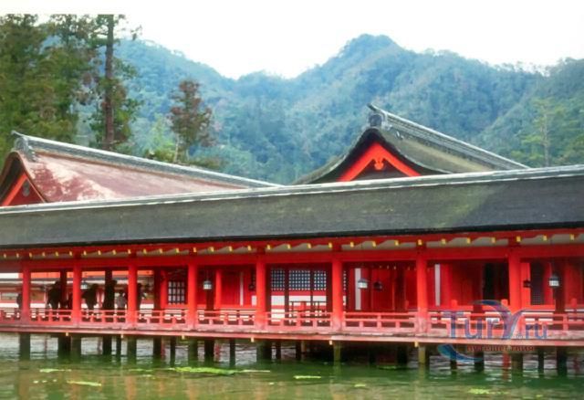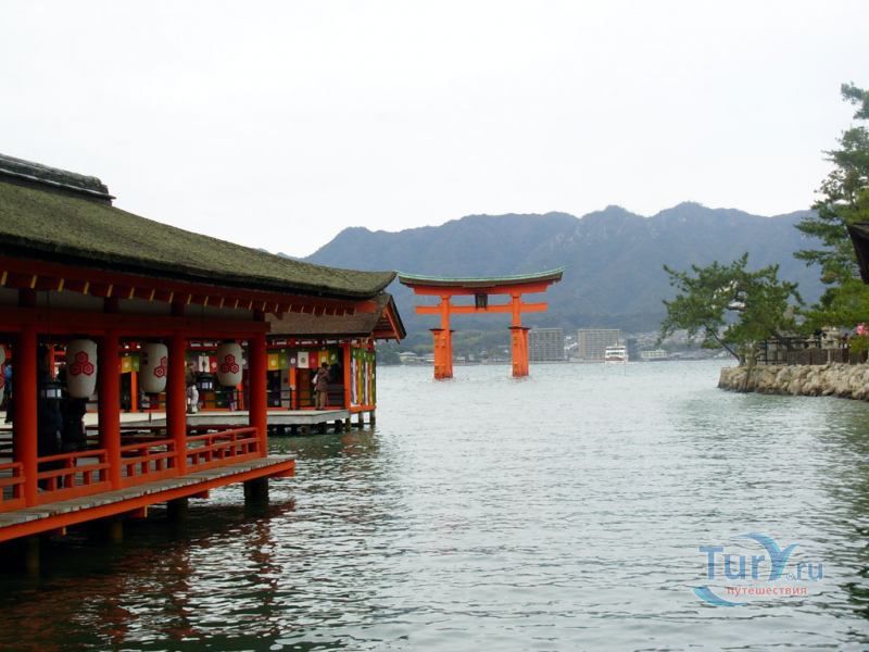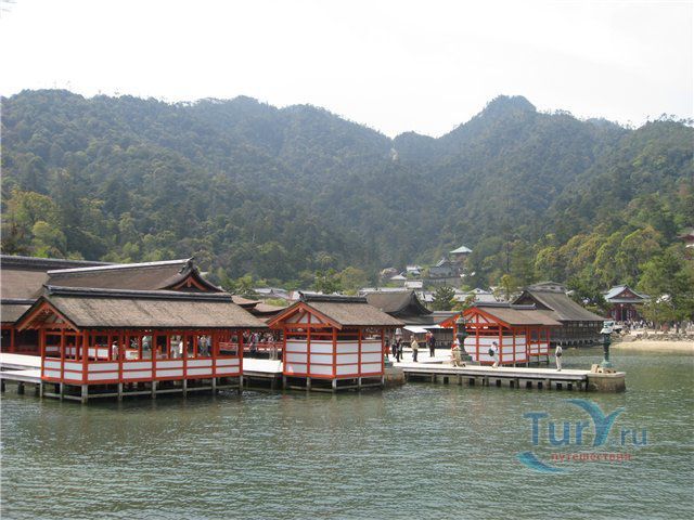 Миядзима - остров в Японском Внутреннем море (Сэто найкай). До середины прошлого века остров считался священным, и здесь, согласно синтоистским верованиям, не должно было свершаться что-либо нечистое, к чему причислялись роды и похороны. До сих пор здесь нет кладбища, и умерших увозят с острова. Дословно Миядзима означает Остров храма, и это вполне справедливо, поскольку здесь воздвигнут Ицукусима — один из древнейших синтоистских храмов, ярко-красные ворота — тории — вынесены далеко в море перед входом в святилище. В мире можно отыскать множество портальных построек, обладающих особой символикой и психологическим назначением. Они стоят как бы на границе двух разных областей духовной жизни: общественной и частной, уязвимой и защищенной, известной и неизвестной, мирской и сакральной. Самые знаменитые в Японии и одни из самых прекрасных в мире - деревянные ворота святилища Ицукусима на острове Миядзима. В Японии они самые большие, а стоят в маленькой бухте, прямо в воде. Две центральные колонны высотой в 16,2 метра поддерживают верхнюю поперечную перекладину длиной в 23,5 метра. Пройти под этими воротами можно только во время отлива. Существует поверье: человек, которому удастся пройти под этими воротами, обретёт счастье и благополучие. Как, впрочем, и исполнятся все его желания. На сцене, по сторонам которой стоят два музыкальных павильона, исполняются традиционные синтоистские танцы. Кроме того, здесь есть отдельное святилище О-кунинуси, сына Сусаноо, и еще одно - бога Тендзина. Последний, правда, действительно жил на этом свете. Он был императорским министром, умер в 903 году и после смерти почитался как бог учености и письменности. Постройки в бухте связаны между собой крытыми галереями, а к острову от них ведет красный деревянный мост. Особенно красиво здесь к вечеру, когда зажигаются фонари. Прямо у берега, на специальной площадке, находится старейший театр Японии - Но. Он был построен в 1568 году, позже реставрирован. Возле бухты стоят пагода и современная сейсмоустойчивая сокровищница, в которой хранится более 4000 бесценных предметов: расписные свитки, маски и веера, оружие и фарфор. Пятиярусная пагода и Зал тысячи циновок расположены на небольшом холме. Говорят, будто зал был построен из ствола одного-единственного камфарного лавра. С горы Мизен, самой высокой на острове (530 метров), открывается прекрасный вид.
