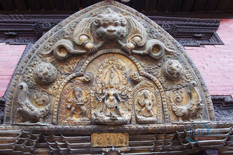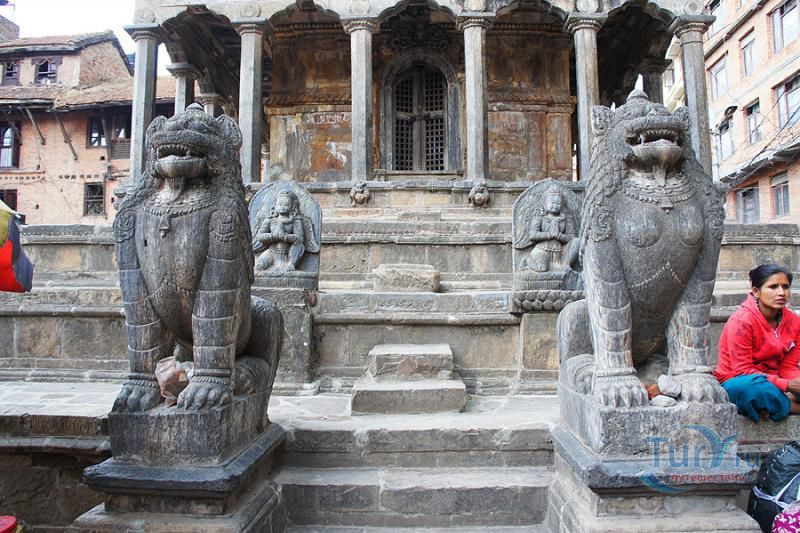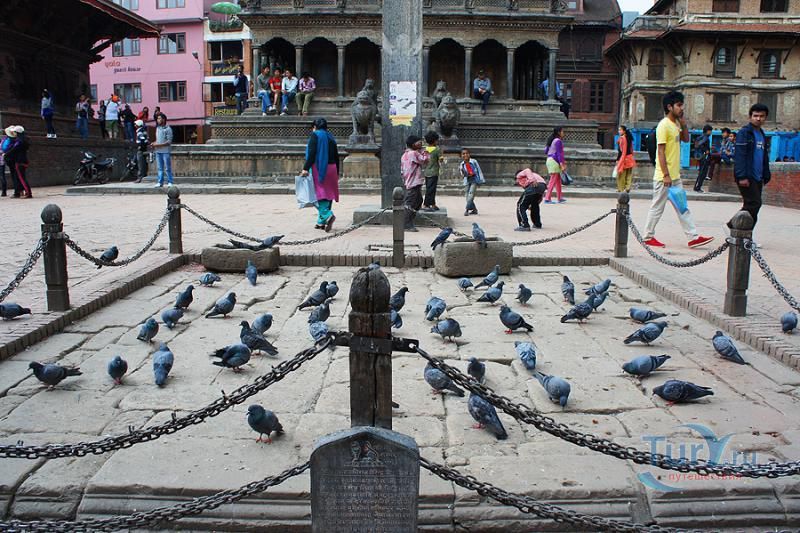 Одна из главных достопримечательностей площади - Старинный Королевский Дворец, где обитали правители Лалитпура. Площадь Дурбар это чудо архитектуры древних времен. Площадь вымощена красным кирпичом, на ней расположено множество храмов и религиозных идолов. Главные храмы находятся напротив западной стороны дворца. Входы в храмы направлены на восток, лицом к дворцу. Также неподалеку от дворца находится большой колокол. Площадь Дурбар, а также различные храмовые постройки, расположенные на ней, демонстрируют нам отличный пример архитектуры народа Нева.