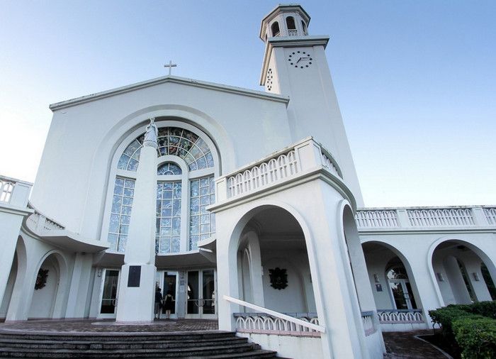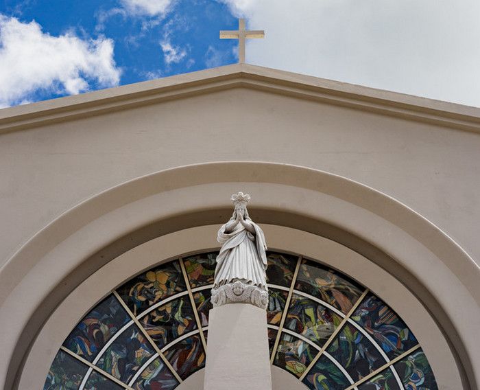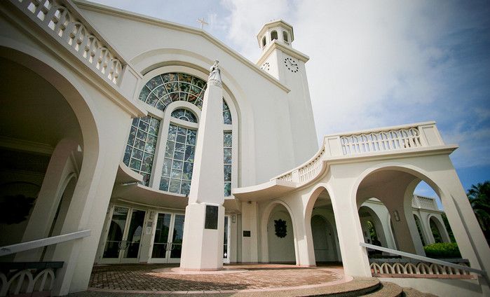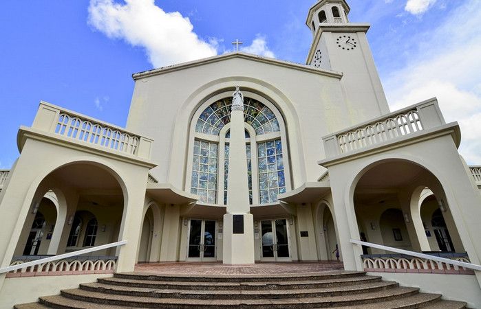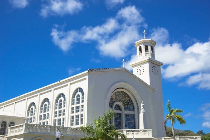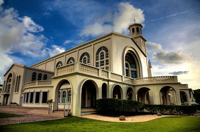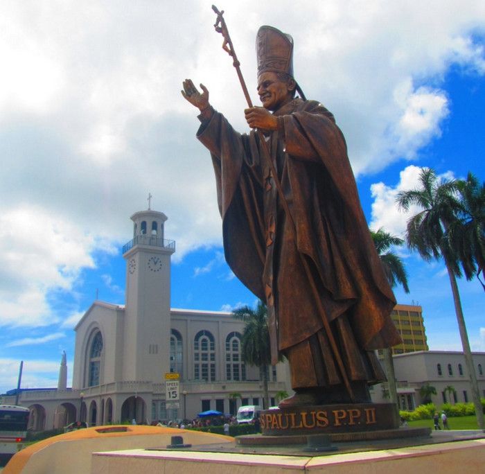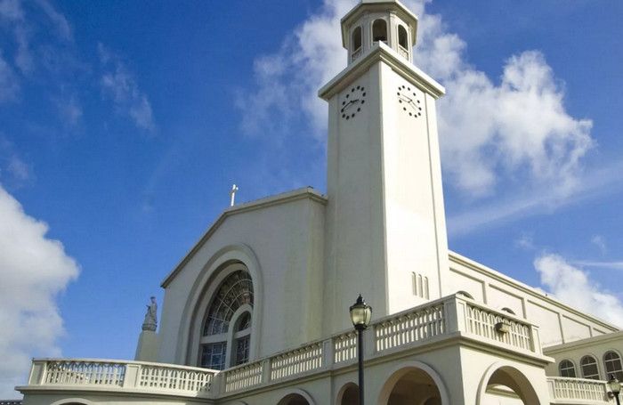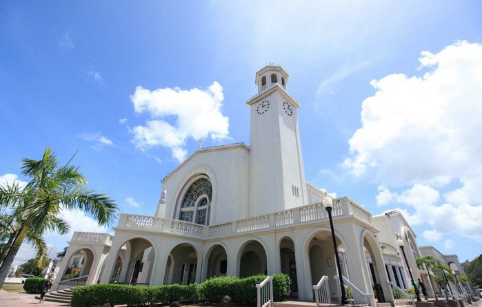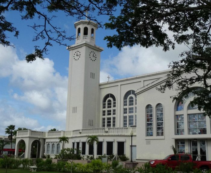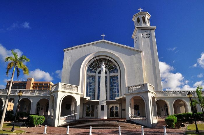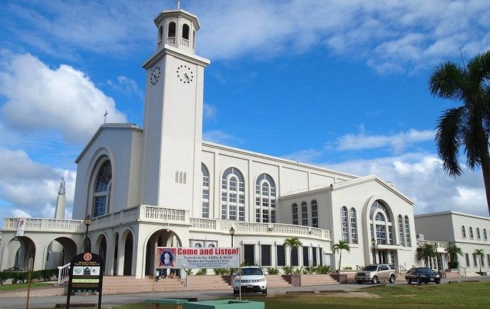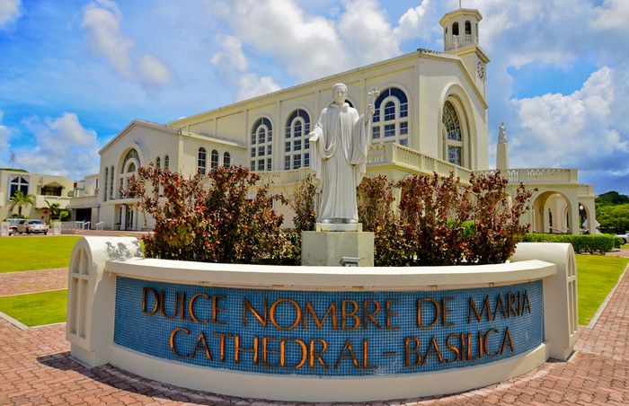 Собор Сладчайшего Имени Марии - кафедральный собор Архиепархии Аганьи, имеющий статус Малой базилики, присвоенный ему в 1965 году Папой Римским Павлом VI. Собор расположен в историческом центре города Хагатна, на восточной стороне площади Испании. Нынешнее здание Собора Сладчайшего Имени Марии стоит на месте первой католической церкви на Гуаме, построенной в 1669 году испанским священником Диего Луисом де Сан-Виторесом при содействии коренных жителей острова - индейцев племени чаморро, которых испанские колонисты массово обращали в христианство. Королева Испании Мария Анна Пфальц-Нейбургская лично пожертвовала на строительство часовни 300 песо, а глава острова Гуам Кепуха (вождь народа чаморро) подарил католическому приходу землю для строительство храма. Освящённая 2 февраля 1669 года церковь представляла собой деревянную часовню, вокруг которой со временем были построены административные здания, в том числе и Губернаторский дворец. В 1670 году часовня была перестроена - снаружи стены здания были выложены плитами из кораллов, внутренние стены церкви, потолок и полы остались деревянными, только теперь они были выполнены из мербау - ценной древесины дерева Ифит (Intsia bijuga), эндемика острова Гуам. На задней стене храма была размещена фреска с изображением Успения Пресвятой Девы Марии. Эта церковь была разрушена во время бомбардировок острова в годы Второй мировой войны. Современный собор на её месте был построен в 1959 году, фасад белоснежного храма с высокой колокольней украшают аркадная галерея с ажурной балюстрадой и большие витражные окна. Перед центральным входом установлена статуя Святой Марии Камален (Пресвятой Богородицы Камарин), которая почитается как покровительница Гуама. Её изображение, выполненное из дерева и слоновой кости, размещено в алтаре собора. Этот образ Пресвятой Богородицы Камарин был привезен испанцами на остров Гуам в 1690 году. На витражах, украшающих окна храма, изображены сцены из Святого писания и лики святых. 2 февраля 1881 года Собор Сладчайшего Имени Марии посетил Римский Папа Иоанн Павел II, в память об этом событии перед храмом установлена его бронзовая статуя. Фигура Иоанна Павла II стоит на вращающемся постаменте, каждые 12 часов она совершает полный оборот вокруг своей оси.