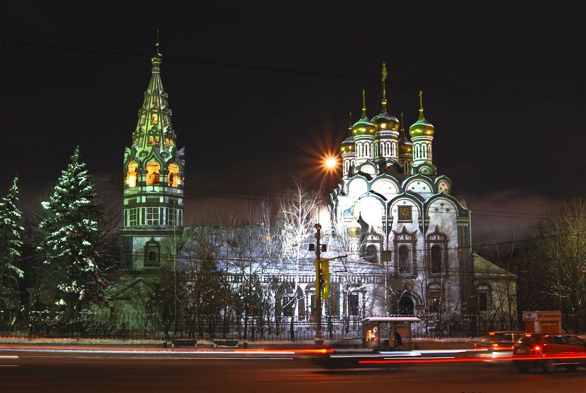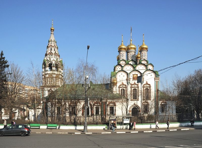 Именно жители Хамовнической слободы построили этот необычный по окраске храм декоративные детали, раскрашенные в зеленый и красный цвета на белом фоне стен, яркие вставки из цветных изразцов.
