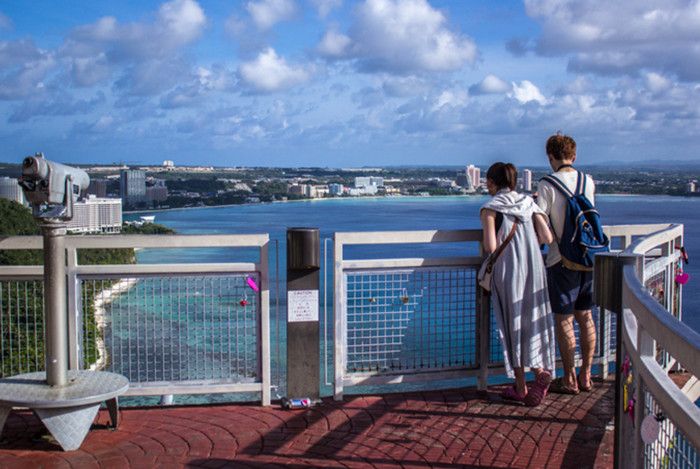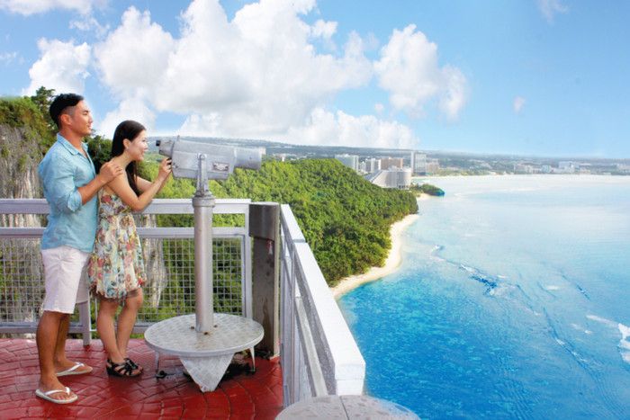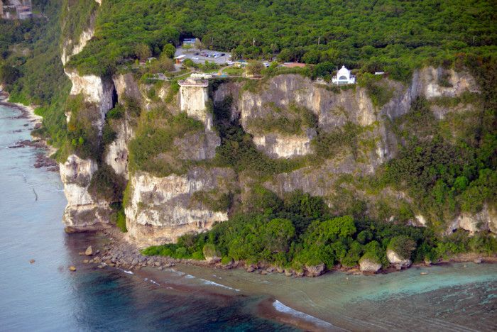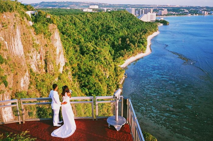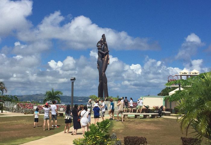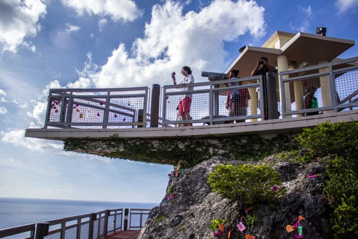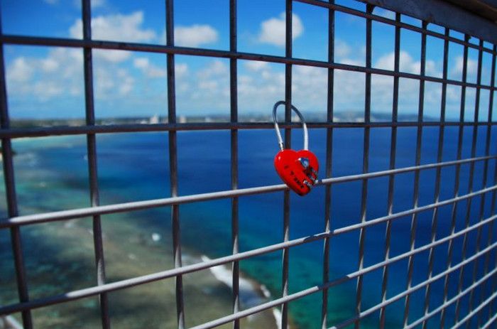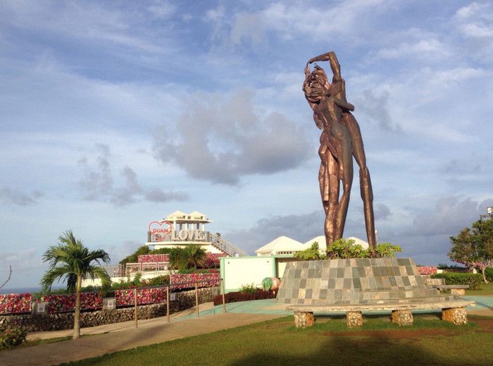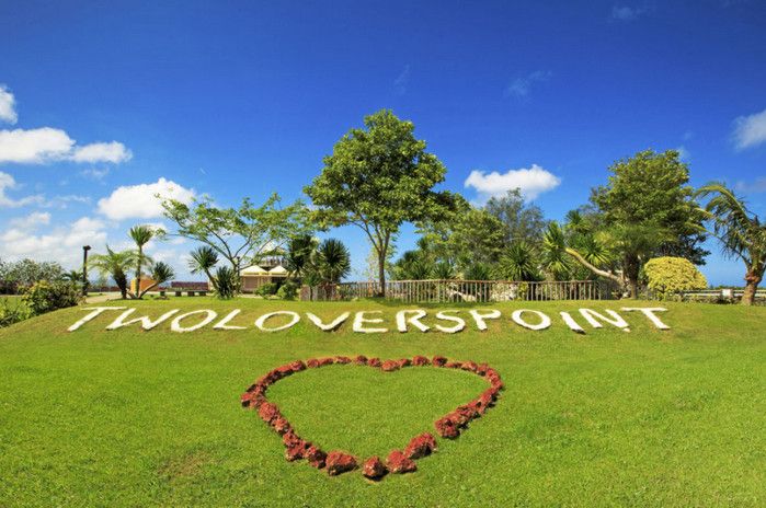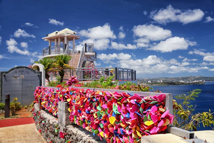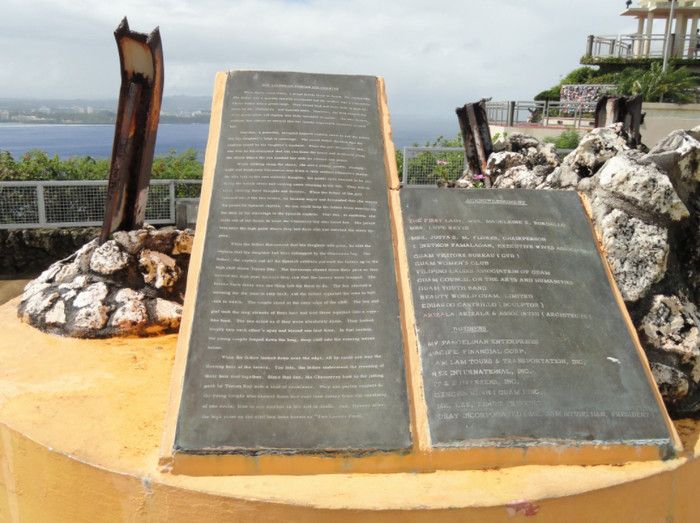 Мыс Двух Влюблённых - одна из самых известных и наиболее посещаемых достопримечательностей Гуама. Скалистый утёс, расположенный в северном конце залива Тумон, возвышается над уровнем моря на высоту 113 метров, с его вершины открываются потрясающие виды на Филиппинское море и остров Гуам, а у подножия отвесной скалы морские волны с грохотом разбиваются об огромные камни. С этой скалой связана, пожалуй, самая романтическая легенда народа чаморро (коренного населения Гуама) о трагической любви дочери богатого испанского аристократа и простого воина из индейского племени чаморро. В те времена, когда остров Гуам находился под властью Испанской короны, в столице острова, городе Аганья (Хагатна), жила богатая аристократическая семья. Глава семьи был знатным испанским дворянином, его жена - дочерью великого вождя Чаморро, а их дочь славилась красотой и благочестием. Однажды отец объявил дочери о своём решении выдать её замуж за испанского капитана, которого девушка никогда в глаза не видела. Отчаявшаяся красавица тайком убежала из дома, покинула город и, в конце концов, оказалась на уединённом берегу залива Тумон, где встретила молодого воина из племени чаморро. Молодые люди полюбили друг друга и поклялись в вечной верности. Узнав об этом, отец девушки решил выдать её замуж за испанца незамедлительно. Непокорная дочь снова сбежала к своему возлюбленному, но теперь молодых влюблённых преследовали испанские солдаты под предводительством отца девушки и несостоявшегося жениха. Погоня завершилась на высокой скале, край которой обрывом нависал над морем. Влюблённые, оказавшись в ловушке между солдатами и бездной, связали в один узел свои волосы (чтобы не расставаться и после смерти) и прыгнули с вершины утёса в море. С тех пор эту скалу стали называть Мысом Двух Влюблённых, а индейцы чаморро сложили красивую легенду о настоящей любви и верности. Сегодня на вершине скалы разбит небольшой парк, а на самом краю обрыва построена двухуровневая смотровая площадка, оборудованная телескопом. В парке установлены статуя Двум влюблённым, Любовный колокол и гранитные стелы, на которых изображены молодые парень и девушка, благодаря которым это место стало символом вечной любви. Мыс Двух Влюблённых посещают не только туристы - на вершину скалы, по традиции, поднимаются тысячи влюблённых, чтобы поклясться друг другу в вечной любви, повесить свой заветный замочек на "стену любви" возле смотровой площадки, а в последствии сыграть здесь свадьбу ( в парке специально для таких случаем построен свадебный павильон).