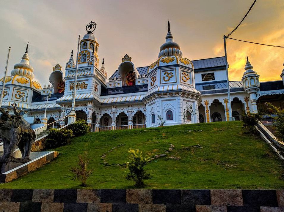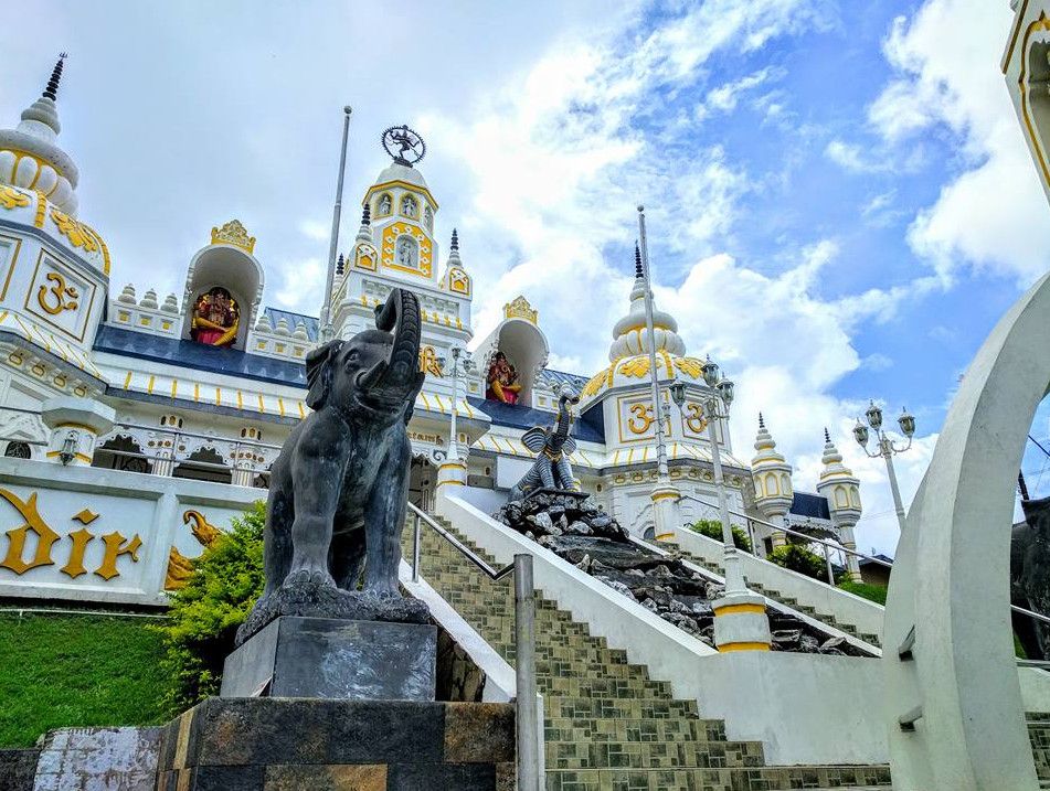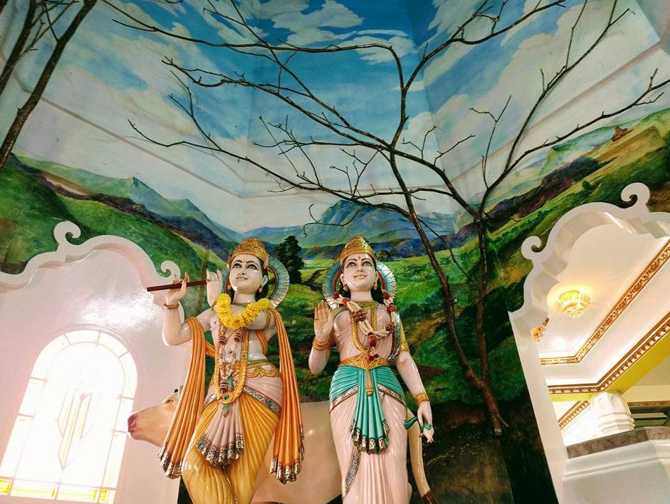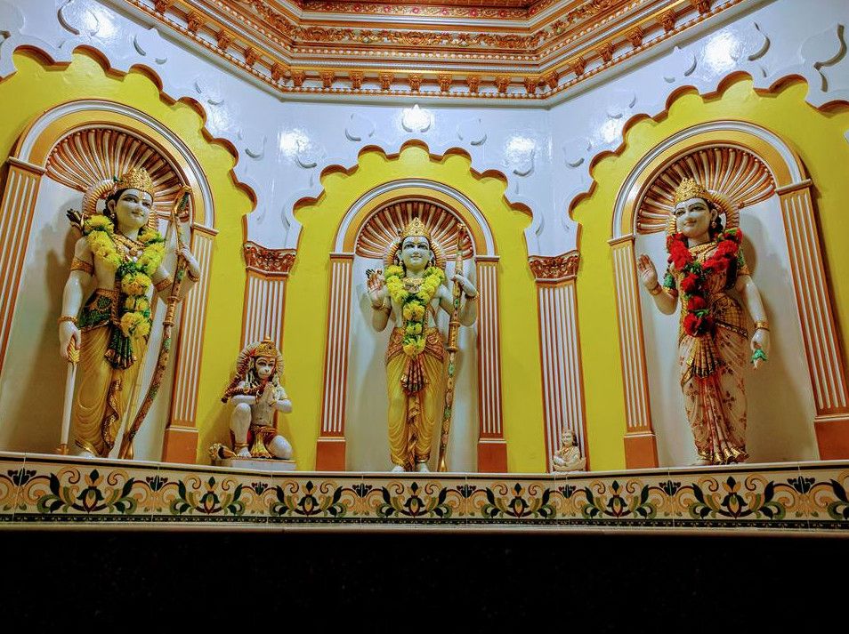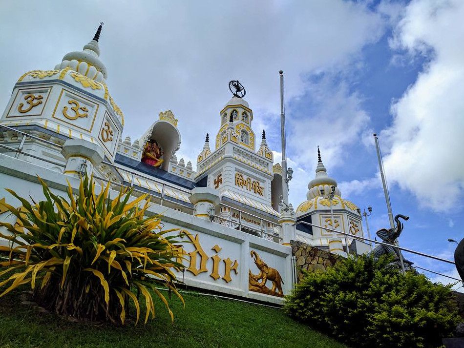 Тривени Мандир является внушительным зданием, стоящим на холме, со шпилями, достигающими неба и находящемся в окружении ухоженных лужаек. Этот большой комплекс храма действительно красив благодаря кропотливой и детальной отделке. Расположенный на Систерс Роад в деревне Хардбардгейн, Мандир иногда называют Индусским Храмом дороги Сестры. Такое название было дано Тривени Мандир, потому что это было место для собраний трех деревень: Систерс Роад, Сент Жюлиан и Даерс, и в Индии место трех встречающихся священных рек: Ганга, Джамуна и Сарасвати. Смотря на Тривени Мандир сегодня, нельзя не быть впечатленным преданностью и посвящением, которое в конечном счете привело к созданию этого великолепного комплекса. Особенно, когда Вы полагаете, что оригинальная группа была создана в 1946 году и только в 1948 году маленькая деревянная структура была установлена на участке, используя лес, который мужчины взяли от окружающего леса. В 1970 году работа над большей структурой была начата и закончена в 1974 году. В 1992 году была сделана модернизация здания и затем в 2001 весь комплекс был восстановлен с кропотливой работой, которая закончилась в 2003 году.