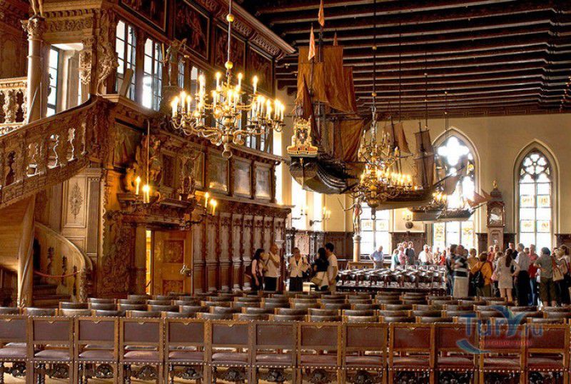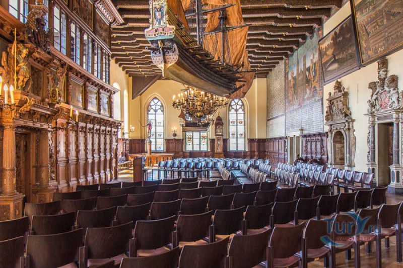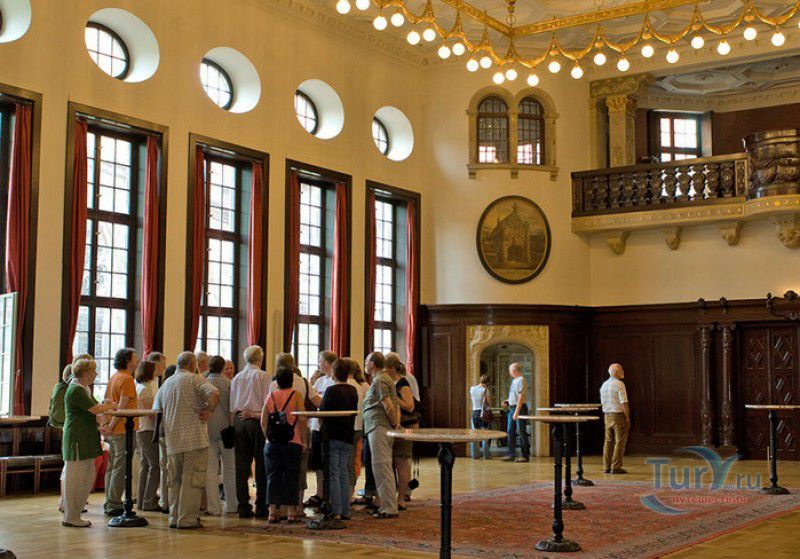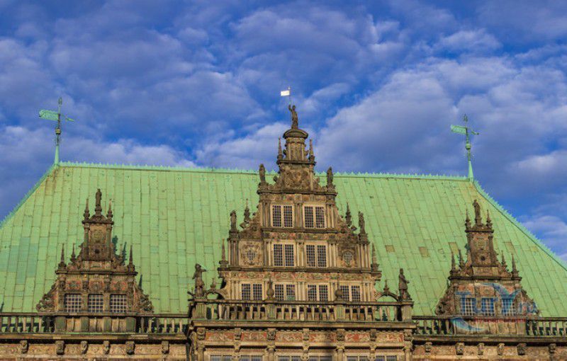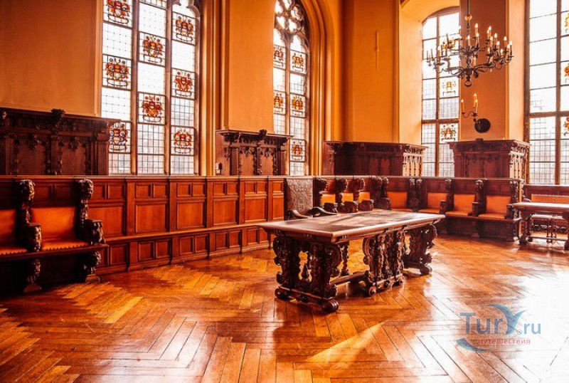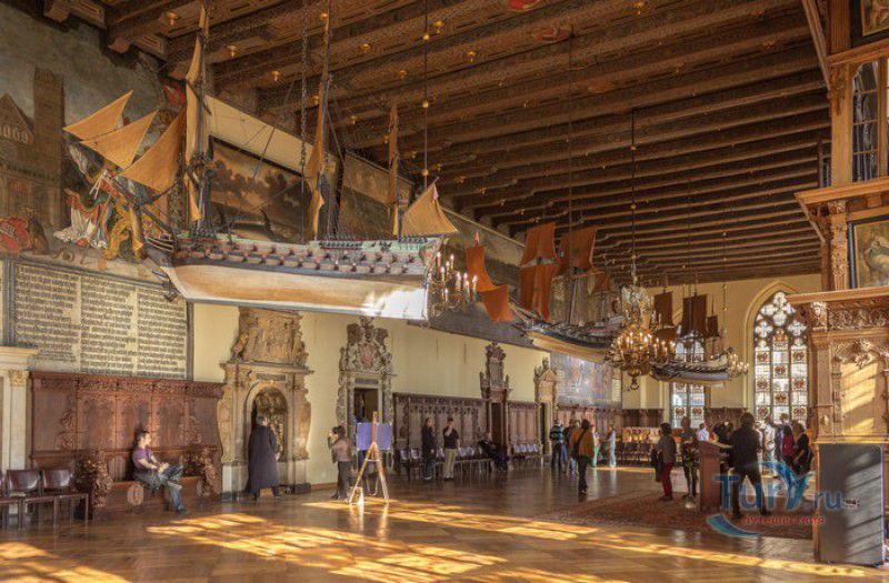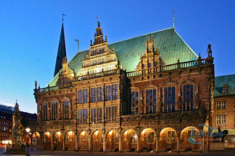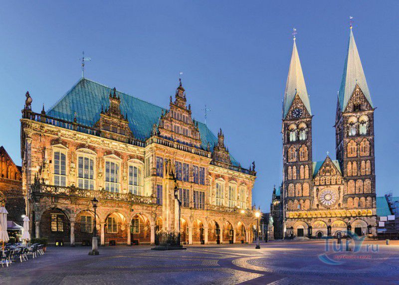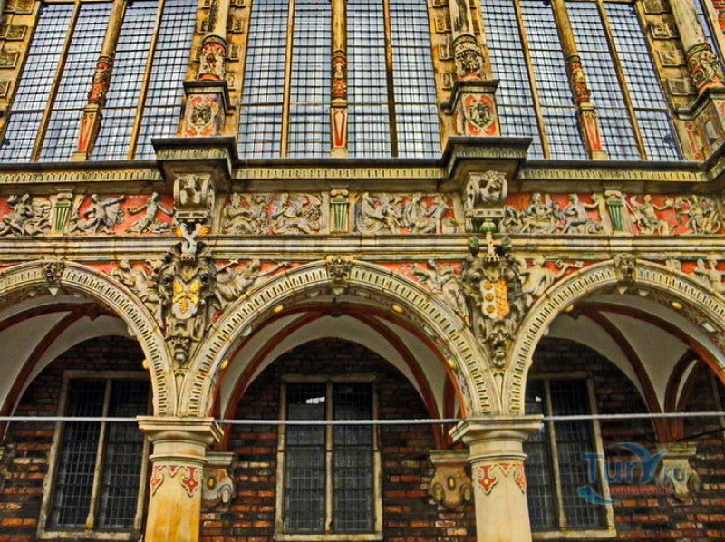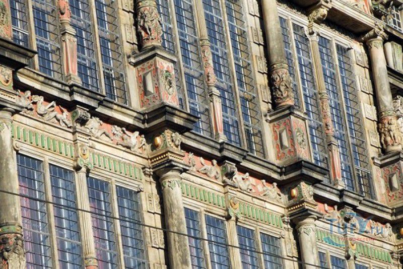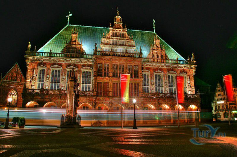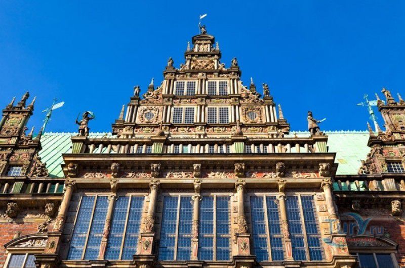 Бременская Ратуша - символ немецкого города Бремен, расположена в самом центре города, на Рыночной площади, рядом с Кафедральным собором. Здание городской ратуши Бремена признано шедевром кирпичной готики и ярким примером "везерского ренессанса" - архитектурного стиля, объединившего в себе черты итальянского и западноевропейского Возрождения. Ратуша была построена в 1405-1409 годах как символ свободы и независимости вольного имперского города Бремен, вошедшего в состав Ганзейского союза, вышедшего из-под власти архиепископа Бремена и достигшего к началу XV века своего наибольшего расцвета. Первоначально здание ратуши было построено в стиле кирпичной готики и представляло собой двухэтажное здание с двумя большими залами - Нижним и Верхним, и несколькими отдельными кабинетами в северной части здания. У стен ратуши были установлены статуи императоров и курфюрстов, пророков и древних философов. В таком виде здание просуществовало до конца XVI столетия, пока напротив него купеческая гильдия Бремена не построила на свои деньги здание торговой палаты (Schütting), затмившее своим великолепием Бременскую ратушу. Городской совет Бремена посчитал, что скромный облик готической ратуши более не соответствует её представительским целям и принял решение о перестройке здания в стиле "везерского ренессанса", которая и была проведена в 1608-1612 годах под руководством архитектора Людера фон Бентхайма. Средняя часть здания была снесена, а на её месте появился стеклянный эркер, увенчанный фламандским фронтоном. Окна здания были значительно увеличены в размере, фасад украшен рельефами, декоративными фризами и скульптурными изображениями людей, ангелов и мифических животных, выполненными нидерландскими скульпторами Гансом Вредеманом де Врисом, Хендриком Гольциусом и Якобом Флорисом. Нижний ярус центрального фасада ратуши украсила галерея из одиннадцати полукруглых арок, богато украшенных декоративными элементами, у главного входы в здание были установлены конные статуи рыцарей в средневековых доспехах. В начале XX века к Бременской ратуши было пристроено здание Новой ратуши в стиле неоренессанса, автором проекта которого является архитектор Габриэль фон Зайдль. Зодчему удалось гармонично соединить в одно целое оба здания - при том, что новое здание почти в два раза больше старого, Новая ратуша не доминирует над старой частью, а подчёркивает своим более скромным фасадом его красоту и величие. На втором этаже ратуши расположен Верхний зал - зал, в котором на протяжении столетий собирался Городской совет Бремена, принимались законы и устраивались приёмы в честь иностранных послов. В наши дни здесь проводятся концерты и торжественные приёмы. Резной деревянный потолок зала украшен портретами германских императоров, на стенах - фрески, выполненные в XVI веке кёльнским художником Бартоломеусом Брейном, на которых изображены основатели Бремена - император Карл Великий и епископ Виллегад. В Верхнем зале также можно увидеть макеты кораблей XVI-XVIII веков, вошедших в историю торгового флота Бремена. Зал сената - зал в котором каждый вторник за большим овальным столом проходят заседания Городского совета Бремена. Его стены покрыты красно-коричневыми шёлковыми обоями, на потолке - лепнина и огромные хрустальные люстры, пол устилает огромный ковер с вы