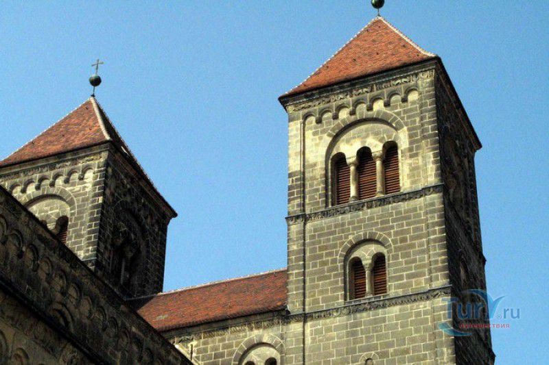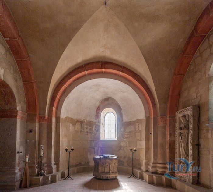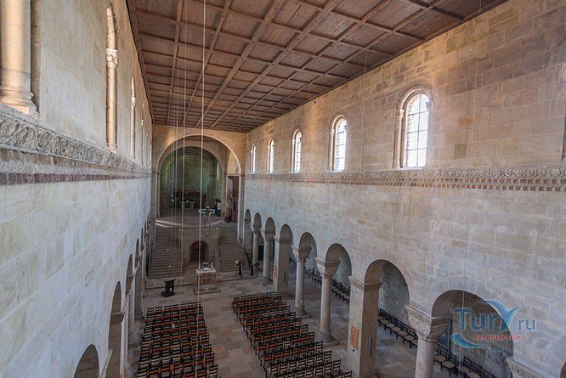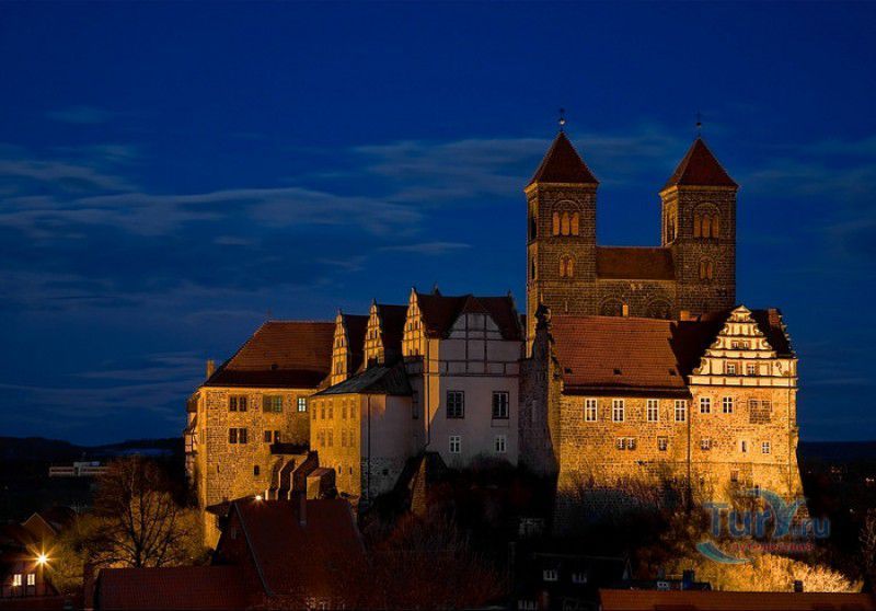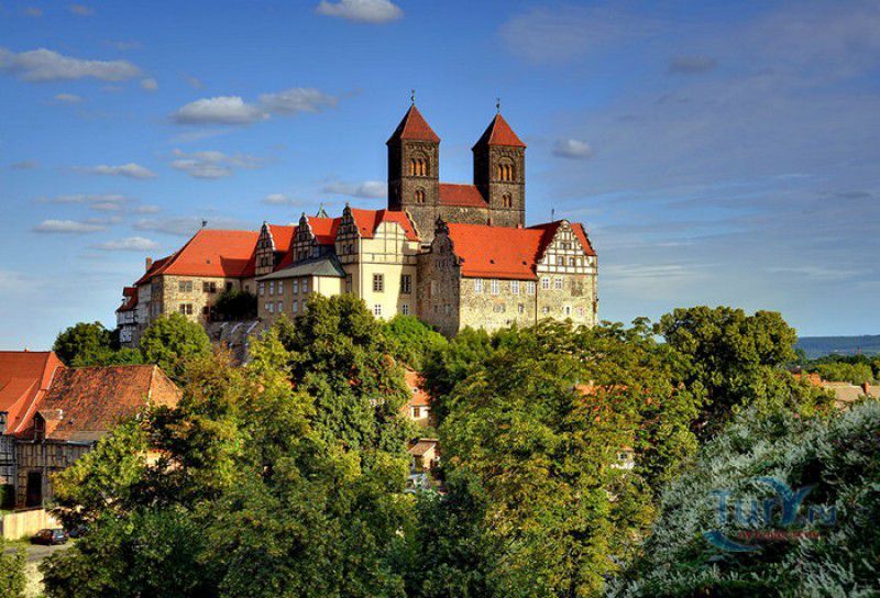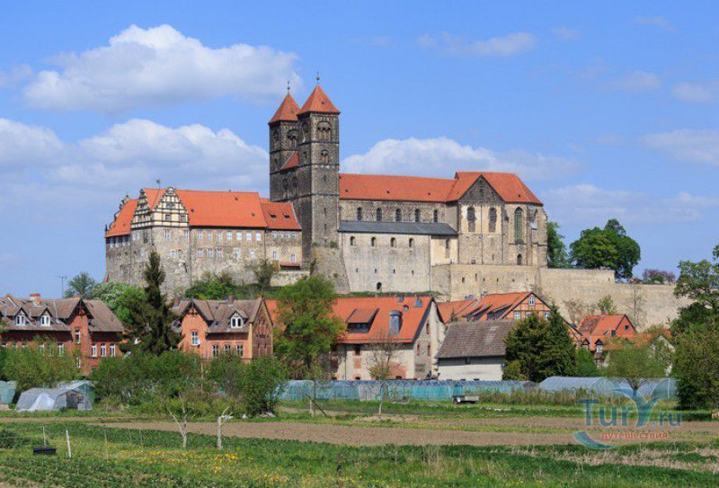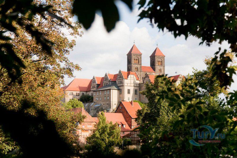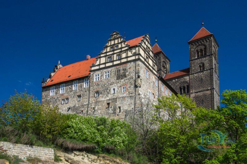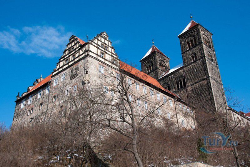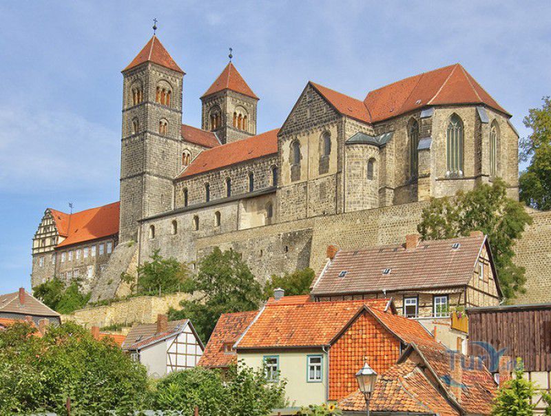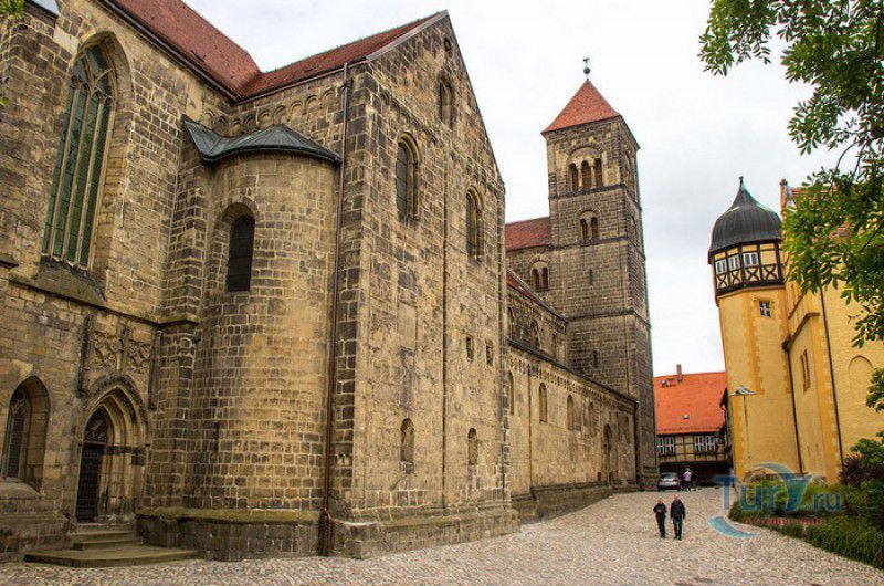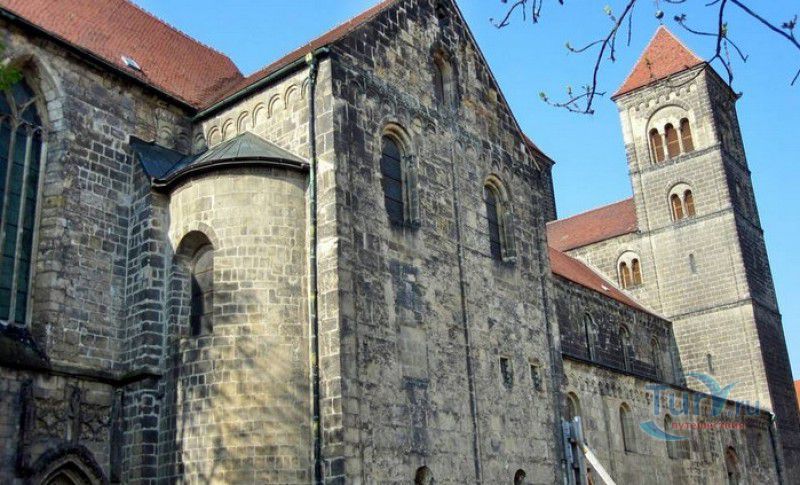 Монастырская Церковь Святого Серватия в Кведлинбурге - романская церковь бывшего Кведлинбургского аббатства, основанного в 936 году Оттоном I Великим по просьбе своей матери, королевы Матильды, второй жены первого германского короля Генриха I Птицелова. Монастырь был построен на территории замка, возведенного Генрихом I на вершине Замковой горы Кведлинбурга. В средние века Кведлинбургское аббатство (Вольное светское Имперское аббатство в Кведлинбурге) считалось одним из самых больших и влиятельных в Священной Римской империи. Монастырём и городом, возникшим у подножия Замковой горы, управляла аббатиса, которой могла стать только одна из дочерей царствующей королевской семьи. Светский статус настоятельницы монастыря приравнивался к статусу княгини Священной Римской империи, по церковной иерархии аббатиса была выведена из подчинения главы своей епархии и подчинялась напрямую римскому папе. На месте небольшой замковой часовни, в которой в были похоронены король Генрих I и королева Матильда, в конце X века было начато строительство большой монастырской церкви, более соответствующей престижу Кведлинбургского аббатства. Возведение церкви (трёхневной базилики в романском стиле) было завершено в 1021 году, 21 сентября 1021 года она была освящена в честь Святых Серватия Маастрихтского и Дионисия Парижского. На церемонии освящения присутствовал император Генрих II. В 1070 году в церкви вспыхнул пожар, практически уничтоживший здание. Реконструкция церкви длилась почти шесть десятилетий, и в 1129 году, в присутствии императора Лотаря III, восстановленная в своем первоначальном виде базилика была вновь освящена. В 1320 году, при аббатисе Ютте фон Кранихфельд, восточный хор был перестроен в готическом стиле (в 1938-1940 годах заменен на неороманский), а в в 1863-1882 годах к нему были пристроены две неороманские башни с острыми шпилями, которые в 1946 году заменили на невысокие шатровые крыши. Здание Коллегиатской церкви впечатляет своими размерами, декоративным оформлением фасадов и богатым внутренним убранством. Неф церкви разделен на проходы аркадами из колонн, второй этаж по периметру опоясывает крытая галерея, фризы, капители и импосты (карнизы над пилястрами) колонн внутри церкви украшены скульптурным декором (в орнаменте преобладают растительные и анималистические мотивы). От романской архитектуры в церкви сохранились главный вход на северной стене фасада и крипта, в которой находятся гробницы короля Генриха I и Святой Матильды, а также романские и готические скульптурные надгробия аббатис монастыря, в том числе Матильды - дочери Оттона I, Адельгейды I - сестры Оттона III и Беатрикс I - дочери Генриха III. Своды нефа и крипты украшает хорошо сохранившаяся до наших дней потолочная роспись, датируемая началом XII века. К алтарной части церкви пристроена монастырская сокровищница, в которой хранятся дары представителей Оттоновской династии Кведлинбургскому аббатству (сокровищница считается богатейшей в Германии). В годы Второй мировой войны сокровища монастыря были спрятаны в глубокой штольне, расположенной на окраине города. Но в 1945 году клад был обнаружен лейтенантом американской армии Джо Томом Мидором - бесценные реликвии были вывезены в США и только в 1987 году возвращены в сокровищницу Кведлинбургского аббатства. Среди раритетов, хранящи