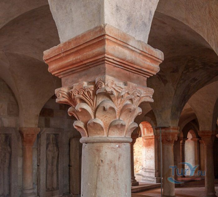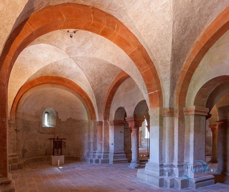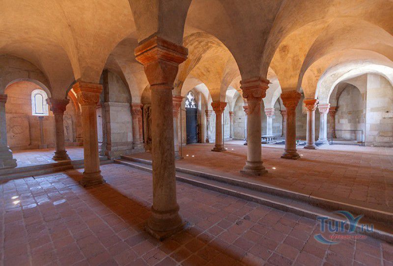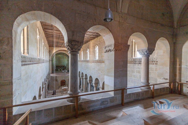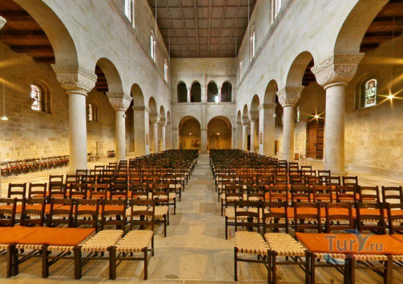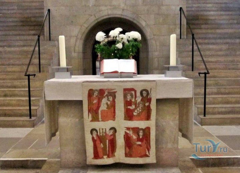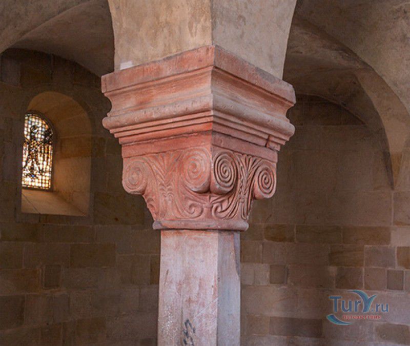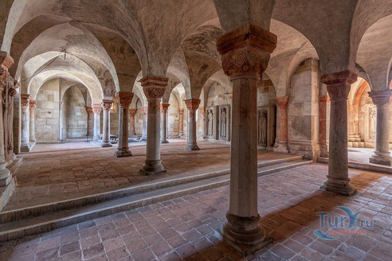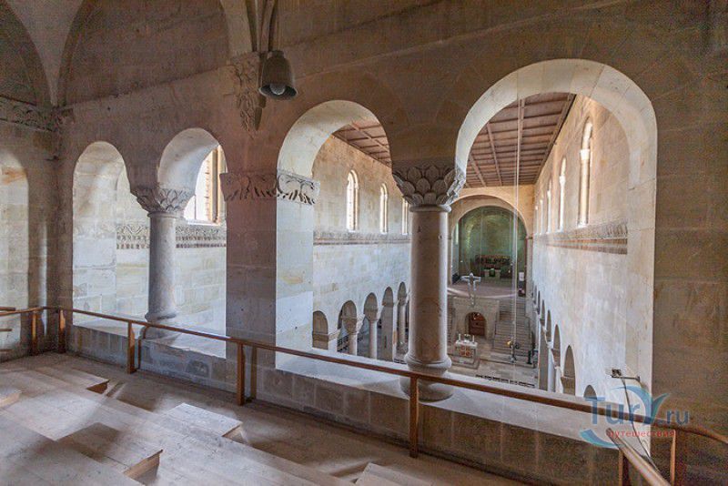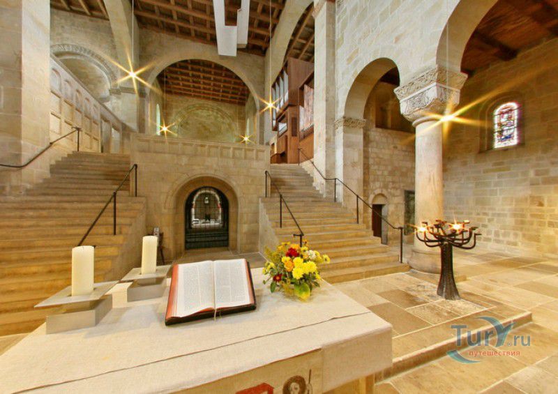 Монастырская Церковь Святого Серватия в Кведлинбурге - романская церковь бывшего Кведлинбургского аббатства, основанного в 936 году Оттоном I Великим по просьбе своей матери, королевы Матильды, второй жены первого германского короля Генриха I Птицелова. Монастырь был построен на территории замка, возведенного Генрихом I на вершине Замковой горы Кведлинбурга. В средние века Кведлинбургское аббатство (Вольное светское Имперское аббатство в Кведлинбурге) считалось одним из самых больших и влиятельных в Священной Римской империи. Монастырём и городом, возникшим у подножия Замковой горы, управляла аббатиса, которой могла стать только одна из дочерей царствующей королевской семьи. Светский статус настоятельницы монастыря приравнивался к статусу княгини Священной Римской империи, по церковной иерархии аббатиса была выведена из подчинения главы своей епархии и подчинялась напрямую римскому папе. На месте небольшой замковой часовни, в которой в были похоронены король Генрих I и королева Матильда, в конце X века было начато строительство большой монастырской церкви, более соответствующей престижу Кведлинбургского аббатства. Возведение церкви (трёхневной базилики в романском стиле) было завершено в 1021 году, 21 сентября 1021 года она была освящена в честь Святых Серватия Маастрихтского и Дионисия Парижского. На церемонии освящения присутствовал император Генрих II. В 1070 году в церкви вспыхнул пожар, практически уничтоживший здание. Реконструкция церкви длилась почти шесть десятилетий, и в 1129 году, в присутствии императора Лотаря III, восстановленная в своем первоначальном виде базилика была вновь освящена. В 1320 году, при аббатисе Ютте фон Кранихфельд, восточный хор был перестроен в готическом стиле (в 1938-1940 годах заменен на неороманский), а в в 1863-1882 годах к нему были пристроены две неороманские башни с острыми шпилями, которые в 1946 году заменили на невысокие шатровые крыши. Здание Коллегиатской церкви впечатляет своими размерами, декоративным оформлением фасадов и богатым внутренним убранством. Неф церкви разделен на проходы аркадами из колонн, второй этаж по периметру опоясывает крытая галерея, фризы, капители и импосты (карнизы над пилястрами) колонн внутри церкви украшены скульптурным декором (в орнаменте преобладают растительные и анималистические мотивы). От романской архитектуры в церкви сохранились главный вход на северной стене фасада и крипта, в которой находятся гробницы короля Генриха I и Святой Матильды, а также романские и готические скульптурные надгробия аббатис монастыря, в том числе Матильды - дочери Оттона I, Адельгейды I - сестры Оттона III и Беатрикс I - дочери Генриха III. Своды нефа и крипты украшает хорошо сохранившаяся до наших дней потолочная роспись, датируемая началом XII века. К алтарной части церкви пристроена монастырская сокровищница, в которой хранятся дары представителей Оттоновской династии Кведлинбургскому аббатству (сокровищница считается богатейшей в Германии). В годы Второй мировой войны сокровища монастыря были спрятаны в глубокой штольне, расположенной на окраине города. Но в 1945 году клад был обнаружен лейтенантом американской армии Джо Томом Мидором - бесценные реликвии были вывезены в США и только в 1987 году возвращены в сокровищницу Кведлинбургского аббатства. Среди раритетов, хранящи