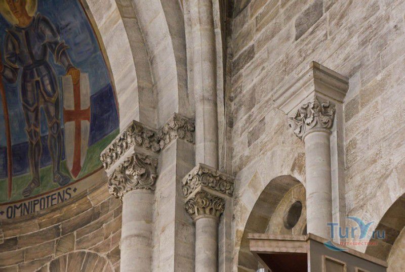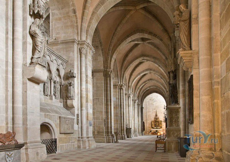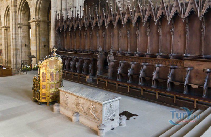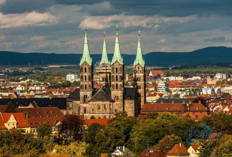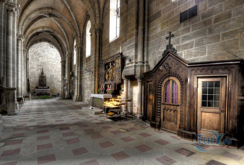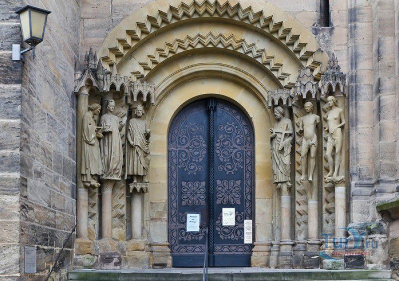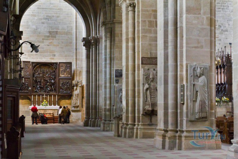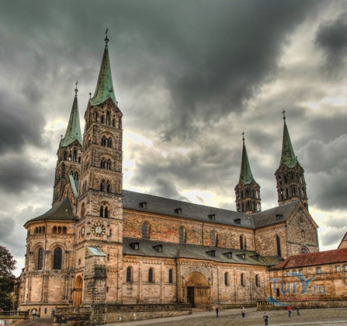 Кафедральный Собор в Бамберге (Кафедральный Собор Святого Петра и Святого Георгия в Бамберге) - один из семи имперских соборов Германии, расположен в историческом центре города Бамберг, в составе которого в 1993 году внесен в список всемирного наследия ЮНЕСКО. Возведение собора было начато в 1004 году по приказу императора Священной Римской империи Генриха II Святого. Работы велись 8 лет и завершились в 1012 году, в этом же году собор был освящён в честь Святых Петра и Григория. На церемонии присутствовали сам император Генрих II, тридцать шесть епископов и толпы простых верующих. Но уже в 1081 году первый собор был полностью уничтожен во время сильного пожара, его отстроили заново, но в 1185 году храм снова сгорел. Собор решили не восстанавливать, а строить на его месте новый. Возведение третьего по счёту собора было начато в 1215 году, а освящён он был 6 мая 1237 года. Архитектурный стиль Кафедрального собора в Бамберге представляет собой смесь позднего романского и раннего готического стилей - при строительстве нового здания использовали уцелевшие фрагменты более раннего храма, построенного в романском стиле. Собор представляет собой трёхнефную базилику с четырьмя башнями - восточными, построенными в романском стиле, и готическими - западными. Высота восточных башен - 76 метров, западных - 74 метра. Собор имеет неф с восточным и западным хорами, северный и южный трансепты, боковые капеллы и два склепа (западный и восточный). Главный вход в собор носит название Королевский портал, он расположен на северной стороне нефа. Тимпан портала украшен барельефом "Страшный суд" и статуями пророков Ветхого Завета и апостолов Нового Завета. С южной стороны находится портал Адама, который служил входом в собор для простых верующих. С правой стороны от входа размещены статуи Евы, Адама и Святого Петра, с левой - Святого Стефана, императора Генриха Святого и императрицы Кунигунды. В северо-восточной башне расположены портал Марии, в северной стене трансепта - портал Файт. Если внешний облик собора с тех времён почти не изменился, то интерьер на протяжении веков подвергался многократным перестройкам. Так, в 1648-1653 годах внутреннее убранство собора было оформлено в стиле барокко и оставалось таковым до середины XIX столетия. В 1826 году, во время своего визита в Бамберг, Людвиг I Баварский посетил собор и "пришёл в ужас" от плачевного состояния величественного храма и уродующей его художественный вид реконструкции, выполненной в стиле барокко. Монарх велел архиепископу Бамберга немедленно приступить к работам по возвращению храму его первоначального средневекового вида. Реставрационные работы велись в 1829-1837 годах под руководством архитектора Фридриха фон Гертнера. Интерьер собора богато украшен рельефами и скульптурами, великолепными алтарями, дубовые резные скамьи хора, выполненные в 1380 году, считаются шедевром готического зодчества. Одна из главных достопримечательностей собора - знаменитая скульптура "Бамбергский всадник", датируемая 1230 годом. Скульптура находится у входа в восточный хор, на северном пирсе. Статуя лошади и всадника, выполненные из песчаника, являются одним из самых известных скульптурных произведений немецкого средневекового искусства. Достоверно неизвестно чьё изображение увековечено в камне, наиболее вероятно, что всадник - это Иштва
