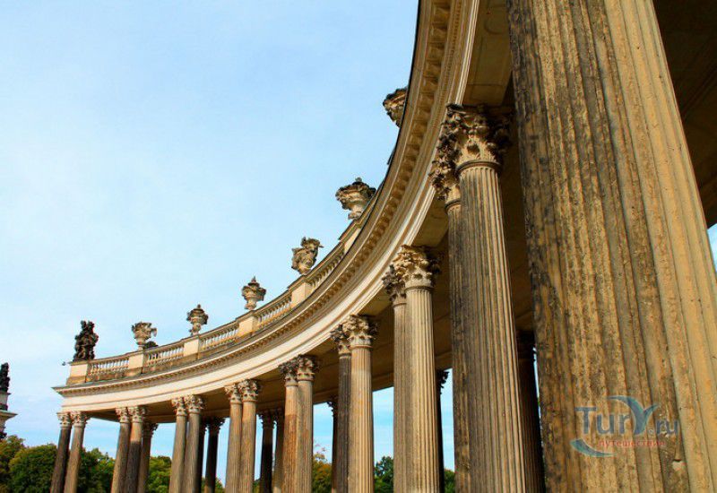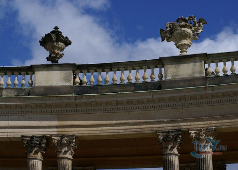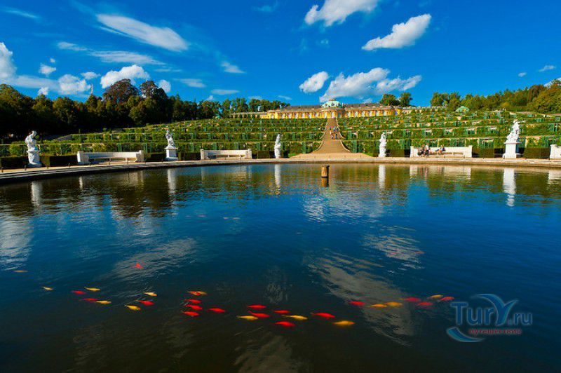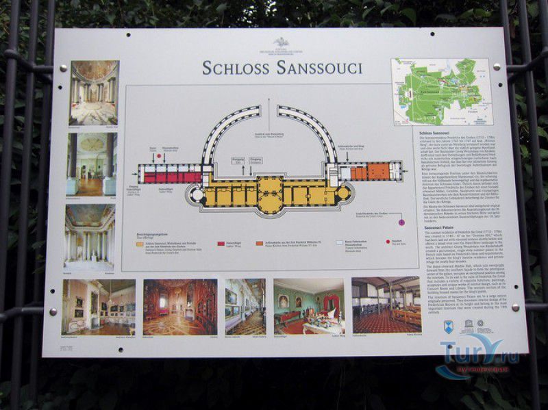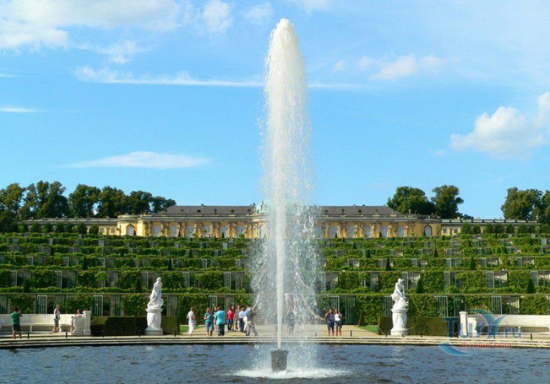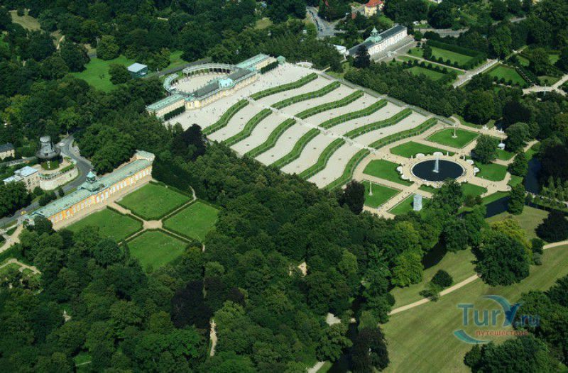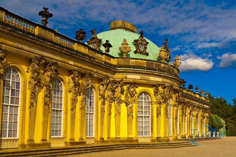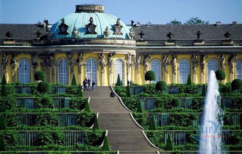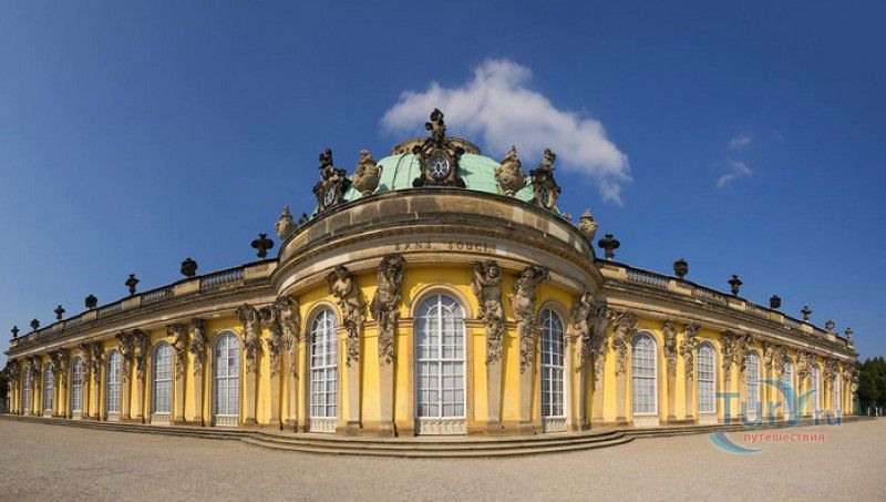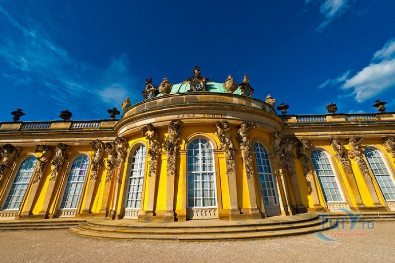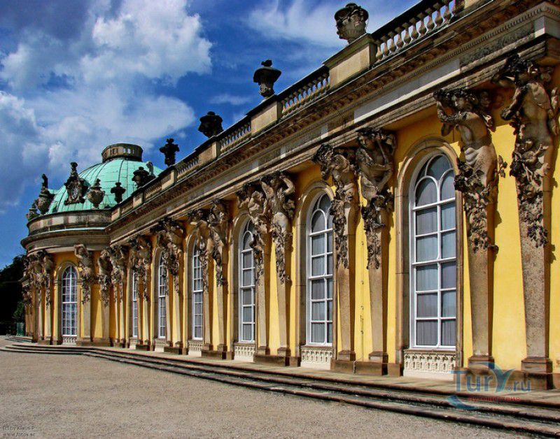 Дворец Сан-Суси - один из самых знаменитых дворцов Германии, расположен в восточной части парка Сан-Суси в Потсдаме. Некогда здесь, на южных склонах Борнштедтских холмов, росли вековые дубы, вырубленные при "короле-солдате" Фридрихе Вильгельме I для нужд армии и строящихся укреплений. Его сын и преемник, король Пруссии Фридрих II Великий, во время своей поездки в Потсдам в 1743 году, был очарован живописными видами, открывающимися с этих холмов. Монарх повелел разбить на голых холмах виноградные террасы, здесь же он начал строительство своей летней резиденции Сан-Суси (в переводе с французского - "без забот"), в которой он мог бы уединяться, философствовать, заниматься музыкой и литературой. Фридрих II принимал непосредственное участие в проектировании и строительстве дворцово-паркового комплекса. Многие эскизы были созданы им лично, ни одни работы не начинались без согласования с королём. Строительство дворца велось в 1745-1747 годах, руководить работами было поручено придворному архитектору Георгу Венцеслаусу фон Кнобельсдорфу. Сначала на склонах холма появились виноградники - на шести широких террасах была посажена виноградная лоза, специально доставленная в Потсдам из Португалии, Италии, Франции и Нейруппина. По центру холма была построена лестница из 120 ступеней (сейчас 132 ступени), разделённая на шесть пролётов, в соответствии с количеством террас. На вершине виноградного холма расположен летний дворец Сан-Суси, в местоположении и декоративном оформленим которого, по замыслу Фридриха II, была воплощена идея "гармонии между человеком и окружающей природой". Дворец построен в стиле рококо. Длинное одноэтажное здание с примыкающими к нему боковыми флигелями соответствует по длине верхней террасе. Центральная часть здания имеет полуовальную форму и увенчана куполом. Дворец буквально "насыщен" светом, который проникает во внутренние помещения через большие окна и стеклянные двери. Фасад, обращённый к винограднику, украшен скульптурами, выполненными в виде атлантов и кариатид, поддерживающих крышу. С противоположной стороны вдоль фасада установлены статуи вакхов и менад, а также декоративные вазы, изготовленные в мастерской скульптора Фридриха Кристиана Глуме. Парадный двор резиденции окружает полукругом колоннада, которая доходит до подъездной рампы, обустроенной у подножия холма. Внутренняя планировка дворца выполнена по принципу французского загородного дома с анфиладой комнат, расположенных на одном уровне, что позволяло прямо из помещений дворца попасть в сад. Центральное место во дворце занимают вестибюль и Мраморный зал, к западу от которого разместились пять гостевых комнат, к востоку - королевские апартаменты, состоящие из зала Аудиенций, Концертного зала, кабинета, спальни, библиотеки и длинной галереи на северной стороне. Вестибюль оформлен в стиле "изысканной элегантности", на фоне которой выделяется пышная роспись потолка, выполненная шведским художником Георгом Францем Эбенхехом. Парадный овальный Мраморный зал с куполообразным потолком, богато украшенным позолоченной лепниной, и большим потолочным окном, напоминает римский Пантеон. Парные колонны и мозаика пола выполнены из каррарского и силезского мрамора, в нишах установлены статуи Венеры Урании и Аполлона. Стены зала Аудиенций украшены полотнами