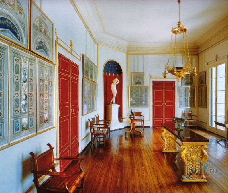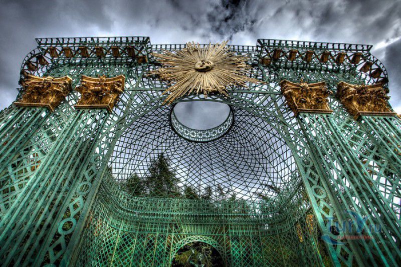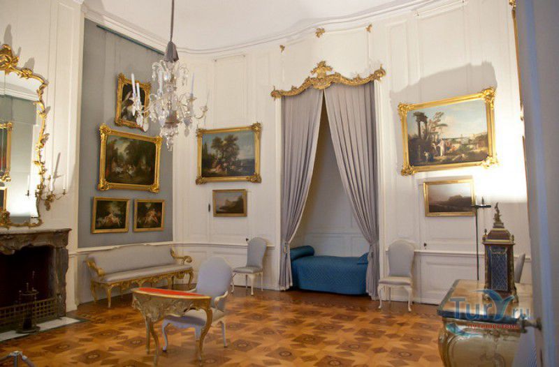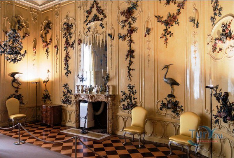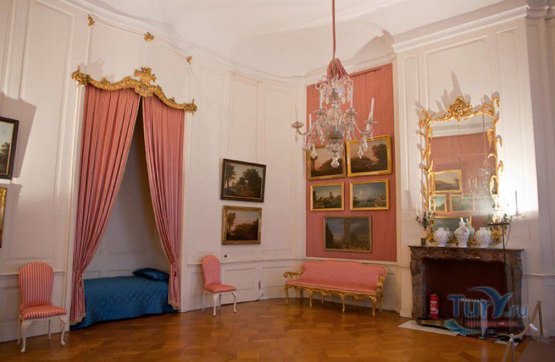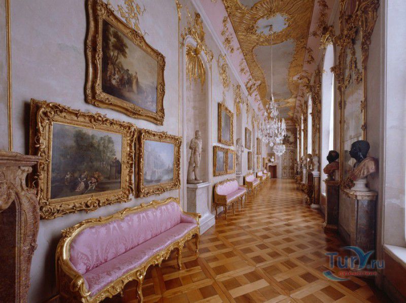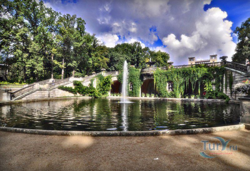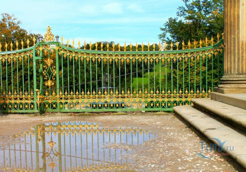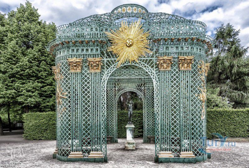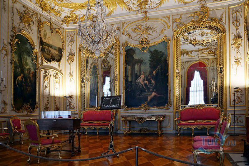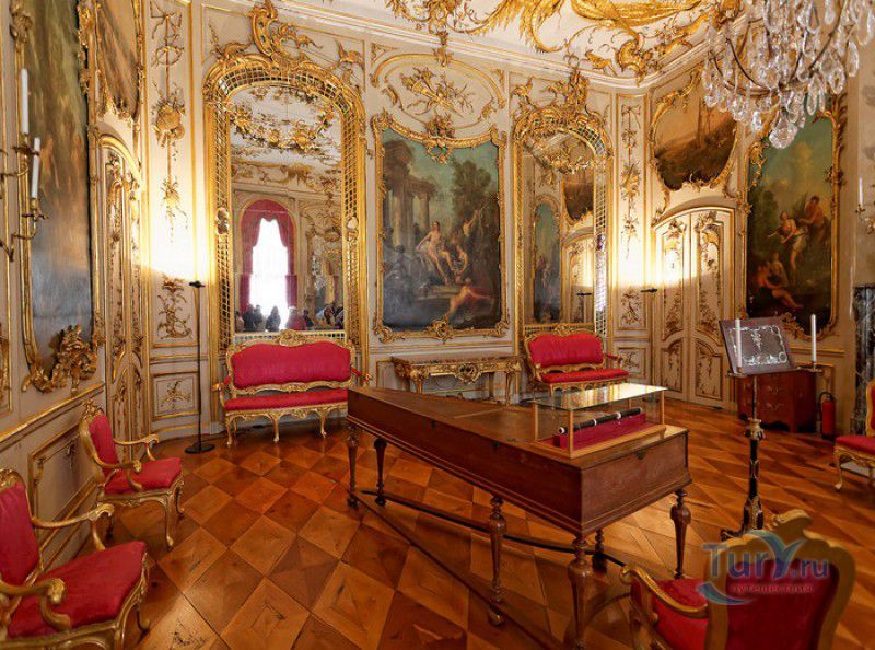 Дворец Сан-Суси - один из самых знаменитых дворцов Германии, расположен в восточной части парка Сан-Суси в Потсдаме. Некогда здесь, на южных склонах Борнштедтских холмов, росли вековые дубы, вырубленные при "короле-солдате" Фридрихе Вильгельме I для нужд армии и строящихся укреплений. Его сын и преемник, король Пруссии Фридрих II Великий, во время своей поездки в Потсдам в 1743 году, был очарован живописными видами, открывающимися с этих холмов. Монарх повелел разбить на голых холмах виноградные террасы, здесь же он начал строительство своей летней резиденции Сан-Суси (в переводе с французского - "без забот"), в которой он мог бы уединяться, философствовать, заниматься музыкой и литературой. Фридрих II принимал непосредственное участие в проектировании и строительстве дворцово-паркового комплекса. Многие эскизы были созданы им лично, ни одни работы не начинались без согласования с королём. Строительство дворца велось в 1745-1747 годах, руководить работами было поручено придворному архитектору Георгу Венцеслаусу фон Кнобельсдорфу. Сначала на склонах холма появились виноградники - на шести широких террасах была посажена виноградная лоза, специально доставленная в Потсдам из Португалии, Италии, Франции и Нейруппина. По центру холма была построена лестница из 120 ступеней (сейчас 132 ступени), разделённая на шесть пролётов, в соответствии с количеством террас. На вершине виноградного холма расположен летний дворец Сан-Суси, в местоположении и декоративном оформленим которого, по замыслу Фридриха II, была воплощена идея "гармонии между человеком и окружающей природой". Дворец построен в стиле рококо. Длинное одноэтажное здание с примыкающими к нему боковыми флигелями соответствует по длине верхней террасе. Центральная часть здания имеет полуовальную форму и увенчана куполом. Дворец буквально "насыщен" светом, который проникает во внутренние помещения через большие окна и стеклянные двери. Фасад, обращённый к винограднику, украшен скульптурами, выполненными в виде атлантов и кариатид, поддерживающих крышу. С противоположной стороны вдоль фасада установлены статуи вакхов и менад, а также декоративные вазы, изготовленные в мастерской скульптора Фридриха Кристиана Глуме. Парадный двор резиденции окружает полукругом колоннада, которая доходит до подъездной рампы, обустроенной у подножия холма. Внутренняя планировка дворца выполнена по принципу французского загородного дома с анфиладой комнат, расположенных на одном уровне, что позволяло прямо из помещений дворца попасть в сад. Центральное место во дворце занимают вестибюль и Мраморный зал, к западу от которого разместились пять гостевых комнат, к востоку - королевские апартаменты, состоящие из зала Аудиенций, Концертного зала, кабинета, спальни, библиотеки и длинной галереи на северной стороне. Вестибюль оформлен в стиле "изысканной элегантности", на фоне которой выделяется пышная роспись потолка, выполненная шведским художником Георгом Францем Эбенхехом. Парадный овальный Мраморный зал с куполообразным потолком, богато украшенным позолоченной лепниной, и большим потолочным окном, напоминает римский Пантеон. Парные колонны и мозаика пола выполнены из каррарского и силезского мрамора, в нишах установлены статуи Венеры Урании и Аполлона. Стены зала Аудиенций украшены полотнами