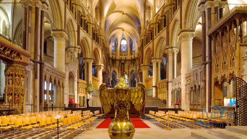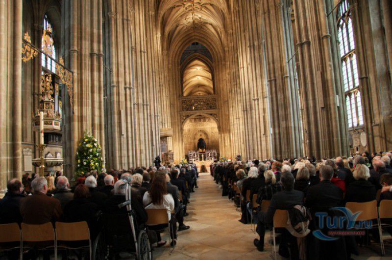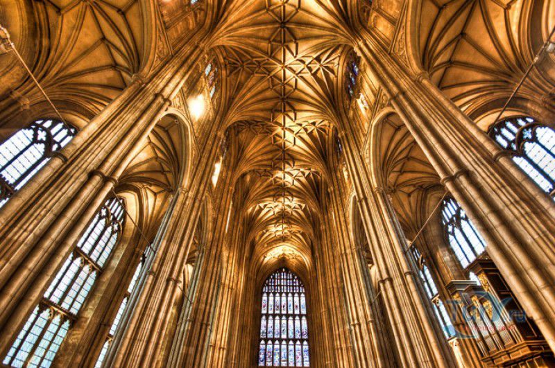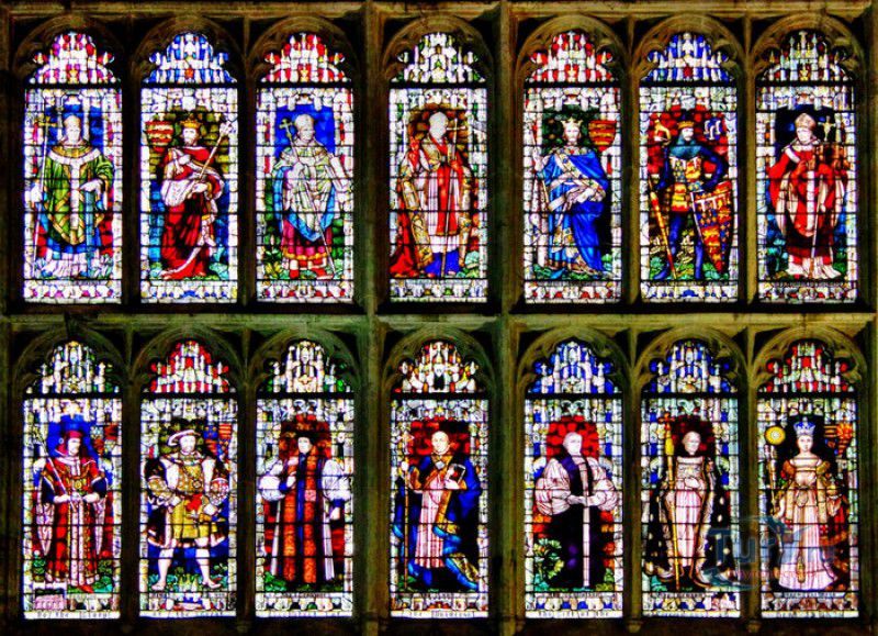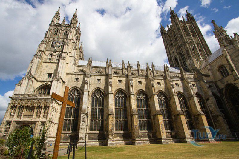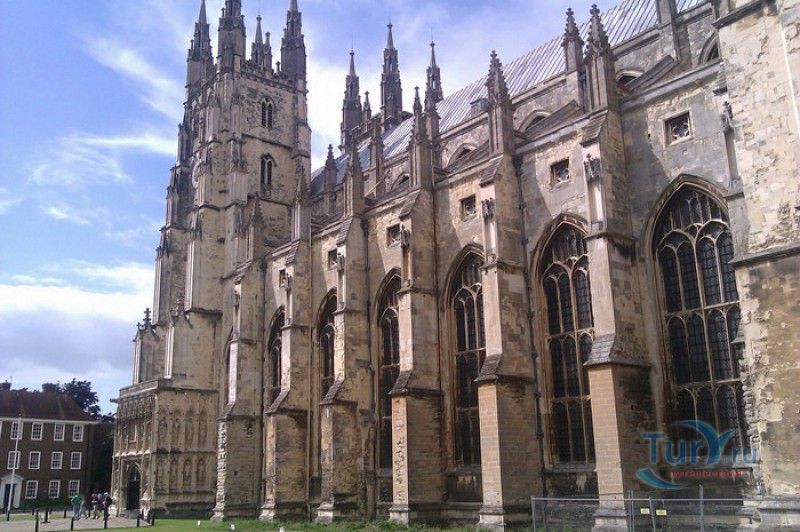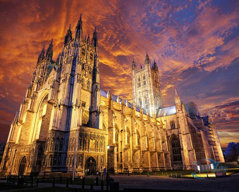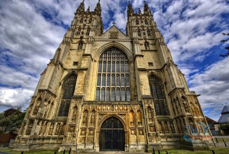 Кентерберийский Собор - главный англиканский храм Великобритании, расположен на юго-востоке Англии, в графстве Кент, в центре города Кентербери. Собор был основан в 597 году Блаженным Августином, будущим первым архиепископом Кентерберийским, прибывшим в Кент в качестве миссионера Папы римского Григория Великого. После получения разрешения поселиться в Кентербери Августину удалось склонить короля Кента Этельберта I принять христианство и крестить тысячи его подданных. Первый христианский храм, возведенный Августином в Кентербери, был освящён в честь Христа Спасителя (в 1993 году археологами был обнаружен фундамент этого строения). В 1067 году, через год после норманнского завоевания Англии, церковь была уничтожена пожаром. В 1070 году, при архиепископе Ланфранке, она была восстановлена в романском стиле и значительно расширена. Позже, при архиепископе Ансельме Кентерберийском, в церкви была построена крипта (подземное сводчатое помещение), а при архиепископе Конраде, в 1107 году, - новый хор, трансепт, три часовни и амбулаторий. С 1162 по 1170 год архиепископом Кентерберийским был Томас Бекет, убитый на ступенях алтаря собора 29 декабря 1170 года, как предполагают, по велению короля Генриха II Плантагенета. В 1173 Томас Бекет был канонизирован, а его гробница, расположенная в Кентерберийском соборе, стала местом массового паломничества. В 1174 году в соборе вспыхнул сильный пожар, почти полностью уничтоживший здание. Во время восстановления храма к нему была пристроена Троицкая капелла, в которую в 1220 году были перенесены мощи священномученика Томаса Бекета. В 1538 году, во времена английской Реформации, по приказу Генриха VIII, гробница Томаса Бекета была вскрыта, хранившиеся в ней ценности, принесенные в дар святому, были конфискованы в пользу королевской казны, мощи Томаса Бекета были сожжены, а его прах развеян по ветру (существует версия, что мощи святого были тайно перезахоронены). Сейчас на месте, где когда-то в соборе располагалась гробница Томаса Бекета, постоянно горит свеча. Нынешний свой вид Кентерберийский собор приобрёл лишь в XV веке. В это время неф храма был перестроен в стиле английской (перпендикулярной) готики, а центральная башня немного "подросла". В начале XIX столетии была разобрана находившаяся в полуразрушенном состоянии северо-западная башня, и на её месте в 1830 году построена точная копия юго-западной башни, что придало симметричность западному фасаду. Из-за большого числа перестроек, собор имеет сложную структуру, состоящую из ряда следующих друг за другом помещений, окружённых пристройками, в его архитектуре присутствуют элементы романского, раннего (украшенного) и перпендикулярного готических стилей. Длина храма составляет 160 метров. В центре собора расположена высокая Центральная башня, западный фасад венчают две менее высокие башни. Вокруг храма расположены два клуатра, монастырский садик и многочисленные подсобные помещения. Кентерберийский собор славится великолепными витражами XII-XIII веков, общая площадь витражей в соборе - 1200 квадратных метров. К большому готическому хору собора примыкают капеллы с множеством реликвий и средневековых произведений искусства. Интерьер храма украшен колоннами с капителями, лепниной, фресками, настенными и потолочными росписями, картинами и скульптурами. Самая древняя часть К