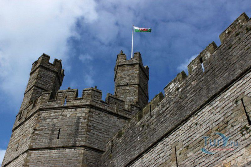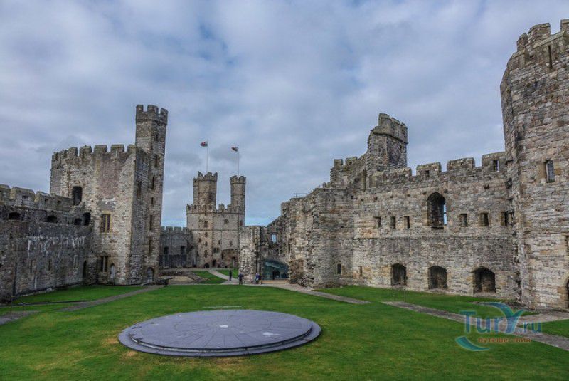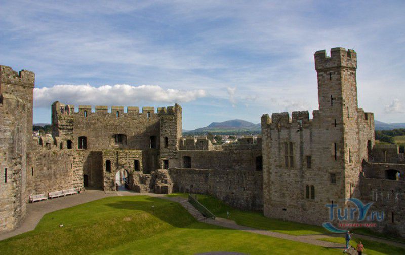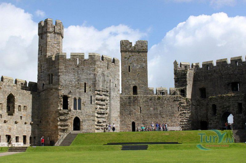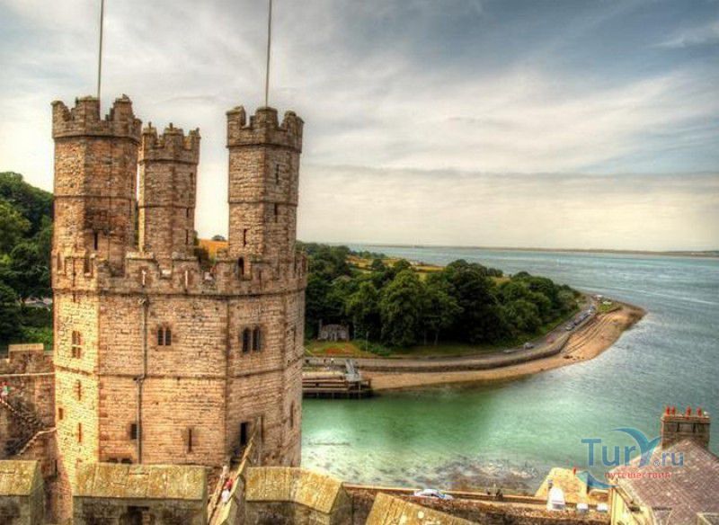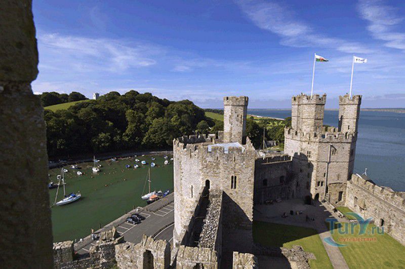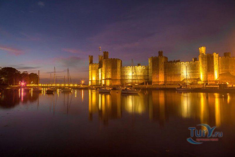 Замок Карнарвон расположен в Великобритании, в Северном Уэльсе, в городе Каернарфон. Первые фортификационные сооружения в этих местах были возведены ещё древними римлянами, а в 1083 году, после завоевания Уэльса норманнами, здесь был построен деревянный замок, окружённый высоким частоколом и земляными валами. В 1282 году весь Уэльс был завоёван английским королём Эдуардом I, и для поддержания порядка на присоединённых территориях им было начато строительство мощных замков-крепостей, которые должны были замкнуть весь Уэльс в "железное кольцо". Замку Карнарвон в этом списке отводилась главная роль, он должен был стать не только оплотом новой власти, но и форпостом, контролирующим морской путь, связывающий берега Северного и Западного Уэльса. Работы по возведению замка были начаты в 1283 году, его проектирование было поручено королевскому архитектору - мастеру Джеймсу из Сен-Джорджа. Эдуард I и его супруга, королева Элеонора Кастильская, не раз посещали Карнарвон - летом 1283 года в построенных к тому времени королевских апартаментах они провели целый месяц, а 25 апреля 1284 года в замке Карнарвон родился их четвёртый сын, будущий король Эдуард II и первый английский принц Уэльский. В этом же году Эдуард I даровал Карнарвону городские права и пожаловал статус административного центра графства Гвинед. К 1285 году было завершено строительство городских стен, примыкающих к крепости, работы же по возведению замка продолжались полным ходом - лес для его строительства привозили по морю из Ливерпуля, а камень добывали на соседнем острове Англси. Из-за больших затрат на военные кампании Эдуарда I строительство замка к 1289 году значительно замедлилось, а в 1292 году и вовсе было остановлено. В 1294 году в Уэльсе вспыхнуло восстание валлийцев под предводительством Мэдога ап Лливелина, и недостроенный замок был сравнительно легко захвачен мятежниками. К тому моменту, когда английская власть снова установилась в Карнарвоне (лето 1295 года), валлийцы успели сжечь все деревянные постройки в замке и значительно повредить каменные. Сразу после подавления восстания в замке были начаты восстановительные работы, руководить которыми был назначен новый архитектор - мастер Уолтер из Херефорда, поскольку своему главному зодчему, Джеймсу из Сен-Джорджа, король поручил строительство нового замка Бомарис. Завершено строительство замка Карнарвон было только в 1330 году, королевской казне самый большой и мощный замок в Уэльсе обошёлся примерно в 25 000 фунтов стерлингов - баснословная сумма по тем временам. Крепость со стороны моря охраняли неприступные скалы, со стороны суши - мощная оборонительная стена с девятью многогранными дозорными башнями, в числе которых - башня Камердинера, Чёрная, Орлиная башни и башня Королевы. Два главных входа в замок (ворота Короля и Королевы) были защищены барбаканами, другие защитные сооружения ворот (разводные мосты, опускающиеся решётки, многочисленные ловушки и щели-убийцы) так и не были построены. Во внутреннем дворе располагались жилые и хозяйственные помещения, на верхнем уровне - королевские апартаменты, на нижнем - кухни и склады (до наших дней от внутренних сооружений замка сохранились только фундаменты). На протяжении XIV-XVI столетий в Карнарвоне постоянно располагался хорошо вооружённый гарнизон, призванный поддерживать порядо