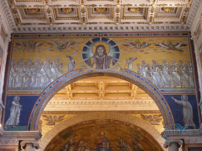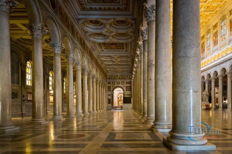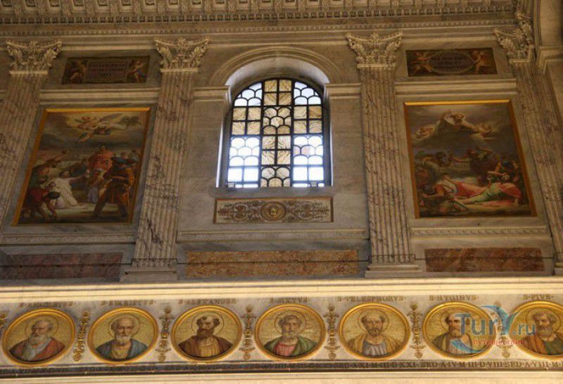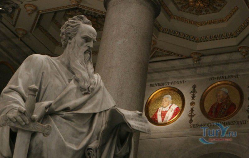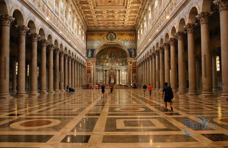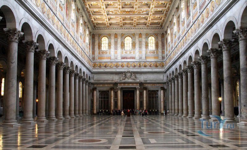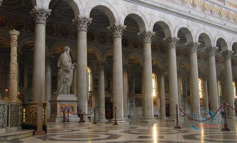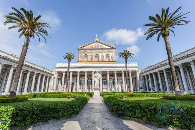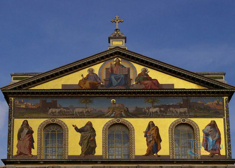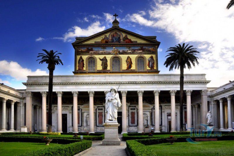 Базилика Сан Паоло Фуори Ле Мура (Базилика Святого Павла За Городскими Стенами) является одной из четырёх великих папских базилик Рима и второй по величине после собора Святого Петра в Ватикане. Она расположена в южной части Рима, за пределами городской стены Аврелиана, возведенной вокруг древнего Рима при императоре Аврелиане в III веке - отсюда и название базилики "за городскими стенами". Первая церковь на месте захоронения Апостола Павла, казнённого в 67 году по приказу императора Нерона, была построена в начале IV века императором Константином I. Вскоре эта церковь уже не могла вместить паломников, желающих поклониться мощам Святого Павла, и в 386 году, при императоре Феодосии I, на её месте начали строить новый храм с пятью нефами и трансептом. Базилика была достроена только в середине V века, при папе Льве I, и на протяжении последующих столетий неоднократно перестраивалась и расширялась - добавлялись новые часовни, её интерьер украшался мозаиками, фресками, картинами и скульптурами, в VI веке, при папе Григории Великом, в базилике был установлен алтарь над могилой Апостола Павла. В это же время рядом с храмом были возведены два монастыря - женский и мужской. В IX веке участились набеги сарацин, и папа Иоанн VIII окружил религиозный комплекс стеной с башнями, создав небольшой укреплённый город Джованниполи (Giovannipoli). Базилика Сан Паоло Фуори Ле Мура, в отличие от других папских базилик, сохраняла свой первоначальный облик на протяжении почти полутора тысячелетий, её архитектура не претерпела существенных изменений ни в эпоху Возрождения, ни во времена барокко. Но 15 июля 1823 года сильный пожар, произошедший по вине рабочих, чинивших крышу, уничтожил базилику почти до основания. Восстановление храма было начато в 1825 году, при папе Льве XII, и продолжалось до 1840 года, работами руководил архитектор Луиджи Полетти. Помощь в восстановлении храма оказывали монархи многих стран - правители Сардинии, Франции, Сицилии, Нидерландов, Египта и Российской империи (император Николай I прислал огромные блоки из малахита и лазурита для новых алтарей). В 1854 году Базилика Сан Паоло Фуори Ле Мура была повторно освящена папой Пием IX. Новая базилика сохранила первоначальную структуру, она по-прежнему состоит из пяти нефов. Длина здания составляет 132 метра, ширина - 65 метров, высота - 30 метров. Фасад храма украшен мозаикой с изображениями Иисуса Христа, апостолов Петра и Павла, пророков Исаии, Даниила, Иеремии и Иезеклииля, Святого Агнца и двенадцати ягнят, символизирующих двенадцать апостолов. В 1928 году по проекту Гульельмо Кальдерини вокруг внешнего двора храма был построен открытый портик из 150 колонн, в его центре установлена статуя Святого Павла с мечом и книгой в руках. Монументальная бронзовая дверь была установлена в 1931 году, при её изготовлении были использованы пластины из древней двери, выполненной в Константинополе в XI веке. Из интерьера базилики сохранились лишь часть апсиды и триумфальная арка, примыкающая к ней. Мозаика апсиды, выполненная в XIII веке Пьетро Каваллини, была почти полностью утрачена при пожаре, её уцелевшие фрагменты были использованы при реконструкции апсиды. Мозаики триумфальной арки, датируемые V веком, полностью сохранились. Большая же часть интерьера была заново воссоздана в XIX веке - 80 гранитных колонн, разделяющих нефы, бога