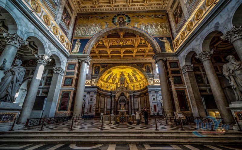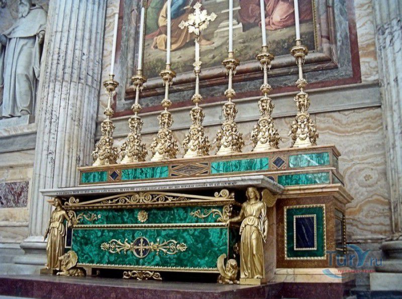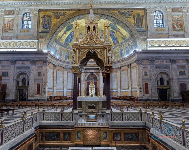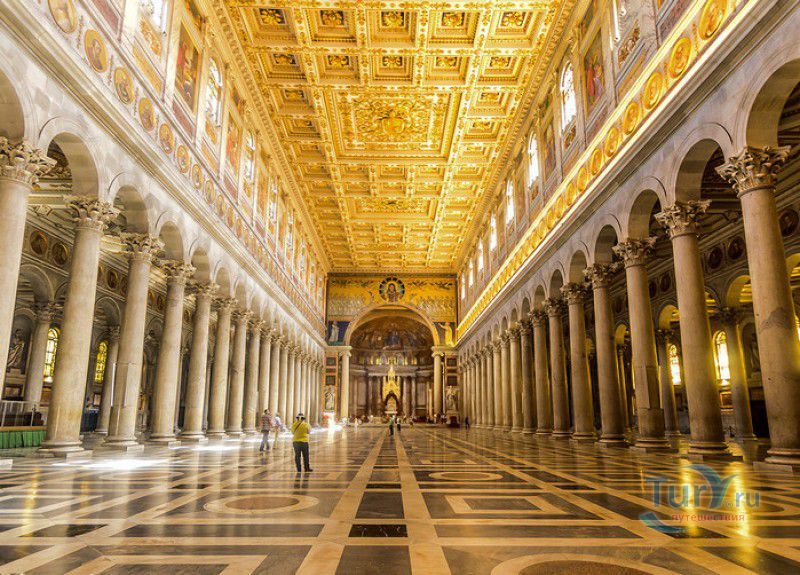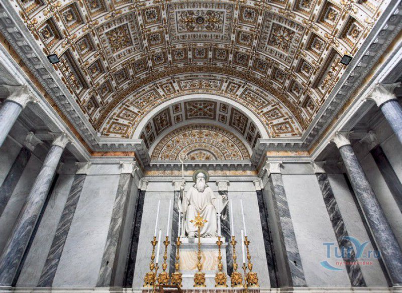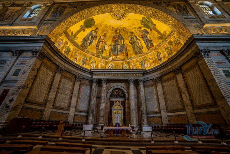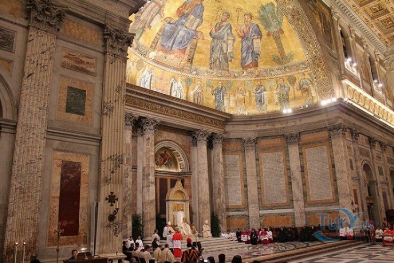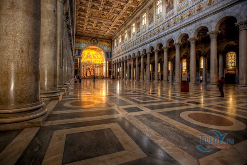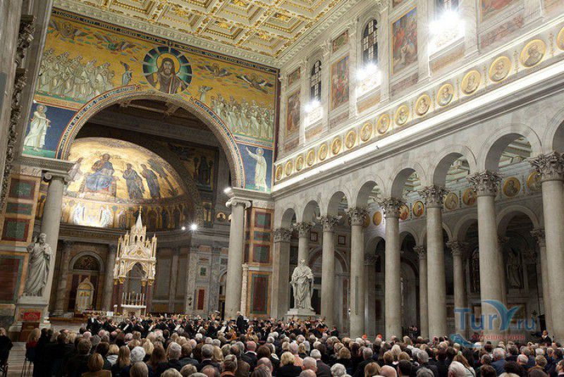 Базилика Сан Паоло Фуори Ле Мура (Базилика Святого Павла За Городскими Стенами) является одной из четырёх великих папских базилик Рима и второй по величине после собора Святого Петра в Ватикане. Она расположена в южной части Рима, за пределами городской стены Аврелиана, возведенной вокруг древнего Рима при императоре Аврелиане в III веке - отсюда и название базилики "за городскими стенами". Первая церковь на месте захоронения Апостола Павла, казнённого в 67 году по приказу императора Нерона, была построена в начале IV века императором Константином I. Вскоре эта церковь уже не могла вместить паломников, желающих поклониться мощам Святого Павла, и в 386 году, при императоре Феодосии I, на её месте начали строить новый храм с пятью нефами и трансептом. Базилика была достроена только в середине V века, при папе Льве I, и на протяжении последующих столетий неоднократно перестраивалась и расширялась - добавлялись новые часовни, её интерьер украшался мозаиками, фресками, картинами и скульптурами, в VI веке, при папе Григории Великом, в базилике был установлен алтарь над могилой Апостола Павла. В это же время рядом с храмом были возведены два монастыря - женский и мужской. В IX веке участились набеги сарацин, и папа Иоанн VIII окружил религиозный комплекс стеной с башнями, создав небольшой укреплённый город Джованниполи (Giovannipoli). Базилика Сан Паоло Фуори Ле Мура, в отличие от других папских базилик, сохраняла свой первоначальный облик на протяжении почти полутора тысячелетий, её архитектура не претерпела существенных изменений ни в эпоху Возрождения, ни во времена барокко. Но 15 июля 1823 года сильный пожар, произошедший по вине рабочих, чинивших крышу, уничтожил базилику почти до основания. Восстановление храма было начато в 1825 году, при папе Льве XII, и продолжалось до 1840 года, работами руководил архитектор Луиджи Полетти. Помощь в восстановлении храма оказывали монархи многих стран - правители Сардинии, Франции, Сицилии, Нидерландов, Египта и Российской империи (император Николай I прислал огромные блоки из малахита и лазурита для новых алтарей). В 1854 году Базилика Сан Паоло Фуори Ле Мура была повторно освящена папой Пием IX. Новая базилика сохранила первоначальную структуру, она по-прежнему состоит из пяти нефов. Длина здания составляет 132 метра, ширина - 65 метров, высота - 30 метров. Фасад храма украшен мозаикой с изображениями Иисуса Христа, апостолов Петра и Павла, пророков Исаии, Даниила, Иеремии и Иезеклииля, Святого Агнца и двенадцати ягнят, символизирующих двенадцать апостолов. В 1928 году по проекту Гульельмо Кальдерини вокруг внешнего двора храма был построен открытый портик из 150 колонн, в его центре установлена статуя Святого Павла с мечом и книгой в руках. Монументальная бронзовая дверь была установлена в 1931 году, при её изготовлении были использованы пластины из древней двери, выполненной в Константинополе в XI веке. Из интерьера базилики сохранились лишь часть апсиды и триумфальная арка, примыкающая к ней. Мозаика апсиды, выполненная в XIII веке Пьетро Каваллини, была почти полностью утрачена при пожаре, её уцелевшие фрагменты были использованы при реконструкции апсиды. Мозаики триумфальной арки, датируемые V веком, полностью сохранились. Большая же часть интерьера была заново воссоздана в XIX веке - 80 гранитных колонн, разделяющих нефы, бога