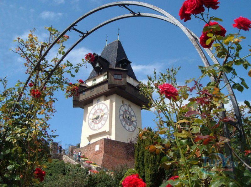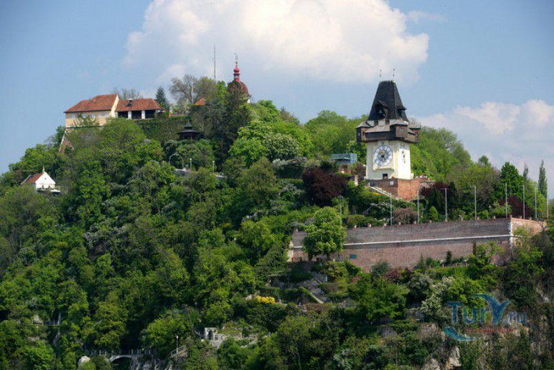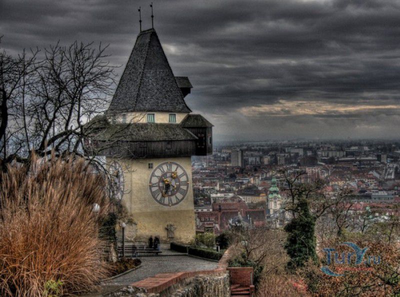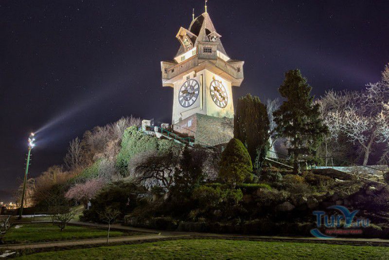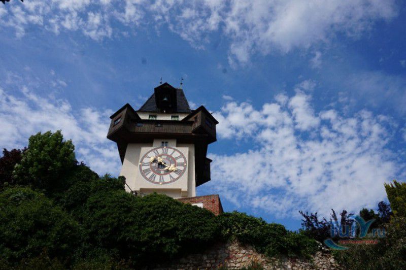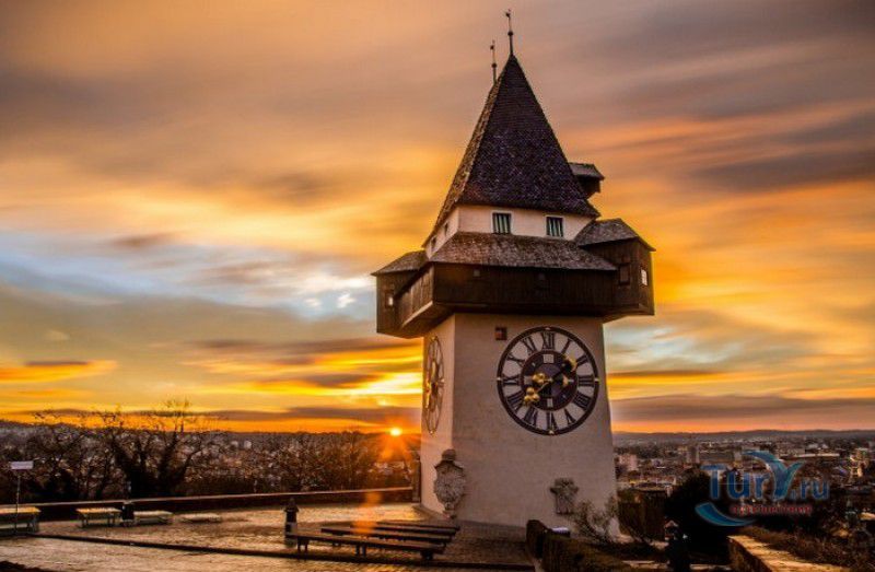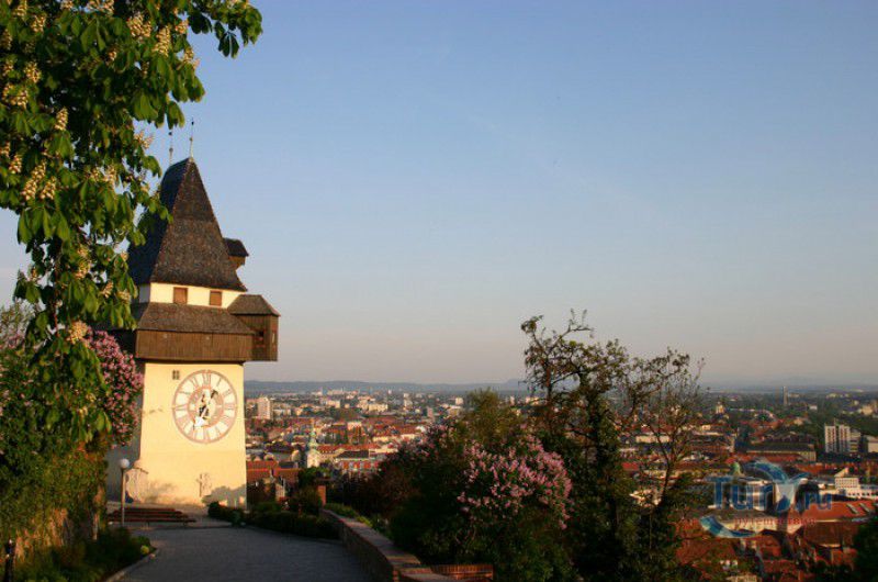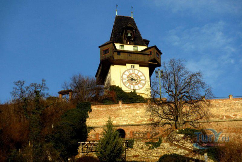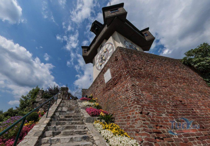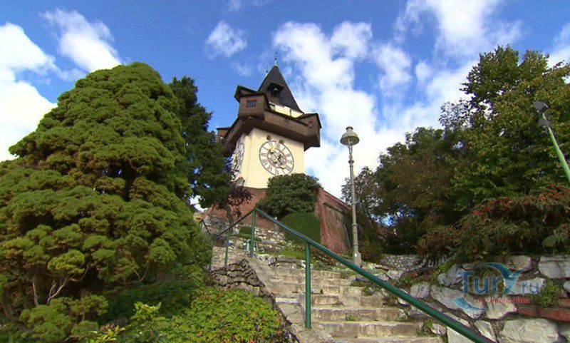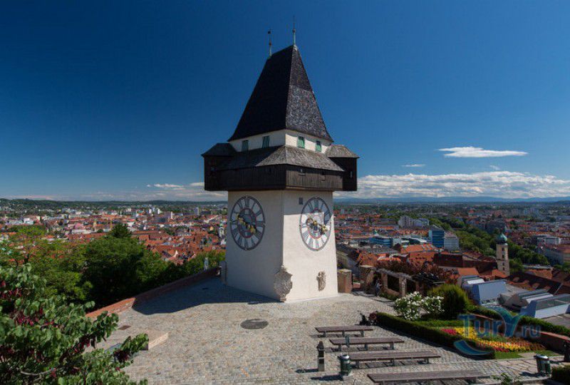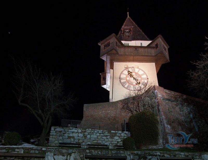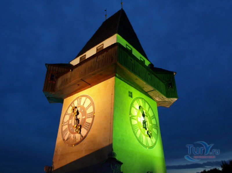Часовая Башня, одна из самых известных достопримечательностей и символ австрийского города Грац, расположена на вершине замковой горы Шлоссберг, в историческом центре Граца, в составе которого в 1999 году внесена в список Всемирного наследия ЮНЕСКО. Первое упоминание о башне датируется 1265 годом, она являлась частью оборонительных сооружений старинного замка-крепости Шлоссберг, построенного ещё в X веке. Замок был неприступен на протяжении столетий, пока в 1809 году не был взорван наполеоновскими войсками. От крепости уцелели лишь колокольня, остатки двух бастионов и Часовая башня, за которую жители Граца заплатили французам немалый выкуп. Высота башни - 28 метров, свой нынешний вид она приобрела в 1560 году, в 1712 году на каждой из четырёх граней башни были установлены часы с пятиметровым циферблатом и всего с одной стрелкой, отсчитывающей часы. Минутная стрелка появилась намного позже, но без знания "секрета" часов башни, можно легко ошибиться во времени - дело в том, что большая стрелка отсчитывает часы, а маленькая - минуты. Кроме того, на башне установлены три колокола. Часовой колокол, самый старый в Граце, был отлит в 1382 году и, как следует из его названия, отбивает время. Пожарный колокол был изготовлен в 1645 году и звонил при пожарах и других бедах, постигших город. Колокол грешников впервые пробил в 1450 году, сообщая о приведении в исполнение смертной казни (в XIX веке его звон сообщал о начале комендантского часа). Верхняя часть башни окружена деревянной галереей, которая служила обзорной точкой для пожарной охраны, в трёх углах башни размещены гербы, некогда украшавшие замок Шлоссберг - герб Штирии, одноглавый орёл - герб будущего императора Фердинанда I и двуглавый орёл с инициалами императрицы Марии Терезии. Крупномасштабная реконструкция Часовой башни была проведена в 2008-2011 годах, в ходе которой были укреплены фундамент, обновлены деревянные конструкции и отреставрированы часы. Рядом с Часовой башней разбит красивый парк и оборудована смотровая площадка, с которой открывается великолепный панорамный вид на исторический центр Граца.