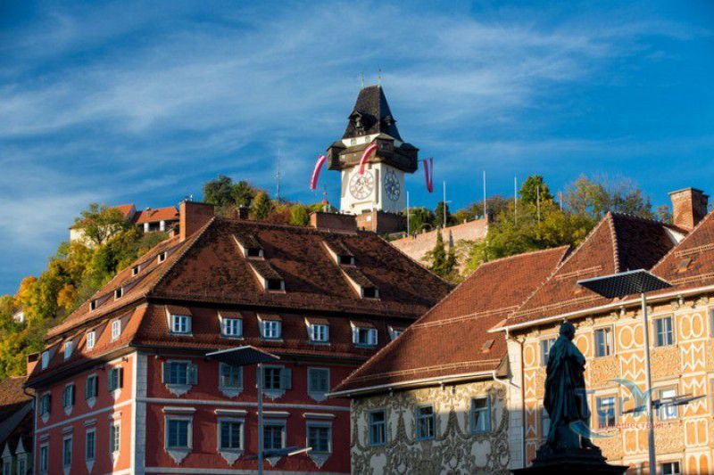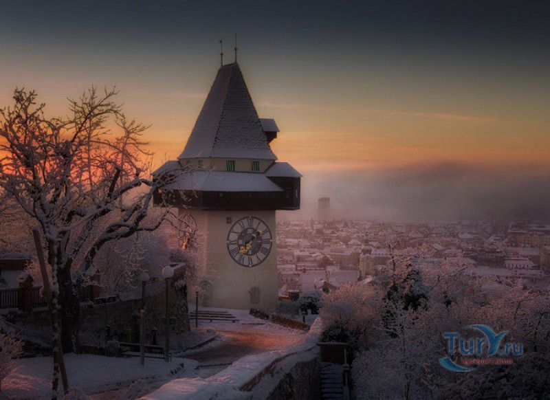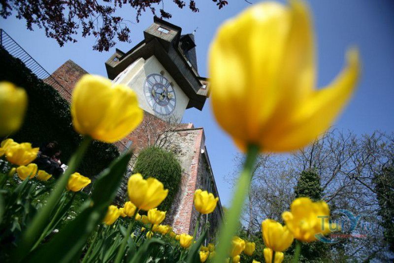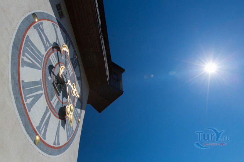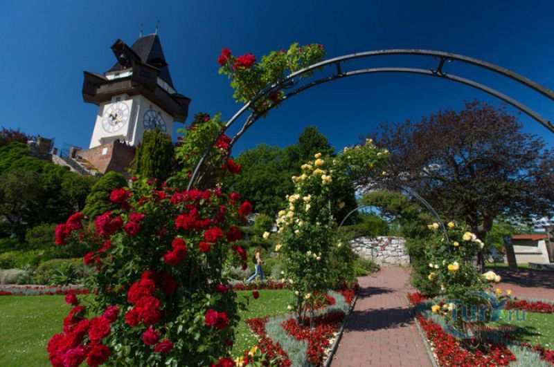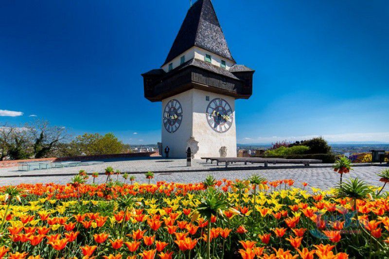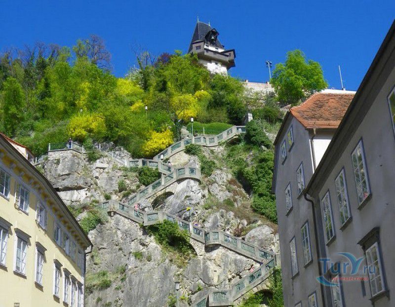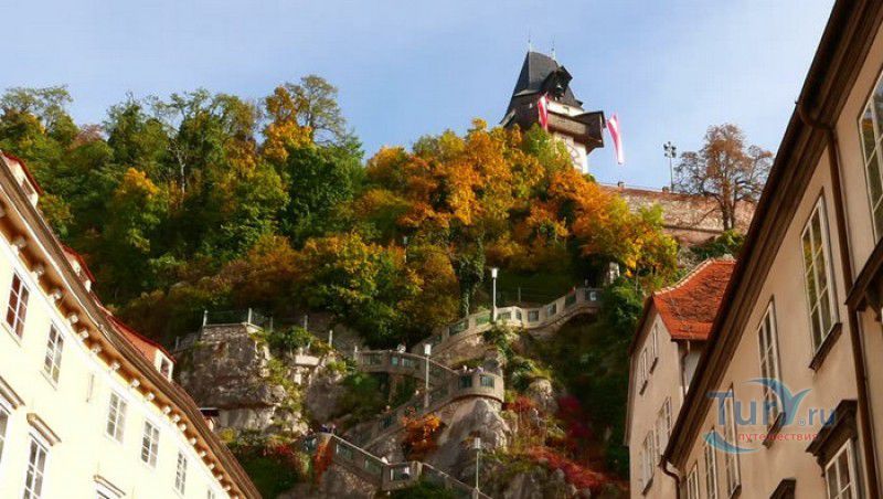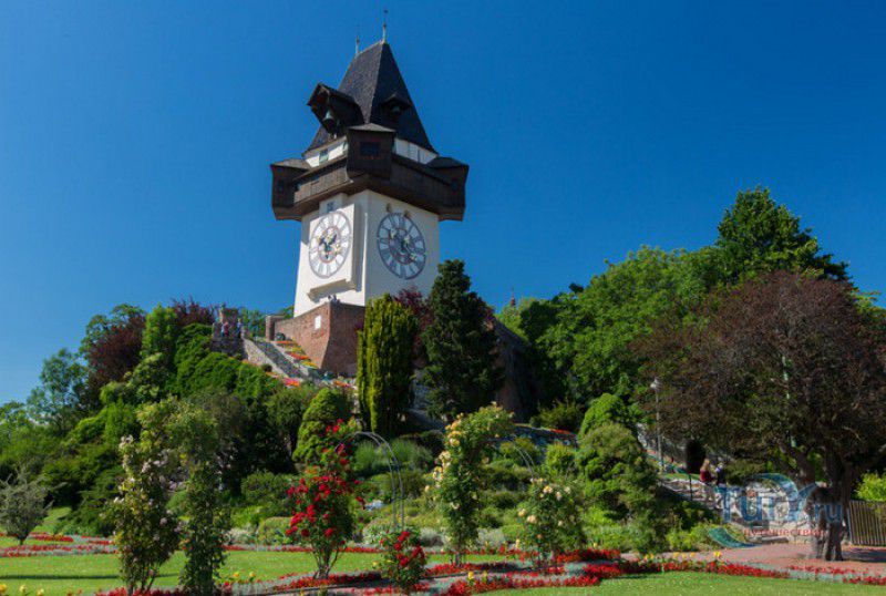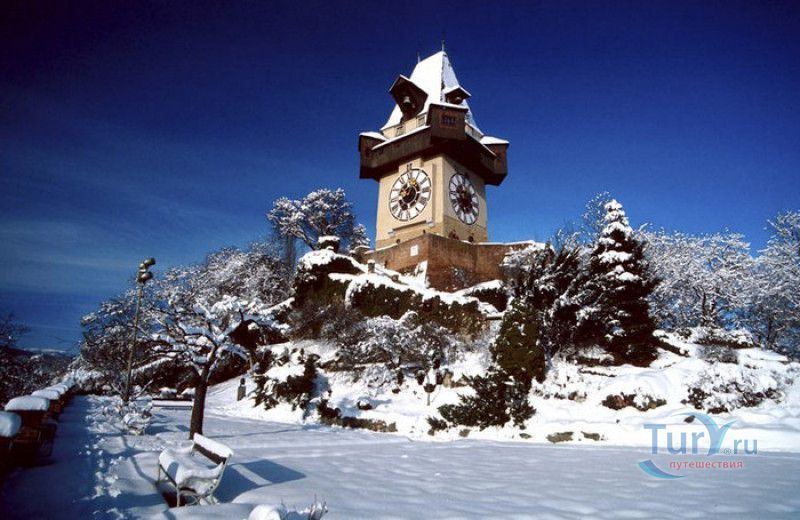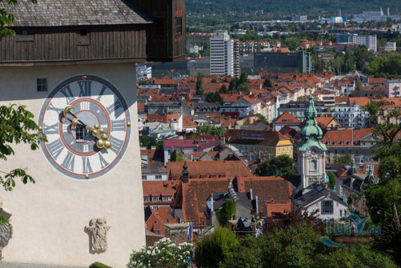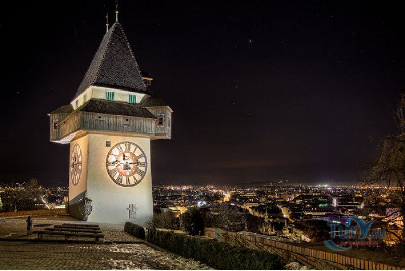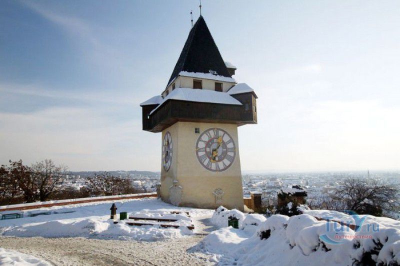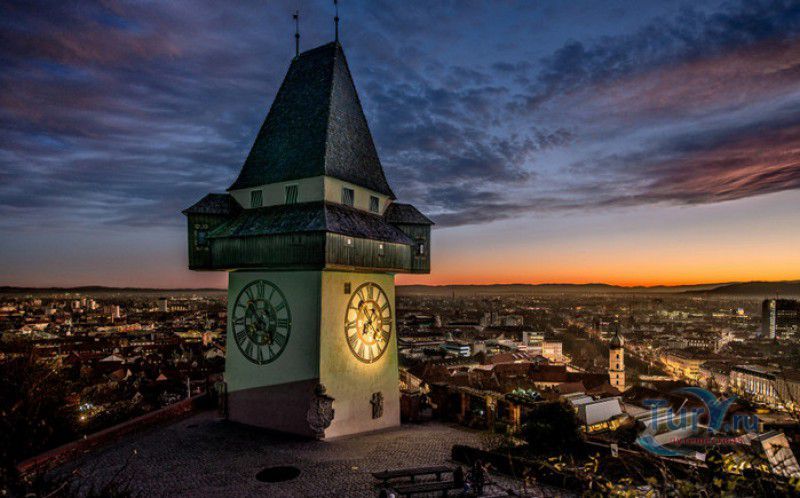 Часовая Башня, одна из самых известных достопримечательностей и символ австрийского города Грац, расположена на вершине замковой горы Шлоссберг, в историческом центре Граца, в составе которого в 1999 году внесена в список Всемирного наследия ЮНЕСКО. Первое упоминание о башне датируется 1265 годом, она являлась частью оборонительных сооружений старинного замка-крепости Шлоссберг, построенного ещё в X веке. Замок был неприступен на протяжении столетий, пока в 1809 году не был взорван наполеоновскими войсками. От крепости уцелели лишь колокольня, остатки двух бастионов и Часовая башня, за которую жители Граца заплатили французам немалый выкуп. Высота башни - 28 метров, свой нынешний вид она приобрела в 1560 году, в 1712 году на каждой из четырёх граней башни были установлены часы с пятиметровым циферблатом и всего с одной стрелкой, отсчитывающей часы. Минутная стрелка появилась намного позже, но без знания "секрета" часов башни, можно легко ошибиться во времени - дело в том, что большая стрелка отсчитывает часы, а маленькая - минуты. Кроме того, на башне установлены три колокола. Часовой колокол, самый старый в Граце, был отлит в 1382 году и, как следует из его названия, отбивает время. Пожарный колокол был изготовлен в 1645 году и звонил при пожарах и других бедах, постигших город. Колокол грешников впервые пробил в 1450 году, сообщая о приведении в исполнение смертной казни (в XIX веке его звон сообщал о начале комендантского часа). Верхняя часть башни окружена деревянной галереей, которая служила обзорной точкой для пожарной охраны, в трёх углах башни размещены гербы, некогда украшавшие замок Шлоссберг - герб Штирии, одноглавый орёл - герб будущего императора Фердинанда I и двуглавый орёл с инициалами императрицы Марии Терезии. Крупномасштабная реконструкция Часовой башни была проведена в 2008-2011 годах, в ходе которой были укреплены фундамент, обновлены деревянные конструкции и отреставрированы часы. Рядом с Часовой башней разбит красивый парк и оборудована смотровая площадка, с которой открывается великолепный панорамный вид на исторический центр Граца.