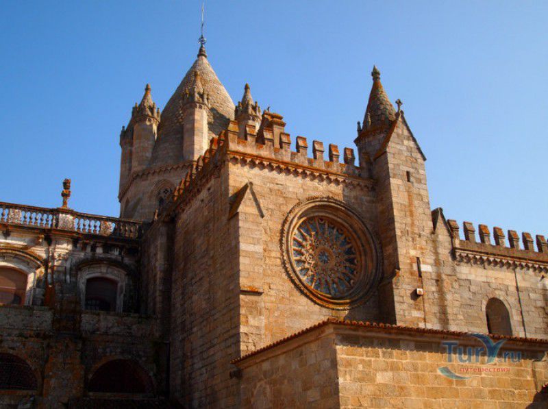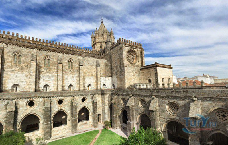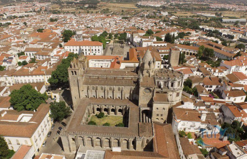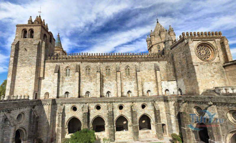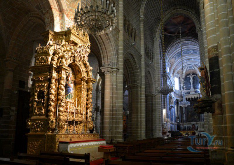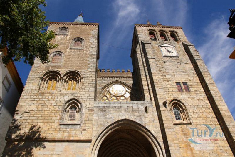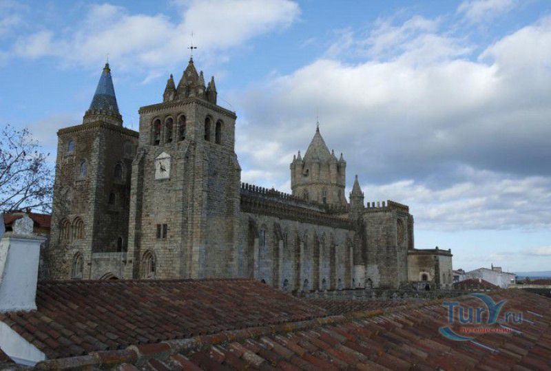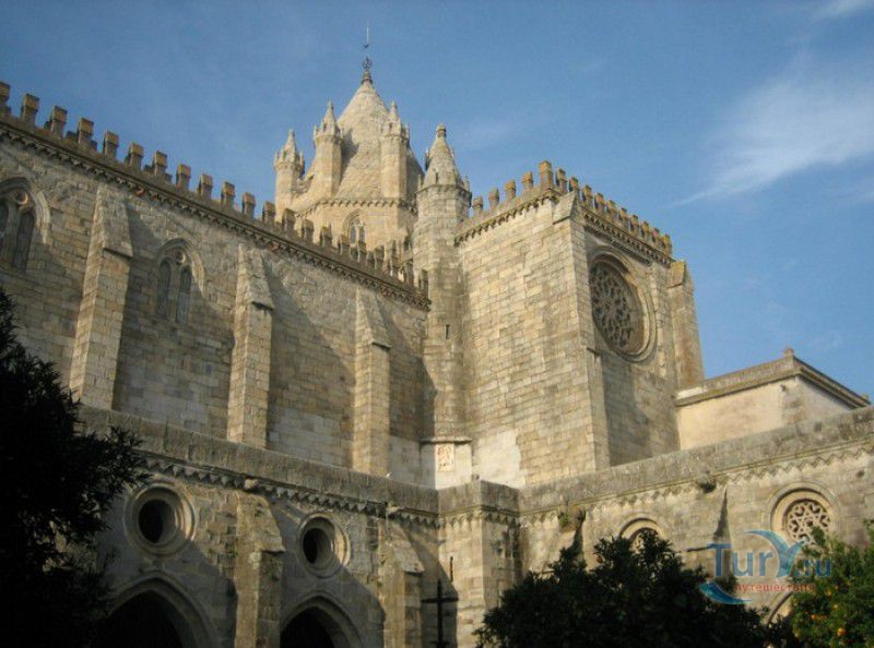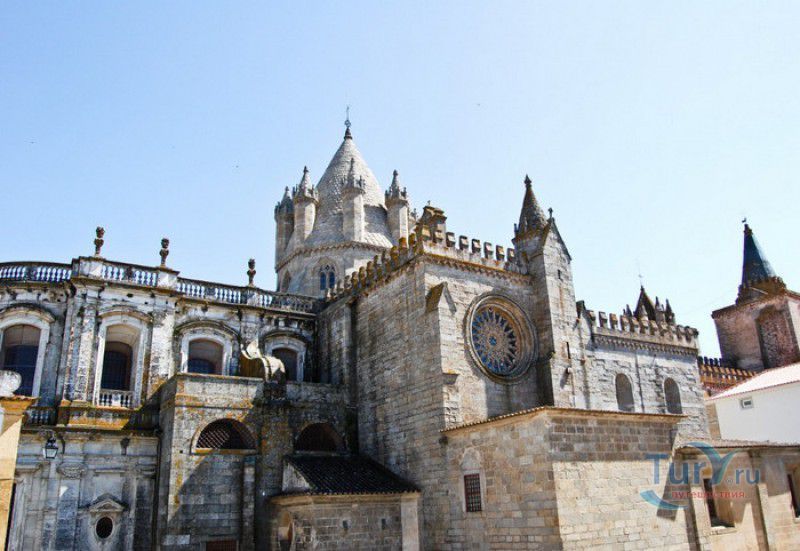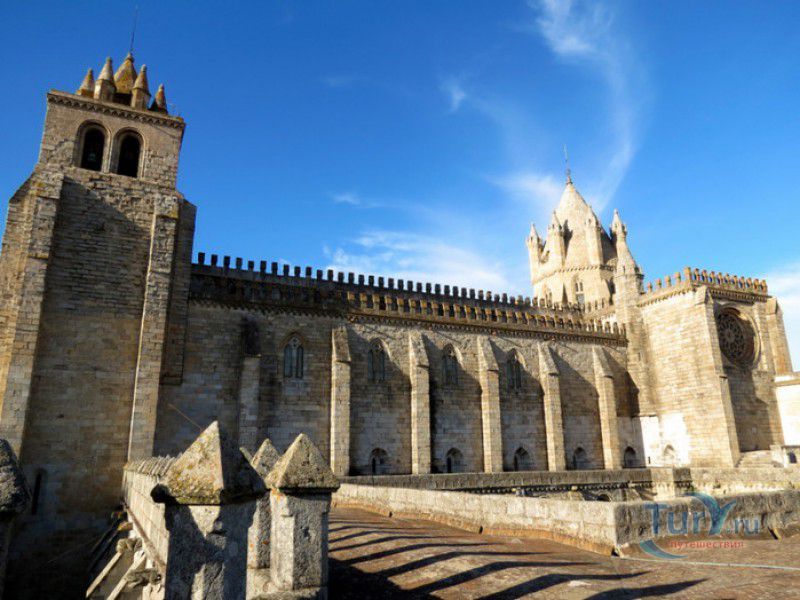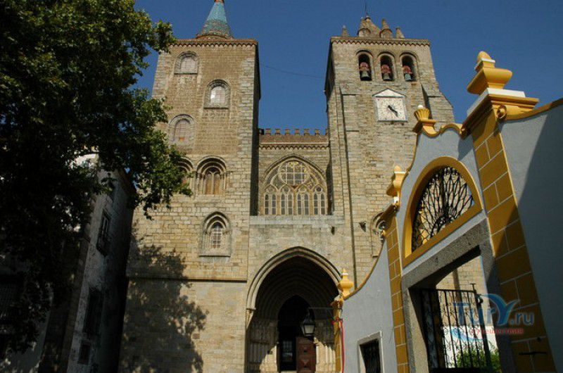 Кафедральный Собор Эворы (полное название - Кафедральная Базилика Успения Божией Матери) является крупнейшим средневековым собором Португалии и одной из главных достопримечательностей города Эвора. Собор расположен в центре города, в составе исторического центра Эворы в 1988 году он был внесен в список Всемирного наследия ЮНЕСКО. Строительство собора было начато в 1186 году и завершено лишь в 1250 году. В его архитектурном стиле прослеживается переход от романского стиля, в котором собор начал строиться, к готическому. Со временем небольшой по размерам храм превратился в величественный собор - в XIV веке был построен готический клуатр (крытая галерея с внутренним двориком), в XVI веке - часовня Божией Матери Милосердия в стиле мануэлино, в XVIII веке - главная часовня в стиле барокко. Собор Эворы построен из гранита, с обеих сторон центрального фасада расположены две массивные асимметричные башни, над притвором находится большое круглое окно, украшенное ажурной решёткой. Все башни собора увенчаны коническими шпилями в готическом стиле, наружные стены украшены зубцами и декоративным орнаментом. Особого внимания заслуживает Фонарная башня собора, её шпиль окружён шестью башенками, каждая из которых является уменьшенной копией самой башни. Центральный вход украшают статуи двенадцати апостолов, считающиеся шедевром португальской готической скульптуры. Интерьер собора состоит из трёх нефов, трансепта, апсиды с тремя приделами, небольшого баптистерия и нескольких часовен. В центральном нефе находится алтарь, созданный немецким архитектором Фридрихом Людвигом, по проекту которого был построен монастырь королевского дворца в Марфе. В центре алтаря, выполненного из розового, зелёного и белого мрамора, расположена статуя беременной Девы Марии. Главный алтарь собора выполнен итальянским мастером Антонио Беллини, автором распятия над алтарем является португальский скульптор Мануэль Диас. Крытая готическая галерея окружает красивый внутренний дворик с колодцем в центре. Стены галереи украшены стрельчатыми арками и круглыми окнами-розетками. По узкой винтовой лестнице можно подняться на открытую террасу на крыше, с которой открывается красивый вид на город и его окрестности. В здании бывшего колледжа, примыкающего к собору, размещается Музей сакрального искусства, который содержит большую коллекцию религиозных предметов, церковного облачения, произведений искусства и ювелирных украшений. Среди реликвий - статуя Девы Марии, которая раскрываясь, превращается в триптих, на котором изображены девять сцен из её жизни, статуя выполнена из слоновой кости и датируется XIII веком. В музее также хранятся скипетр короля-кардинала Энрике Португальского и серебряный реликварий Святого Креста, украшенный позолотой, эмалью и 1426 драгоценными камнями. Существует легенда, что перед отплытием в Индию в 1497 году Васко да Гама освятил в соборе Эворы флаги кораблей своей экспедиции.