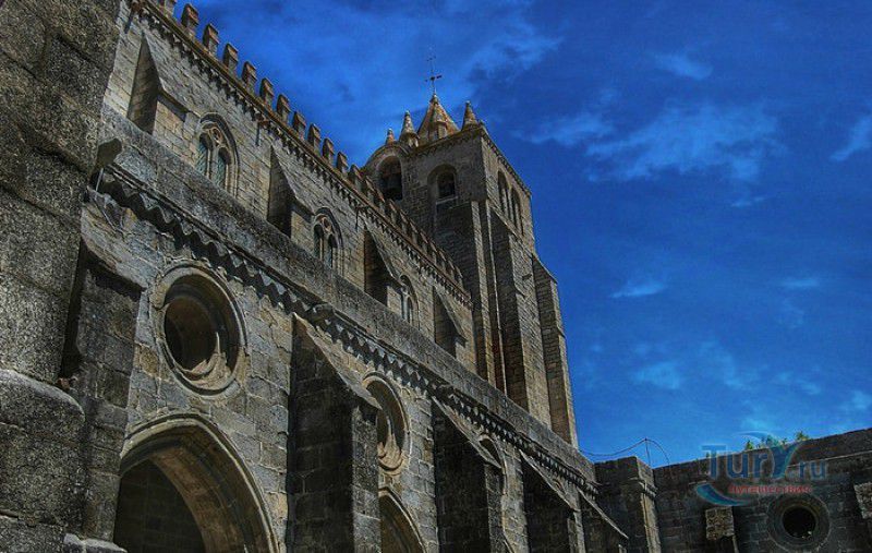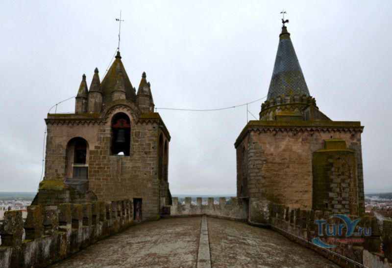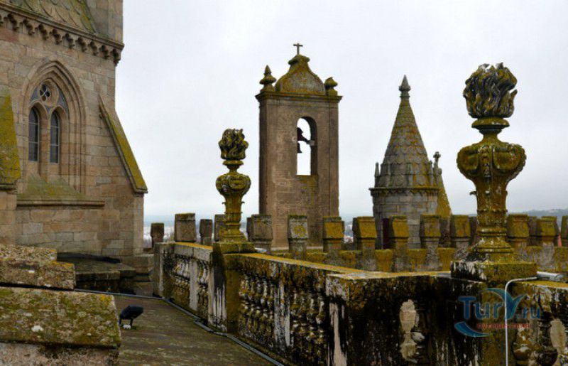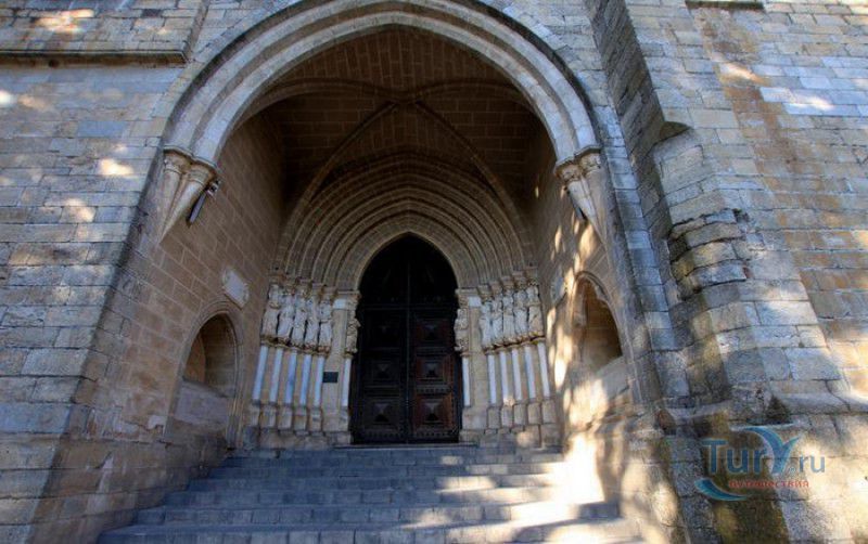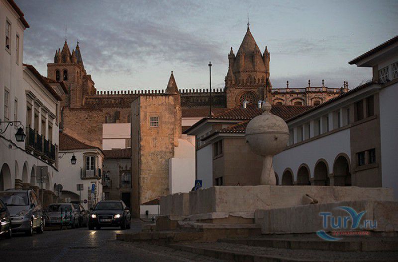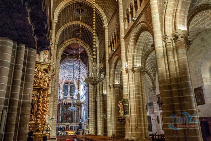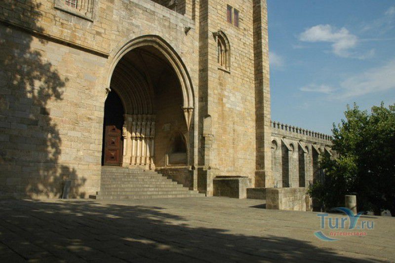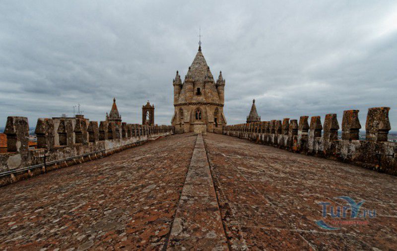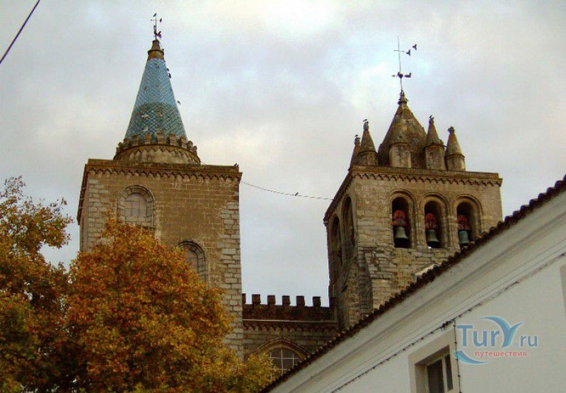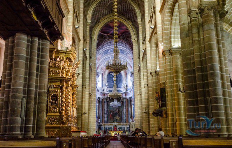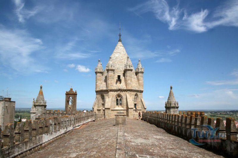 Кафедральный Собор Эворы (полное название - Кафедральная Базилика Успения Божией Матери) является крупнейшим средневековым собором Португалии и одной из главных достопримечательностей города Эвора. Собор расположен в центре города, в составе исторического центра Эворы в 1988 году он был внесен в список Всемирного наследия ЮНЕСКО. Строительство собора было начато в 1186 году и завершено лишь в 1250 году. В его архитектурном стиле прослеживается переход от романского стиля, в котором собор начал строиться, к готическому. Со временем небольшой по размерам храм превратился в величественный собор - в XIV веке был построен готический клуатр (крытая галерея с внутренним двориком), в XVI веке - часовня Божией Матери Милосердия в стиле мануэлино, в XVIII веке - главная часовня в стиле барокко. Собор Эворы построен из гранита, с обеих сторон центрального фасада расположены две массивные асимметричные башни, над притвором находится большое круглое окно, украшенное ажурной решёткой. Все башни собора увенчаны коническими шпилями в готическом стиле, наружные стены украшены зубцами и декоративным орнаментом. Особого внимания заслуживает Фонарная башня собора, её шпиль окружён шестью башенками, каждая из которых является уменьшенной копией самой башни. Центральный вход украшают статуи двенадцати апостолов, считающиеся шедевром португальской готической скульптуры. Интерьер собора состоит из трёх нефов, трансепта, апсиды с тремя приделами, небольшого баптистерия и нескольких часовен. В центральном нефе находится алтарь, созданный немецким архитектором Фридрихом Людвигом, по проекту которого был построен монастырь королевского дворца в Марфе. В центре алтаря, выполненного из розового, зелёного и белого мрамора, расположена статуя беременной Девы Марии. Главный алтарь собора выполнен итальянским мастером Антонио Беллини, автором распятия над алтарем является португальский скульптор Мануэль Диас. Крытая готическая галерея окружает красивый внутренний дворик с колодцем в центре. Стены галереи украшены стрельчатыми арками и круглыми окнами-розетками. По узкой винтовой лестнице можно подняться на открытую террасу на крыше, с которой открывается красивый вид на город и его окрестности. В здании бывшего колледжа, примыкающего к собору, размещается Музей сакрального искусства, который содержит большую коллекцию религиозных предметов, церковного облачения, произведений искусства и ювелирных украшений. Среди реликвий - статуя Девы Марии, которая раскрываясь, превращается в триптих, на котором изображены девять сцен из её жизни, статуя выполнена из слоновой кости и датируется XIII веком. В музее также хранятся скипетр короля-кардинала Энрике Португальского и серебряный реликварий Святого Креста, украшенный позолотой, эмалью и 1426 драгоценными камнями. Существует легенда, что перед отплытием в Индию в 1497 году Васко да Гама освятил в соборе Эворы флаги кораблей своей экспедиции.