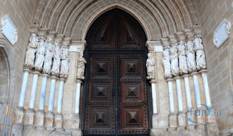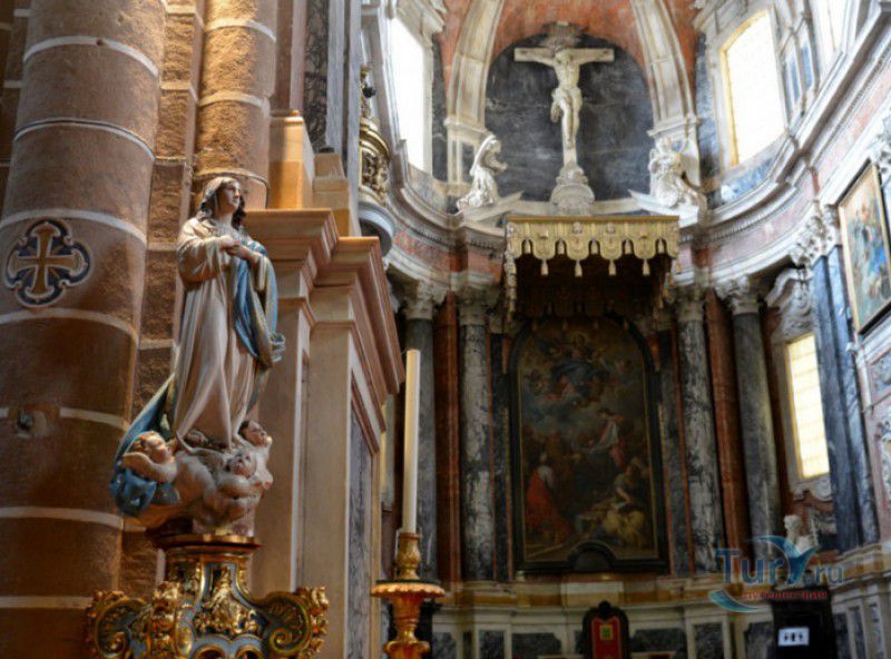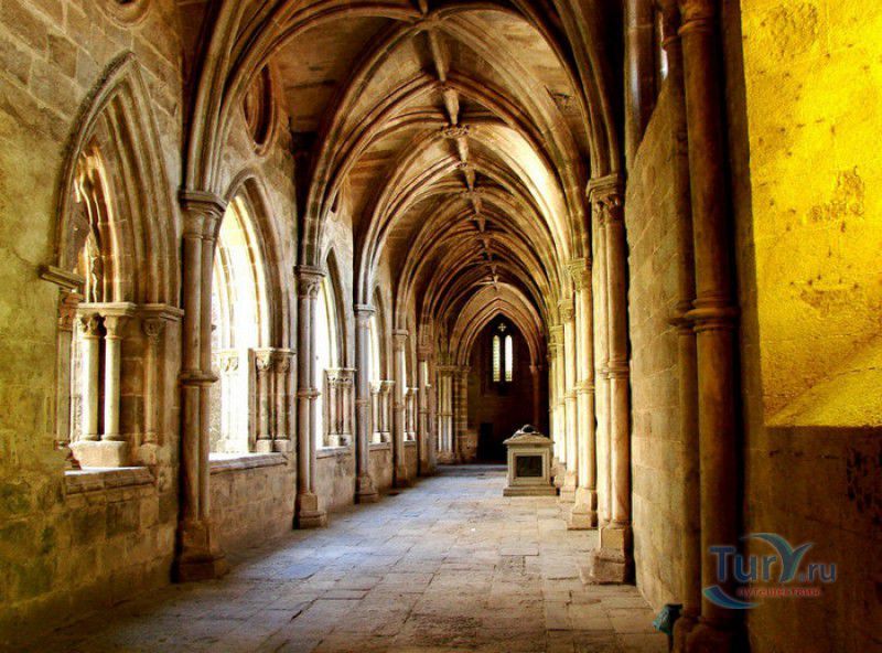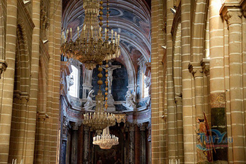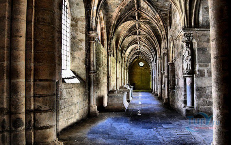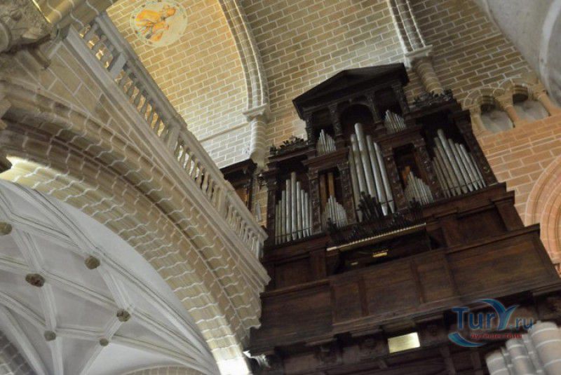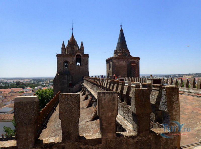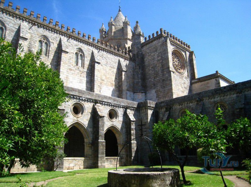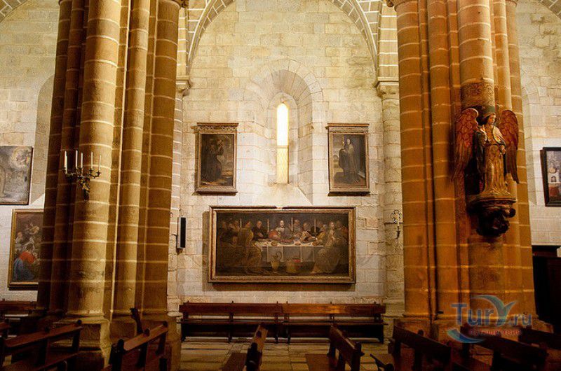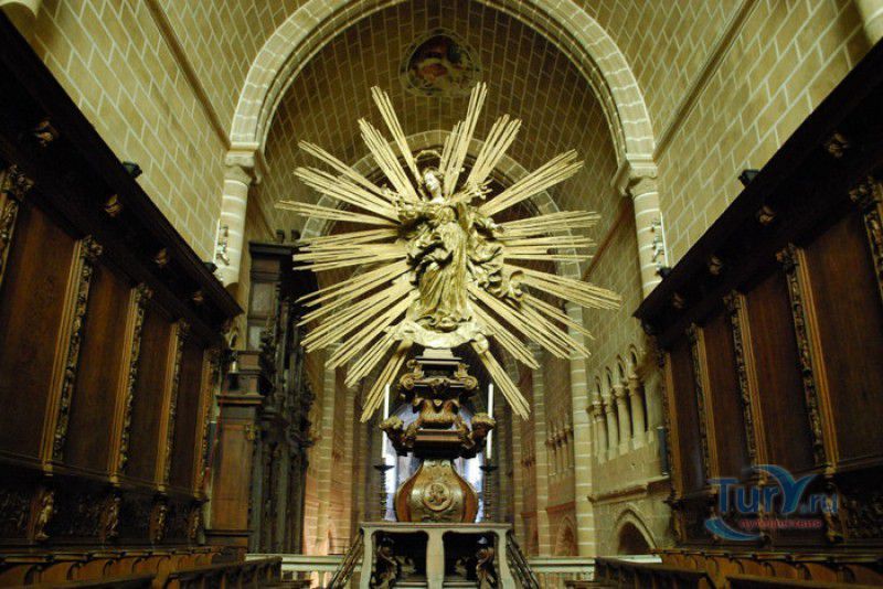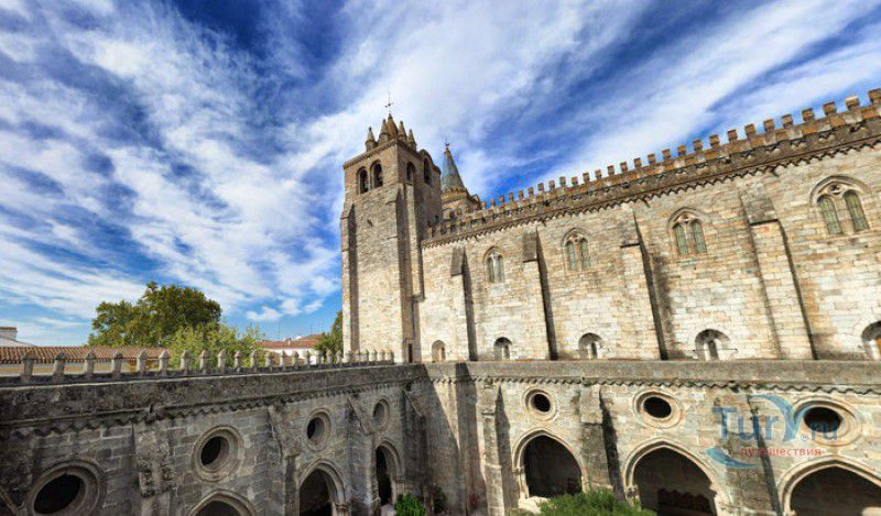 Кафедральный Собор Эворы (полное название - Кафедральная Базилика Успения Божией Матери) является крупнейшим средневековым собором Португалии и одной из главных достопримечательностей города Эвора. Собор расположен в центре города, в составе исторического центра Эворы в 1988 году он был внесен в список Всемирного наследия ЮНЕСКО. Строительство собора было начато в 1186 году и завершено лишь в 1250 году. В его архитектурном стиле прослеживается переход от романского стиля, в котором собор начал строиться, к готическому. Со временем небольшой по размерам храм превратился в величественный собор - в XIV веке был построен готический клуатр (крытая галерея с внутренним двориком), в XVI веке - часовня Божией Матери Милосердия в стиле мануэлино, в XVIII веке - главная часовня в стиле барокко. Собор Эворы построен из гранита, с обеих сторон центрального фасада расположены две массивные асимметричные башни, над притвором находится большое круглое окно, украшенное ажурной решёткой. Все башни собора увенчаны коническими шпилями в готическом стиле, наружные стены украшены зубцами и декоративным орнаментом. Особого внимания заслуживает Фонарная башня собора, её шпиль окружён шестью башенками, каждая из которых является уменьшенной копией самой башни. Центральный вход украшают статуи двенадцати апостолов, считающиеся шедевром португальской готической скульптуры. Интерьер собора состоит из трёх нефов, трансепта, апсиды с тремя приделами, небольшого баптистерия и нескольких часовен. В центральном нефе находится алтарь, созданный немецким архитектором Фридрихом Людвигом, по проекту которого был построен монастырь королевского дворца в Марфе. В центре алтаря, выполненного из розового, зелёного и белого мрамора, расположена статуя беременной Девы Марии. Главный алтарь собора выполнен итальянским мастером Антонио Беллини, автором распятия над алтарем является португальский скульптор Мануэль Диас. Крытая готическая галерея окружает красивый внутренний дворик с колодцем в центре. Стены галереи украшены стрельчатыми арками и круглыми окнами-розетками. По узкой винтовой лестнице можно подняться на открытую террасу на крыше, с которой открывается красивый вид на город и его окрестности. В здании бывшего колледжа, примыкающего к собору, размещается Музей сакрального искусства, который содержит большую коллекцию религиозных предметов, церковного облачения, произведений искусства и ювелирных украшений. Среди реликвий - статуя Девы Марии, которая раскрываясь, превращается в триптих, на котором изображены девять сцен из её жизни, статуя выполнена из слоновой кости и датируется XIII веком. В музее также хранятся скипетр короля-кардинала Энрике Португальского и серебряный реликварий Святого Креста, украшенный позолотой, эмалью и 1426 драгоценными камнями. Существует легенда, что перед отплытием в Индию в 1497 году Васко да Гама освятил в соборе Эворы флаги кораблей своей экспедиции.