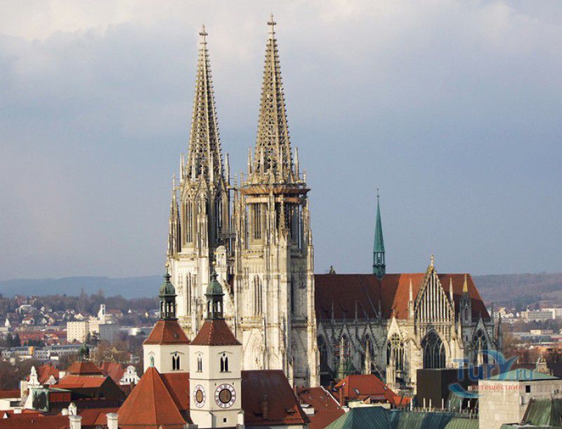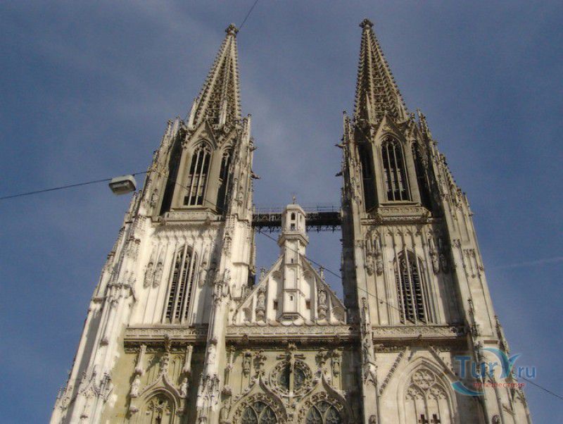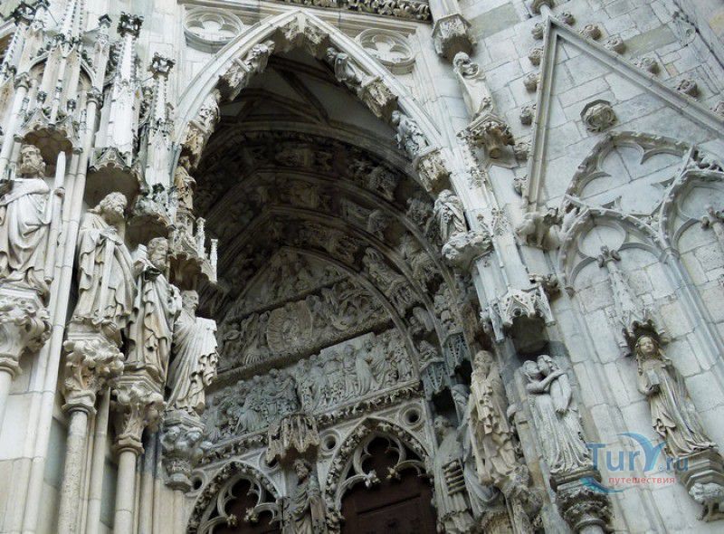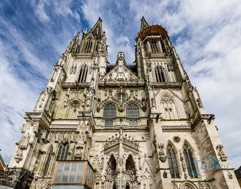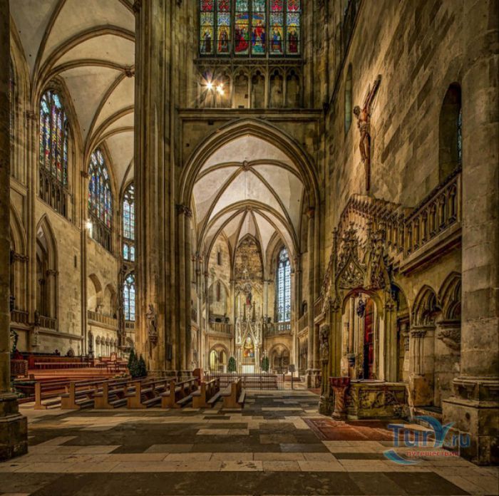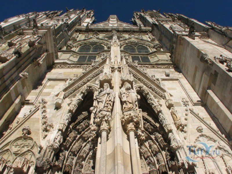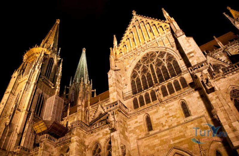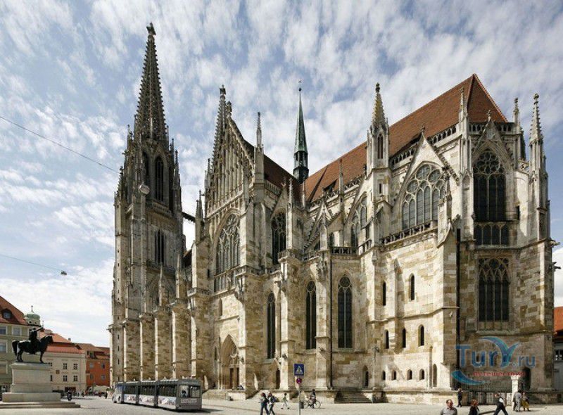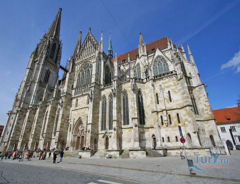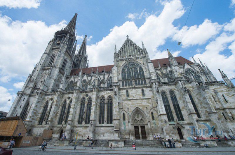 Кафедральный Собор Святого Петра в Регенсбурге (Регенсбургский Собор) расположен в историческом центре (Старом городе) Регенсбурга, в составе которого в 2006 году внесен в список Всемирного наследия ЮНЕСКО. Возведение Регенсбургского собора было начато в 1273 году и продолжалось, до окончательного его завершения, почти 250 лет. Уже в VII веке на месте нынешнего собора стояла романская церковь, которая на протяжении веков неоднократно разрушалась, восстанавливалась и перестраивалась. В 1250 году сильный пожар снова уничтожил здание церкви, и Регенсбургская епархия принимает решение о строительстве на её месте нового собора в стиле Высокой готики. Поскольку работы велись очень долго, на строительстве собора сменился ни один архитектор, каждый из которых внёс свою лепту во внешний облик здания. В результате фасад здания выглядит несколько разобщённым - отличаются как строительный материал, используемый при возведении собора (известняк, зелёный песчаник и снова известняк), так и декоративные элементы здания. Полностью работы были завершены в 1520 году, к этому времени здание собора представляло собой трёхневную базилику без трансепта. Длина фасада составляет 86 метров, ширина – 35 метров. Главный, западный, портал собора, построенный в 1415 году, богато украшен статуями святых, барельефами, резными стрельчатыми архивольтами, обрамляющими арочные проёмы, и ажурными каменными решётками. На тимпане правого портала располагается скульптурная композиция, на которой изображена сцена освобождения ангелом святого Петра, заключённого в темницу. Кроме того, на фасадах здания размещены статуи языческих властителей четырёх мировых империй - вавилонского царя Навуходоносора, верхом на медведе, македонского царя Александра Великого, сидящего на пантере, римского императора Августа, восседающего на единороге, и персидского царя Кира - на льве. Единственным сохранившимся элементом романской церкви является северная башня Эзельстурм, которую не стали сносить, так как использовали её для подъёма строительных материалов при возведении нового собора. До середины XIX века западные неоготические башни собора имели только три этажа, в 1859-1869 годах, по указу короля Людвига I, они были надстроены и увенчаны высокими остроконечными шпилями - высота башен, таким образом, стала равняться 105 метрам. Интерьер собора также богато украшен колоннами и скульптурными композициями, среди которых - сцена Благовещения (1280 год), располагающаяся на колоннах средокрестия, знаменитая статуя "Улыбающегося ангела", статуи святых Петра и Павла (всего в соборе насчитывается более 100 изображений Святого Петра), а также скульптурная композиция "Чёрт и его бабушка". Главная достопримечательность Регенсбургского собора - оригинальные готические витражи, украшающие окна клироса, поперечной части и боковых продольных нефов. Большинство витражей датируются 1220-1370 годами, они выполнены из мелких кусочков цветного стекла, скреплённых свинцовыми прутьями. Витражи на окнах западного фасада появились уже в XIX столетии. В центральном нефе установлен великолепный серебряный алтарь, выполненный в 1695-1785 годах ювелирами из Аугсбурга. Позади главного алтаря находится кафедра епископа Регенсбурга. На протяжении веков собор служил местом захоронения епископов и знатных горожан, в клуатре 