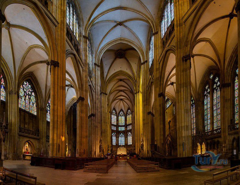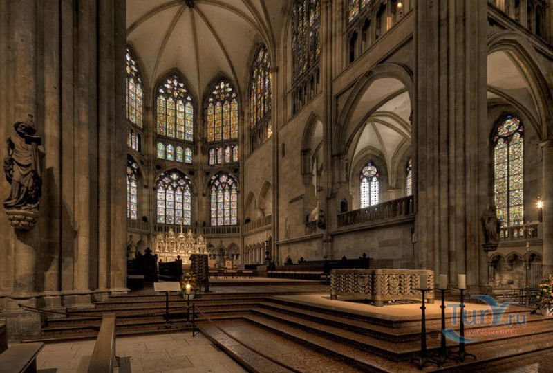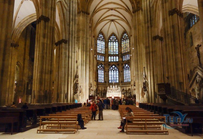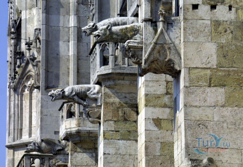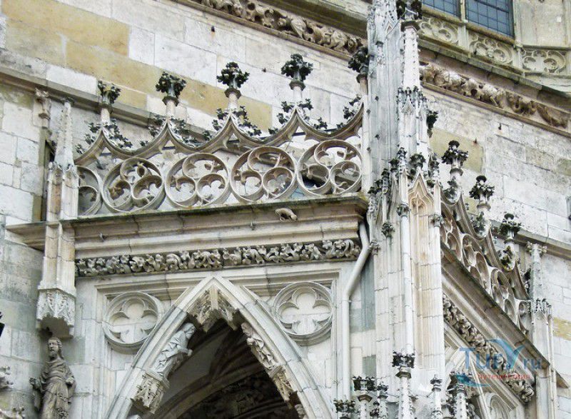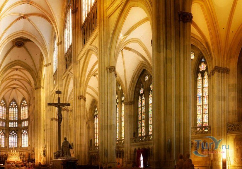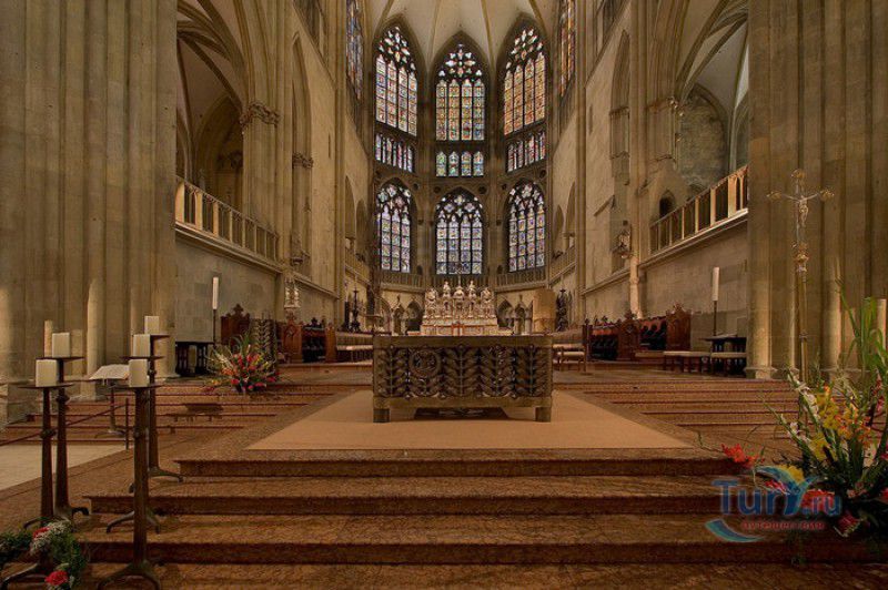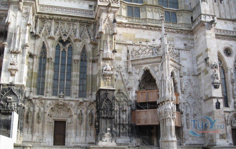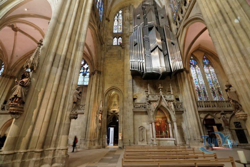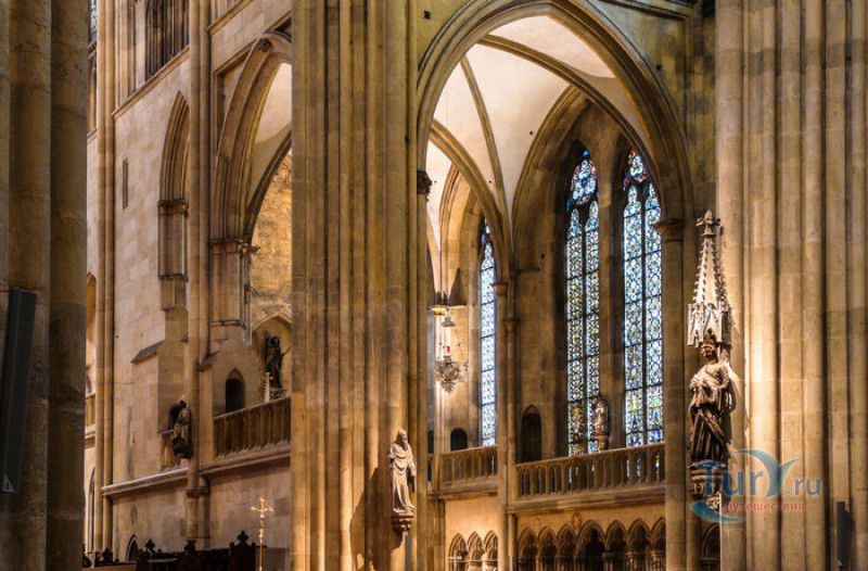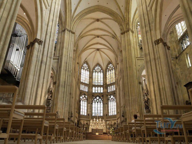 Кафедральный Собор Святого Петра в Регенсбурге (Регенсбургский Собор) расположен в историческом центре (Старом городе) Регенсбурга, в составе которого в 2006 году внесен в список Всемирного наследия ЮНЕСКО. Возведение Регенсбургского собора было начато в 1273 году и продолжалось, до окончательного его завершения, почти 250 лет. Уже в VII веке на месте нынешнего собора стояла романская церковь, которая на протяжении веков неоднократно разрушалась, восстанавливалась и перестраивалась. В 1250 году сильный пожар снова уничтожил здание церкви, и Регенсбургская епархия принимает решение о строительстве на её месте нового собора в стиле Высокой готики. Поскольку работы велись очень долго, на строительстве собора сменился ни один архитектор, каждый из которых внёс свою лепту во внешний облик здания. В результате фасад здания выглядит несколько разобщённым - отличаются как строительный материал, используемый при возведении собора (известняк, зелёный песчаник и снова известняк), так и декоративные элементы здания. Полностью работы были завершены в 1520 году, к этому времени здание собора представляло собой трёхневную базилику без трансепта. Длина фасада составляет 86 метров, ширина – 35 метров. Главный, западный, портал собора, построенный в 1415 году, богато украшен статуями святых, барельефами, резными стрельчатыми архивольтами, обрамляющими арочные проёмы, и ажурными каменными решётками. На тимпане правого портала располагается скульптурная композиция, на которой изображена сцена освобождения ангелом святого Петра, заключённого в темницу. Кроме того, на фасадах здания размещены статуи языческих властителей четырёх мировых империй - вавилонского царя Навуходоносора, верхом на медведе, македонского царя Александра Великого, сидящего на пантере, римского императора Августа, восседающего на единороге, и персидского царя Кира - на льве. Единственным сохранившимся элементом романской церкви является северная башня Эзельстурм, которую не стали сносить, так как использовали её для подъёма строительных материалов при возведении нового собора. До середины XIX века западные неоготические башни собора имели только три этажа, в 1859-1869 годах, по указу короля Людвига I, они были надстроены и увенчаны высокими остроконечными шпилями - высота башен, таким образом, стала равняться 105 метрам. Интерьер собора также богато украшен колоннами и скульптурными композициями, среди которых - сцена Благовещения (1280 год), располагающаяся на колоннах средокрестия, знаменитая статуя "Улыбающегося ангела", статуи святых Петра и Павла (всего в соборе насчитывается более 100 изображений Святого Петра), а также скульптурная композиция "Чёрт и его бабушка". Главная достопримечательность Регенсбургского собора - оригинальные готические витражи, украшающие окна клироса, поперечной части и боковых продольных нефов. Большинство витражей датируются 1220-1370 годами, они выполнены из мелких кусочков цветного стекла, скреплённых свинцовыми прутьями. Витражи на окнах западного фасада появились уже в XIX столетии. В центральном нефе установлен великолепный серебряный алтарь, выполненный в 1695-1785 годах ювелирами из Аугсбурга. Позади главного алтаря находится кафедра епископа Регенсбурга. На протяжении веков собор служил местом захоронения епископов и знатных горожан, в клуатре 