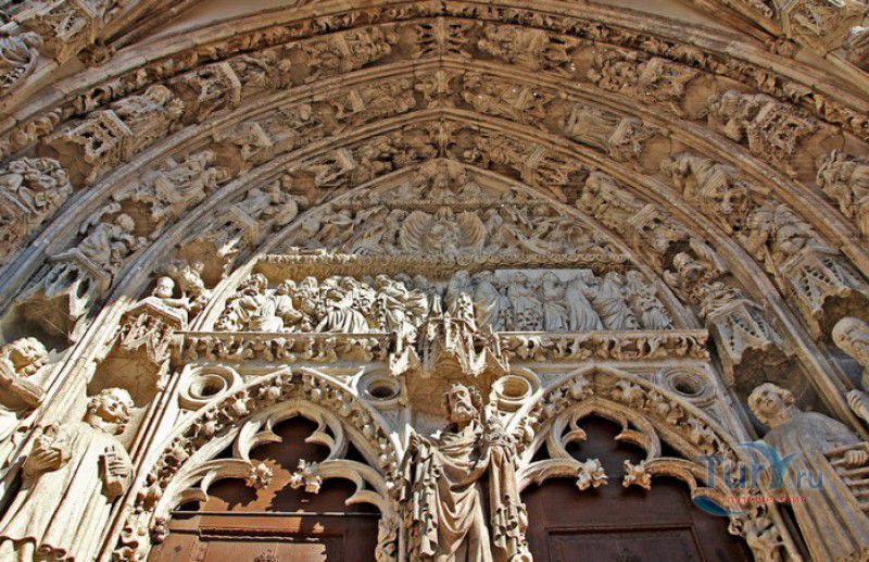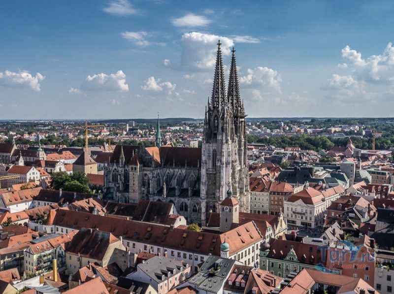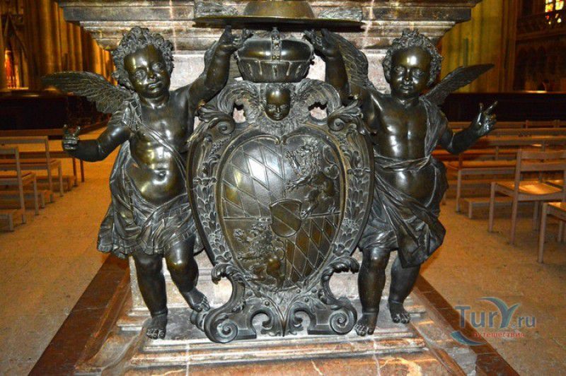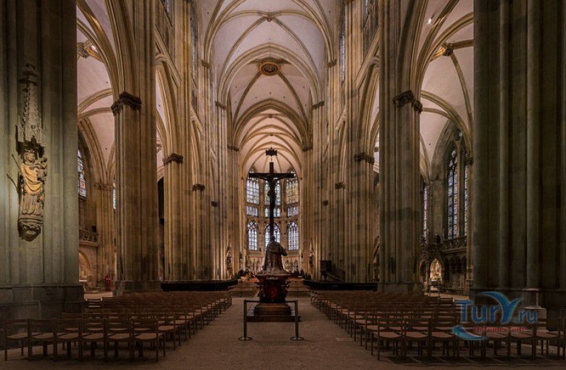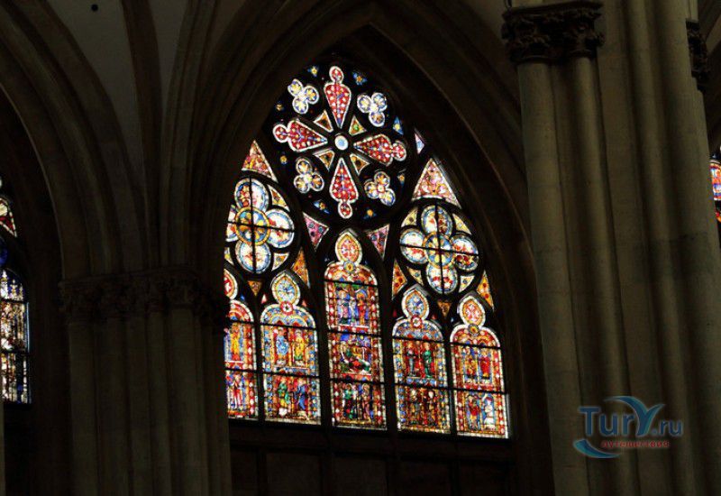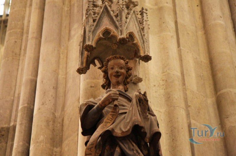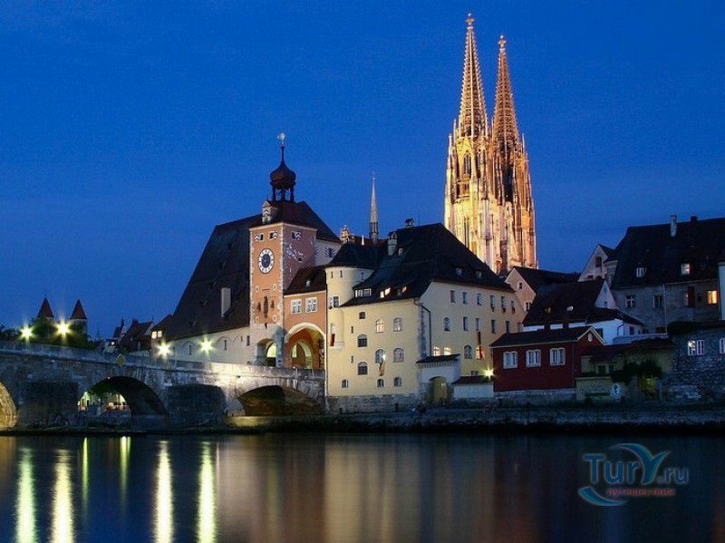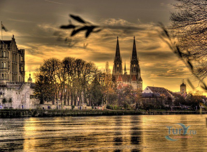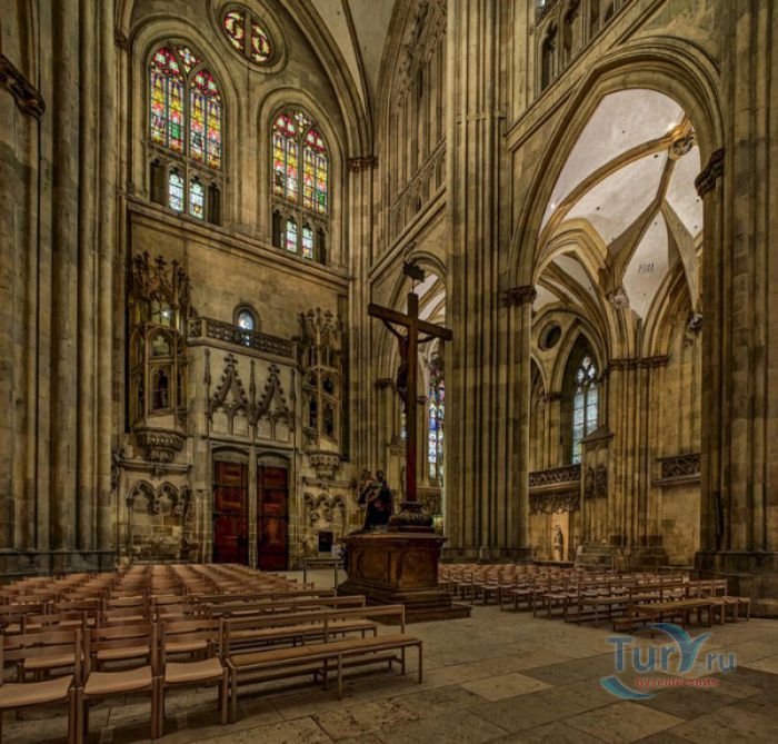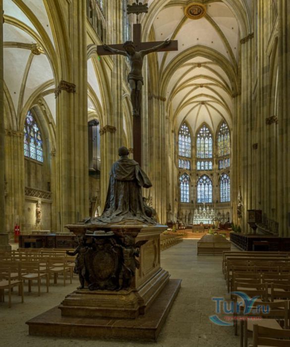 Кафедральный Собор Святого Петра в Регенсбурге (Регенсбургский Собор) расположен в историческом центре (Старом городе) Регенсбурга, в составе которого в 2006 году внесен в список Всемирного наследия ЮНЕСКО. Возведение Регенсбургского собора было начато в 1273 году и продолжалось, до окончательного его завершения, почти 250 лет. Уже в VII веке на месте нынешнего собора стояла романская церковь, которая на протяжении веков неоднократно разрушалась, восстанавливалась и перестраивалась. В 1250 году сильный пожар снова уничтожил здание церкви, и Регенсбургская епархия принимает решение о строительстве на её месте нового собора в стиле Высокой готики. Поскольку работы велись очень долго, на строительстве собора сменился ни один архитектор, каждый из которых внёс свою лепту во внешний облик здания. В результате фасад здания выглядит несколько разобщённым - отличаются как строительный материал, используемый при возведении собора (известняк, зелёный песчаник и снова известняк), так и декоративные элементы здания. Полностью работы были завершены в 1520 году, к этому времени здание собора представляло собой трёхневную базилику без трансепта. Длина фасада составляет 86 метров, ширина – 35 метров. Главный, западный, портал собора, построенный в 1415 году, богато украшен статуями святых, барельефами, резными стрельчатыми архивольтами, обрамляющими арочные проёмы, и ажурными каменными решётками. На тимпане правого портала располагается скульптурная композиция, на которой изображена сцена освобождения ангелом святого Петра, заключённого в темницу. Кроме того, на фасадах здания размещены статуи языческих властителей четырёх мировых империй - вавилонского царя Навуходоносора, верхом на медведе, македонского царя Александра Великого, сидящего на пантере, римского императора Августа, восседающего на единороге, и персидского царя Кира - на льве. Единственным сохранившимся элементом романской церкви является северная башня Эзельстурм, которую не стали сносить, так как использовали её для подъёма строительных материалов при возведении нового собора. До середины XIX века западные неоготические башни собора имели только три этажа, в 1859-1869 годах, по указу короля Людвига I, они были надстроены и увенчаны высокими остроконечными шпилями - высота башен, таким образом, стала равняться 105 метрам. Интерьер собора также богато украшен колоннами и скульптурными композициями, среди которых - сцена Благовещения (1280 год), располагающаяся на колоннах средокрестия, знаменитая статуя "Улыбающегося ангела", статуи святых Петра и Павла (всего в соборе насчитывается более 100 изображений Святого Петра), а также скульптурная композиция "Чёрт и его бабушка". Главная достопримечательность Регенсбургского собора - оригинальные готические витражи, украшающие окна клироса, поперечной части и боковых продольных нефов. Большинство витражей датируются 1220-1370 годами, они выполнены из мелких кусочков цветного стекла, скреплённых свинцовыми прутьями. Витражи на окнах западного фасада появились уже в XIX столетии. В центральном нефе установлен великолепный серебряный алтарь, выполненный в 1695-1785 годах ювелирами из Аугсбурга. Позади главного алтаря находится кафедра епископа Регенсбурга. На протяжении веков собор служил местом захоронения епископов и знатных горожан, в клуатре 