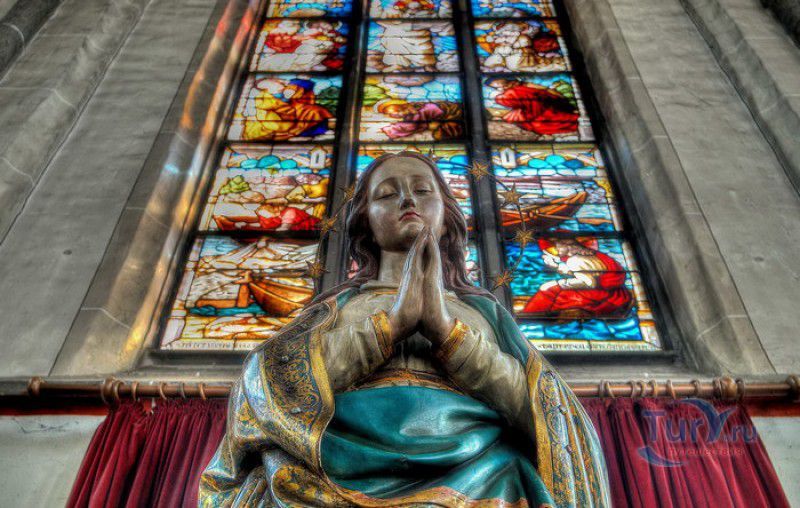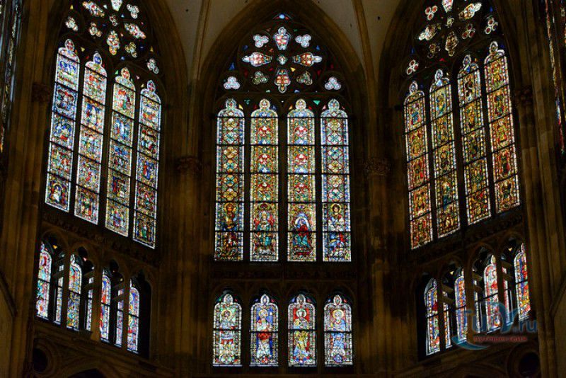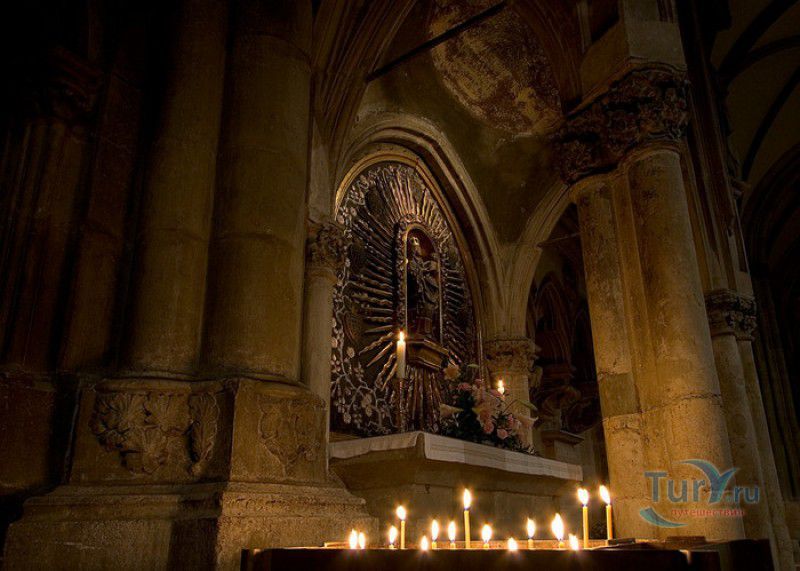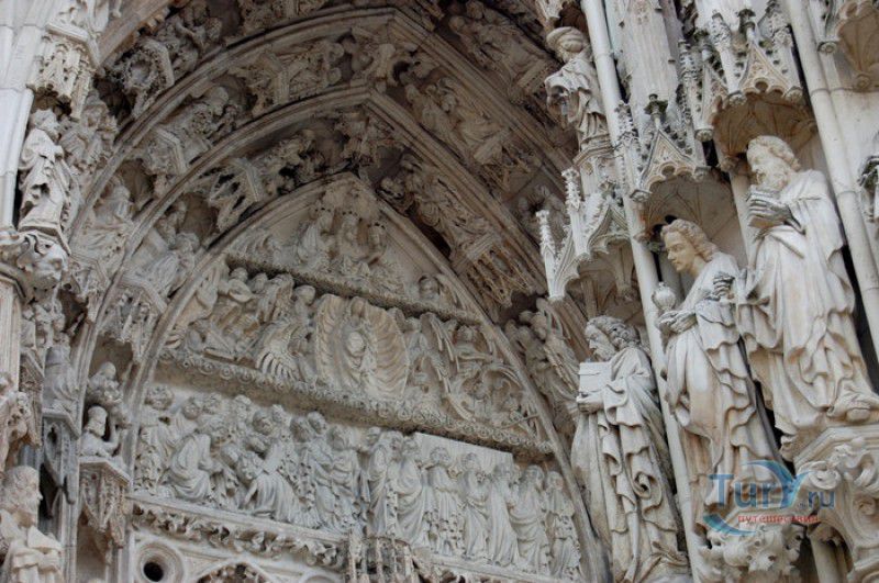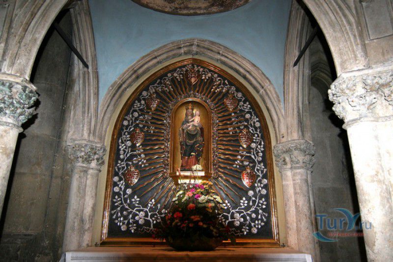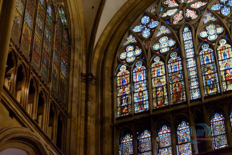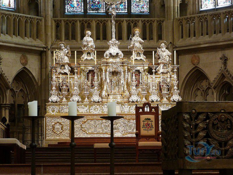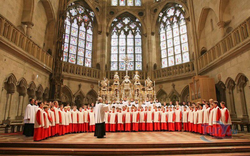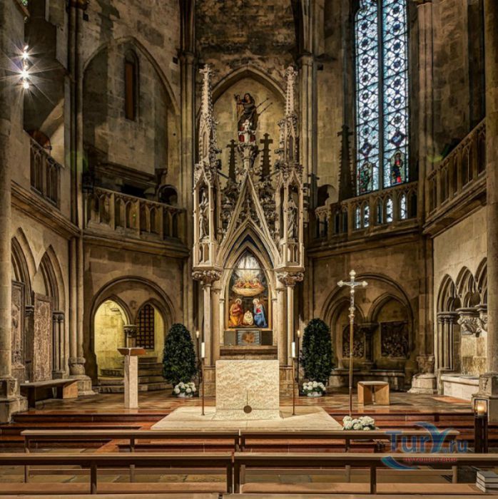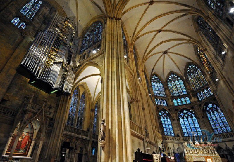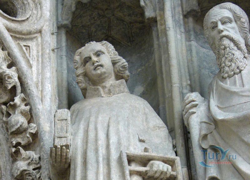 Кафедральный Собор Святого Петра в Регенсбурге (Регенсбургский Собор) расположен в историческом центре (Старом городе) Регенсбурга, в составе которого в 2006 году внесен в список Всемирного наследия ЮНЕСКО. Возведение Регенсбургского собора было начато в 1273 году и продолжалось, до окончательного его завершения, почти 250 лет. Уже в VII веке на месте нынешнего собора стояла романская церковь, которая на протяжении веков неоднократно разрушалась, восстанавливалась и перестраивалась. В 1250 году сильный пожар снова уничтожил здание церкви, и Регенсбургская епархия принимает решение о строительстве на её месте нового собора в стиле Высокой готики. Поскольку работы велись очень долго, на строительстве собора сменился ни один архитектор, каждый из которых внёс свою лепту во внешний облик здания. В результате фасад здания выглядит несколько разобщённым - отличаются как строительный материал, используемый при возведении собора (известняк, зелёный песчаник и снова известняк), так и декоративные элементы здания. Полностью работы были завершены в 1520 году, к этому времени здание собора представляло собой трёхневную базилику без трансепта. Длина фасада составляет 86 метров, ширина – 35 метров. Главный, западный, портал собора, построенный в 1415 году, богато украшен статуями святых, барельефами, резными стрельчатыми архивольтами, обрамляющими арочные проёмы, и ажурными каменными решётками. На тимпане правого портала располагается скульптурная композиция, на которой изображена сцена освобождения ангелом святого Петра, заключённого в темницу. Кроме того, на фасадах здания размещены статуи языческих властителей четырёх мировых империй - вавилонского царя Навуходоносора, верхом на медведе, македонского царя Александра Великого, сидящего на пантере, римского императора Августа, восседающего на единороге, и персидского царя Кира - на льве. Единственным сохранившимся элементом романской церкви является северная башня Эзельстурм, которую не стали сносить, так как использовали её для подъёма строительных материалов при возведении нового собора. До середины XIX века западные неоготические башни собора имели только три этажа, в 1859-1869 годах, по указу короля Людвига I, они были надстроены и увенчаны высокими остроконечными шпилями - высота башен, таким образом, стала равняться 105 метрам. Интерьер собора также богато украшен колоннами и скульптурными композициями, среди которых - сцена Благовещения (1280 год), располагающаяся на колоннах средокрестия, знаменитая статуя "Улыбающегося ангела", статуи святых Петра и Павла (всего в соборе насчитывается более 100 изображений Святого Петра), а также скульптурная композиция "Чёрт и его бабушка". Главная достопримечательность Регенсбургского собора - оригинальные готические витражи, украшающие окна клироса, поперечной части и боковых продольных нефов. Большинство витражей датируются 1220-1370 годами, они выполнены из мелких кусочков цветного стекла, скреплённых свинцовыми прутьями. Витражи на окнах западного фасада появились уже в XIX столетии. В центральном нефе установлен великолепный серебряный алтарь, выполненный в 1695-1785 годах ювелирами из Аугсбурга. Позади главного алтаря находится кафедра епископа Регенсбурга. На протяжении веков собор служил местом захоронения епископов и знатных горожан, в клуатре 