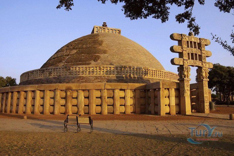 Великая Ступа в Санчи расположена в индийском штате Мадхья-Прадеш, в 45 километрах к северо-востоку от города Бхопал, в деревне Санчи, в которой до наших дней сохранился комплекс памятников ранней индийской буддистской архитектуры. Главной достопримечательностью Санчи является Великая ступа, которая считается старейшим каменным сооружением в Индии. Ступа была возведена в III веке до нашей эры по приказу императора Ашоки, при котором буддизм в Индии был признан государством религией. Ступа имеет полусферическую форму и символизирует священную гору Меру (в космологии буддизма - центр всех материальных и духовных вселенных). Высота Великой ступы - 16,5 метров, диаметр основания - 36,6 метров, она установлена на высоком цоколе и окружена большой террасой, служившей местом для проведения религиозных церемоний. С южной стороны на террасу можно подняться по каменной лестнице. Внутреннее помещение в Великой Ступе отсутствует, согласно преданию, в каменном "теле" ступы запечатаны мощи самого Будды. В середине II века до нашей эры Великая ступа была увеличена, полусферу увенчала дарохранительница с каменным шпилем и нанизанными на него тремя зонтиками, символизирующими ступени восхождения к вершине неба. В I веке до нашей эры, во время правления династии Сатаваханов, вокруг ступы была возведена каменная ограда с четырьмя парадными воротами (торанами), ориентированными по сторонам света. Каждые из ворот представляют собой две массивные квадратные колонны, перекрытые тремя каменными балками с вырезанными с обеих концов спиралями (по подобию священных буддийских свитков-сутр). Капители колонн выполнены в виде фигур четырёх слонов, львов или карликов-якш, поддерживающих поперечные балки. Вся поверхность ворот покрыта ажурной каменной резьбой, письменами и рельефами, промежутки между балками и верхняя часть ворот украшены скульптурами. Через ворота в святилище входили торжественные процессии для совершения священного обряда. Санчи продолжал оставаться крупным буддистским религиозным центром вплоть до XII века, вокруг Великой ступы были построены храмы, монастыри и несколько ступ меньших размеров. После утверждения в Центральной Индии ислама, буддистские святыни, в том числе и Великая ступа в Санчи, постепенно приходили в упадок и разрушались. Заброшенная на протяжении столетий древнейшая в Индии ступа была обнаружена в 1818 году англичанами. В Санчи сразу же устремились толпы чёрных археологов и кладоискателей - то, что не удалось сделать времени, за короткое время сделали люди - буддистские памятники в Санчи были разграблены и сильно повреждены. Только в 1881 году здесь были начаты реставрационные работы, в 1912-1919 годах проведены полномасштабные восстановительные работы под руководством известного английского археолога сэра Джона Маршалла. В 1989 году Великая ступа, в составе памятников раннебуддисткой архитектуры в Санчи, была внесена в список Всемирного наследия ЮНЕСКО.