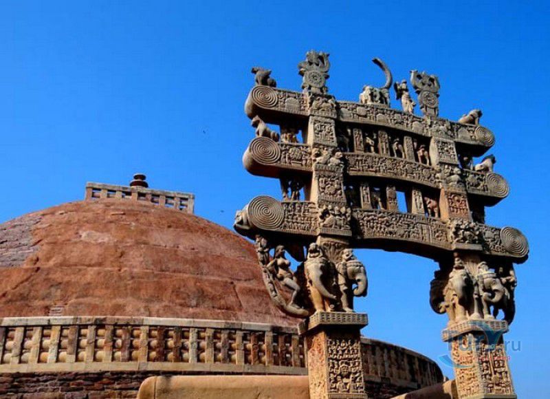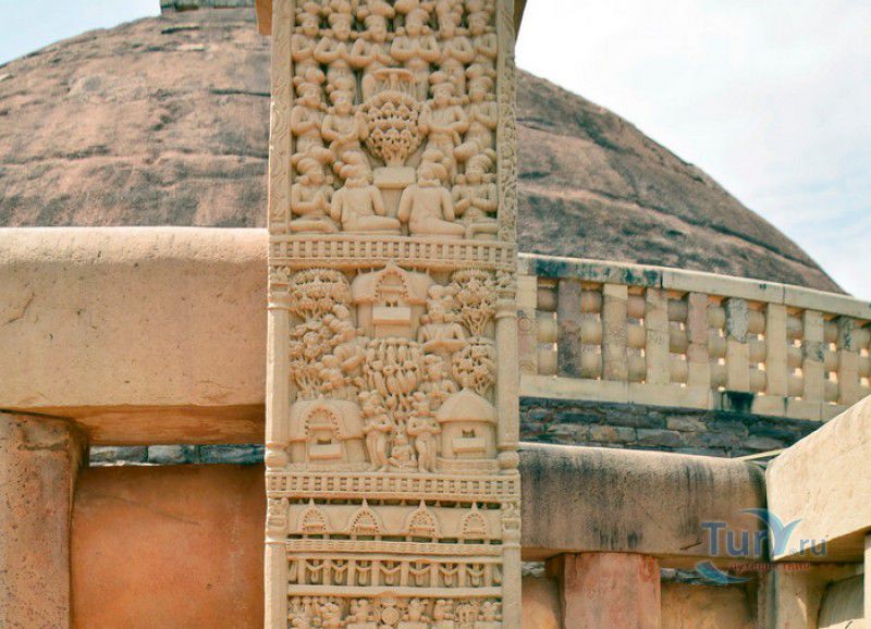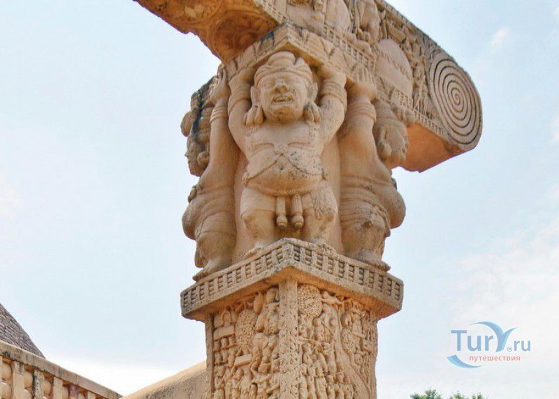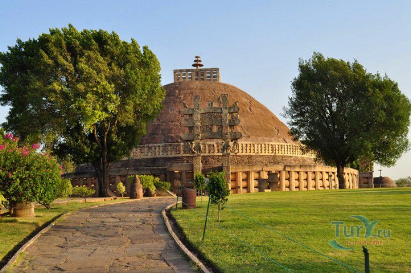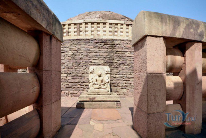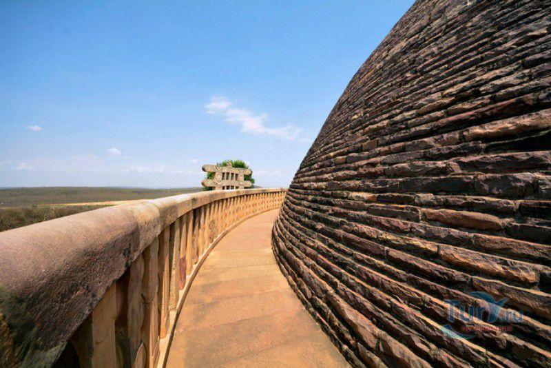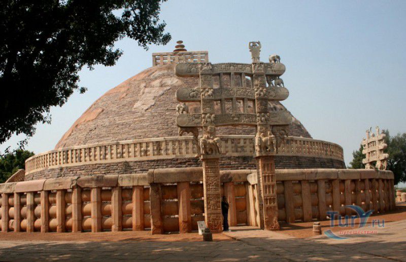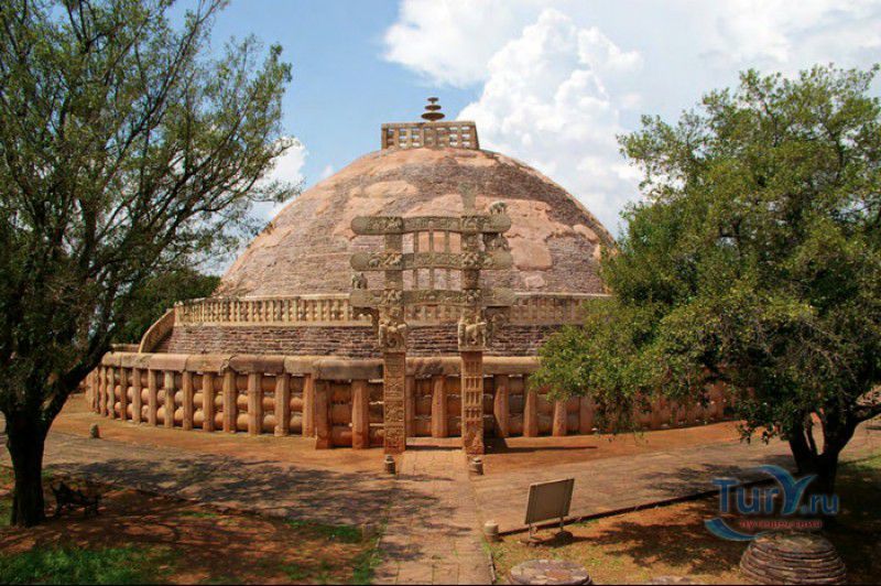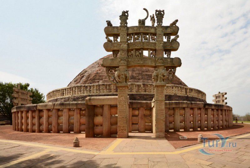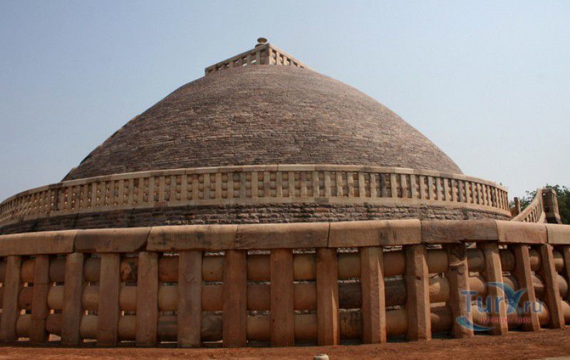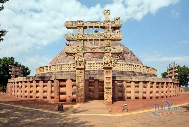 Великая Ступа в Санчи расположена в индийском штате Мадхья-Прадеш, в 45 километрах к северо-востоку от города Бхопал, в деревне Санчи, в которой до наших дней сохранился комплекс памятников ранней индийской буддистской архитектуры. Главной достопримечательностью Санчи является Великая ступа, которая считается старейшим каменным сооружением в Индии. Ступа была возведена в III веке до нашей эры по приказу императора Ашоки, при котором буддизм в Индии был признан государством религией. Ступа имеет полусферическую форму и символизирует священную гору Меру (в космологии буддизма - центр всех материальных и духовных вселенных). Высота Великой ступы - 16,5 метров, диаметр основания - 36,6 метров, она установлена на высоком цоколе и окружена большой террасой, служившей местом для проведения религиозных церемоний. С южной стороны на террасу можно подняться по каменной лестнице. Внутреннее помещение в Великой Ступе отсутствует, согласно преданию, в каменном "теле" ступы запечатаны мощи самого Будды. В середине II века до нашей эры Великая ступа была увеличена, полусферу увенчала дарохранительница с каменным шпилем и нанизанными на него тремя зонтиками, символизирующими ступени восхождения к вершине неба. В I веке до нашей эры, во время правления династии Сатаваханов, вокруг ступы была возведена каменная ограда с четырьмя парадными воротами (торанами), ориентированными по сторонам света. Каждые из ворот представляют собой две массивные квадратные колонны, перекрытые тремя каменными балками с вырезанными с обеих концов спиралями (по подобию священных буддийских свитков-сутр). Капители колонн выполнены в виде фигур четырёх слонов, львов или карликов-якш, поддерживающих поперечные балки. Вся поверхность ворот покрыта ажурной каменной резьбой, письменами и рельефами, промежутки между балками и верхняя часть ворот украшены скульптурами. Через ворота в святилище входили торжественные процессии для совершения священного обряда. Санчи продолжал оставаться крупным буддистским религиозным центром вплоть до XII века, вокруг Великой ступы были построены храмы, монастыри и несколько ступ меньших размеров. После утверждения в Центральной Индии ислама, буддистские святыни, в том числе и Великая ступа в Санчи, постепенно приходили в упадок и разрушались. Заброшенная на протяжении столетий древнейшая в Индии ступа была обнаружена в 1818 году англичанами. В Санчи сразу же устремились толпы чёрных археологов и кладоискателей - то, что не удалось сделать времени, за короткое время сделали люди - буддистские памятники в Санчи были разграблены и сильно повреждены. Только в 1881 году здесь были начаты реставрационные работы, в 1912-1919 годах проведены полномасштабные восстановительные работы под руководством известного английского археолога сэра Джона Маршалла. В 1989 году Великая ступа, в составе памятников раннебуддисткой архитектуры в Санчи, была внесена в список Всемирного наследия ЮНЕСКО.