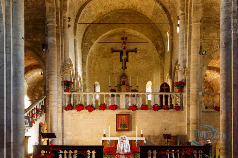 Кафедральный Собор Сан-Лео расположен в историческом центре города Сан-Лео, рядом с приходской церковью Вознесения Девы Марии и старинной городской башней-колокольней. Первый собор в Сан-Лео был построен в VII веке - в это время была создана епархия Монтефельтро. Причины, по которым этот собор был разрушен, остались неизвестными. В 1173 году на фундаменте старого здания был возведен новый собор в романском стиле, о чём свидетельствует надпись, выбитая на одном из столбов в трансепте. Здание собора построено из блоков, вырезанных из песчаника. Снаружи массивные стены храма окрашены в серый цвет, внутренняя поверхность стен покрыта охряной краской. Дневной свет внутрь храма проникает через небольшие окна, напоминающие бойницы, поэтому в соборе всегда царит полумрак. Трёхнефное здание собора с трансептом, тремя апсидами и криптой в плане имеет форму латинского креста. Вход в собор расположен со стороны бокового фасада, портал украшен скульптурными бюстами Святого Лео (Льва) и Святого Валентина, оставшимися от собора VII века. Внутреннее пространство разделено массивными арками, опирающимися на колонны и мраморные столбы, украшенные коринфскими капителями. Эти столбы были найдены на развалинах античного храма, построенного в Монтефельтро ещё древними римлянами. В пресвитерии, в который можно подняться по мраморной лестнице, украшенной балюстрадой, находится большое распятие, подаренное собору в 1205 году графом Монтефельтро. Склеп Кафедрального собора Сан-Лео, освящённый в честь Святого Петра, - самая старая часть собора. Он расположен под трансептом, выполнен в романском стиле, его внутреннее пространство разделено полукруглыми арками, поддерживающими массивные каменные своды. Когда-то в склепе собора хранились мощи Святого Лео, но в начале XI столетия саркофаг с останками святого был вывезен по приказу императора Священной Римской империи Генриха II Святого. Генрих II планировал перевезти мощи Святого Льва в Германию, но, согласно легенде, кони, на которых перевозили саркофаг, остановились возле города Феррара, и сдвинуть их с места никому не удалось. С 1083 года мощи Святого Лео хранятся в церкви Святого Стефана в Ферраре, а крышка от каменного саркофага, в котором находились останки основателя первой христианской общины в Монтефельтро, была возвращена в Кафедральный собор Сан-Лео. Саркофаг был изготовлен в V-VI веках, на крышке выбиты христианские символы - Колесо Жизни (символ Иисуса Христа) и голуби (символ Святого Духа). В Кафедральном соборе Сан-Лео проходят концерты органной и классической музыки, пользующиеся большой популярностью среди жителей и гостей города Сан-Лео.