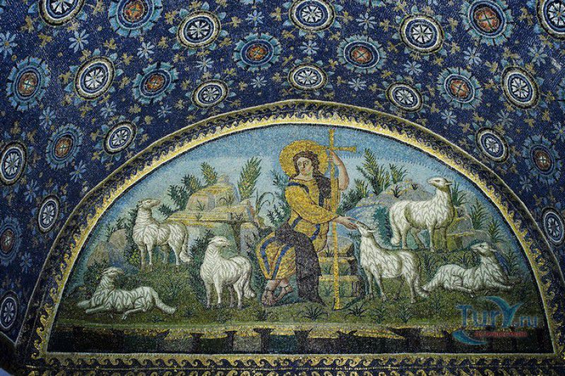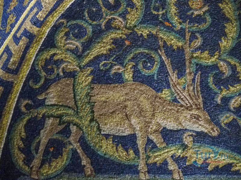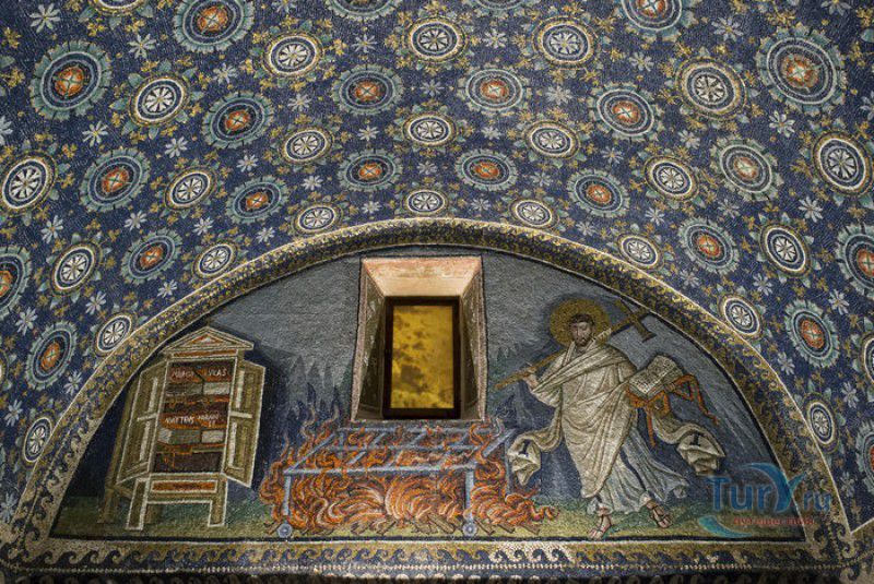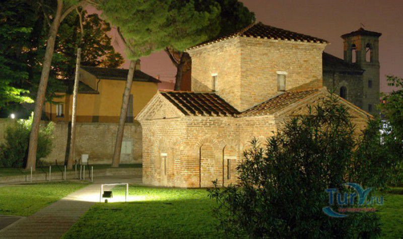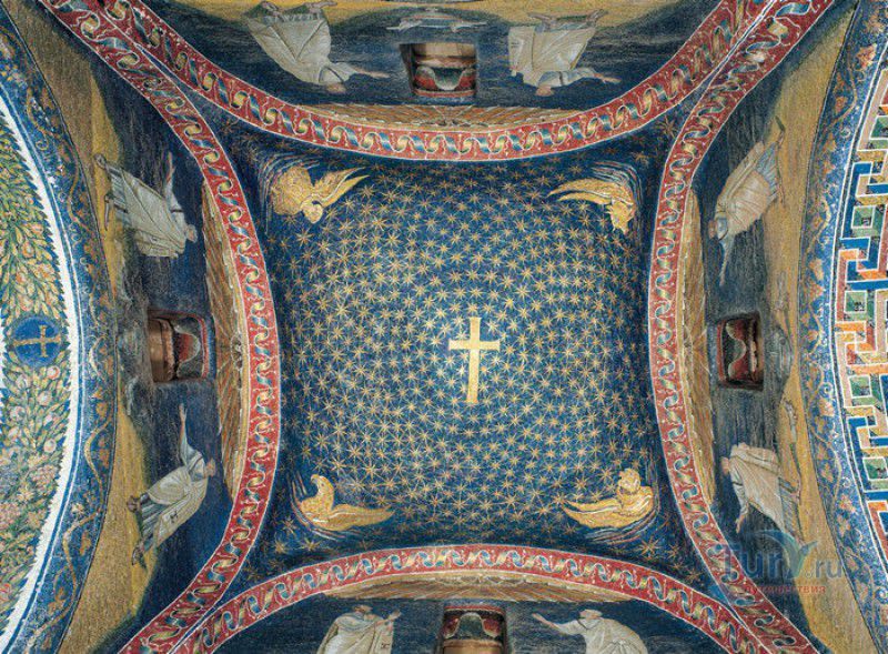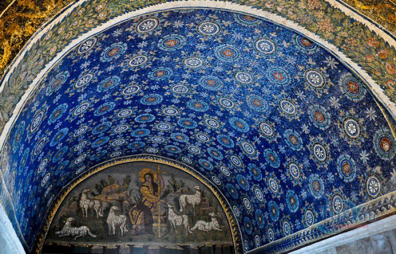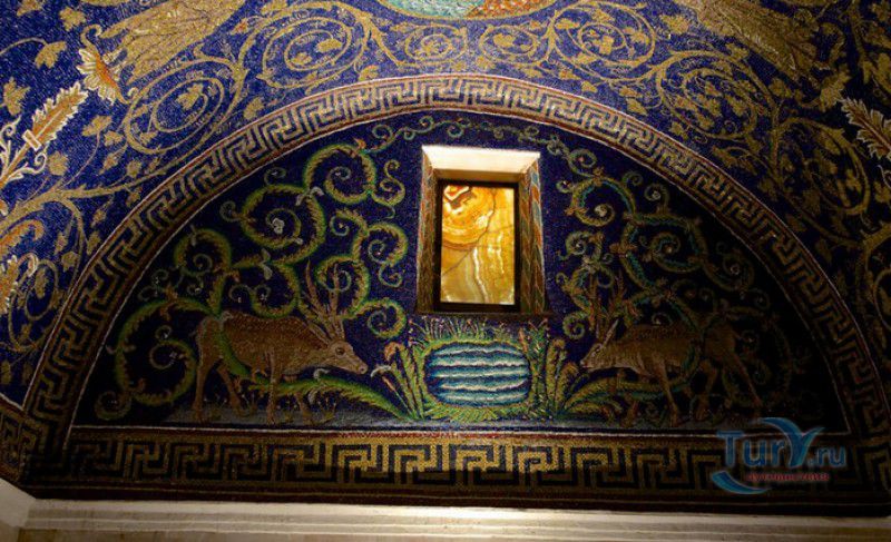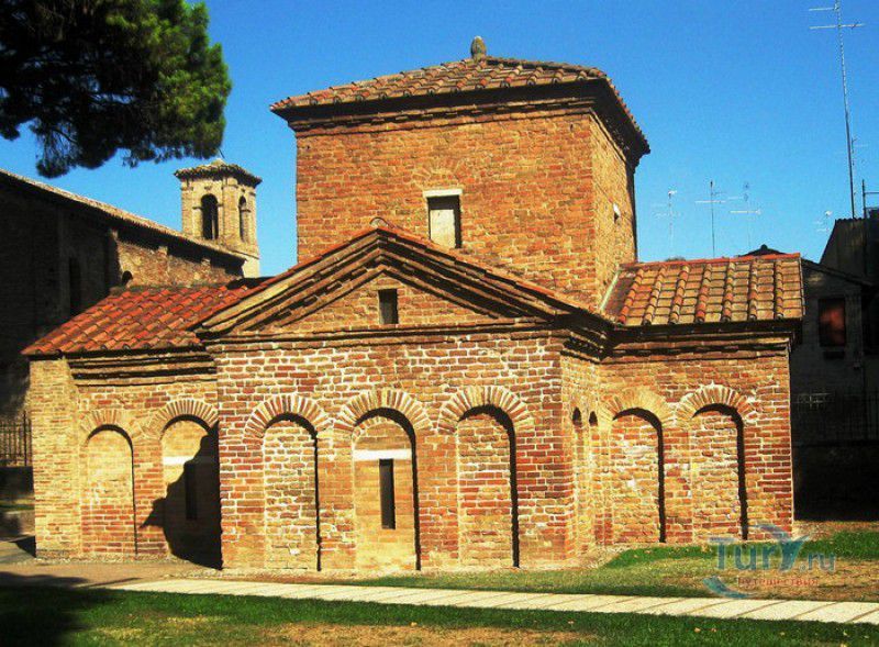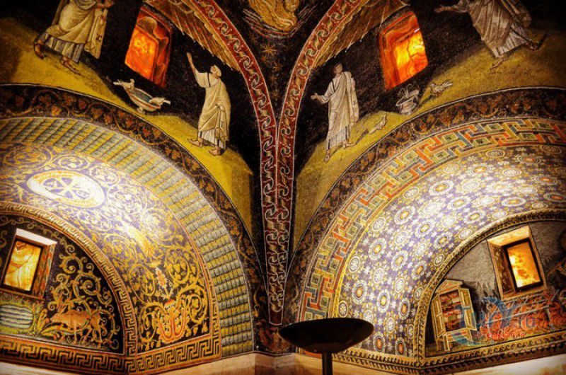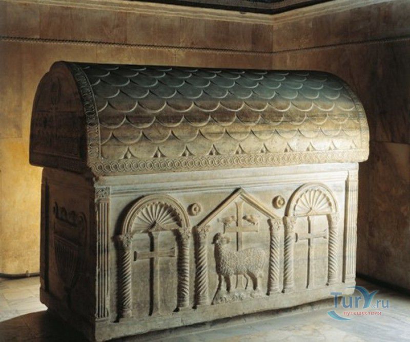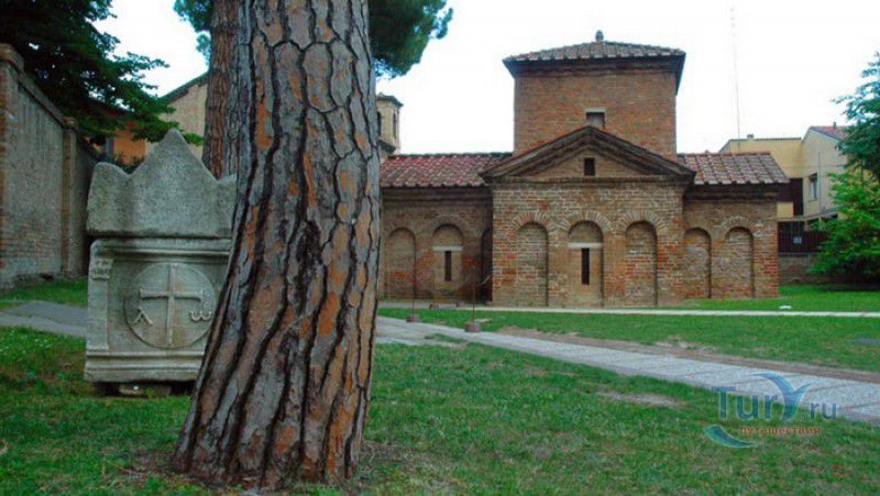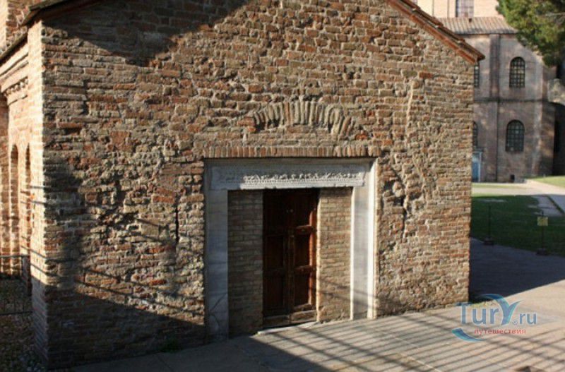 Мавзолей Галлы Плацидии - памятник раннехристианской архитектуры, одна из главных достопримечательностей Равенны, расположен в историческом центре города, рядом с базиликой Сан-Витале. Мавзолей был построен в 425-450 годах по приказу Галлы Плацидии - дочери римского императора Феодосия Великого. В 417 году Галла Плацидия была выдана замуж за Флавия Констанция, ставшего соправителем её брата - римского императора Гонория, а сама Плацидия получила титул августы (императрицы). В 425 году, после смерти Гонория и Констанция, 7-летний сын Галлы Плацидии Валентиниан был провозглашён в Риме императором, и с этого времени, вплоть до его совершеннолетия, Галла Плацидия единолично правила Западной Римской империей. Она принимала активное участие в утверждении христианской веры в империи, жертвовала большие средства храмам. Мавзолей, который был построен в Равенне по приказу Галлы Плацидии, и носит её имя, скорей всего был капеллой-молельней, посвящённой великомученику Лаврентию, особо почитавшемуся в роду Галлы Плацидии. Как бы то ни было, Галла Плацидия никогда не была похоронена в этом мавзолее - она умерла в Риме в 450 году и погребена в родовой усыпальнице императора Феодосия Великого, расположенной недалеко от собора Святого Петра. Мавзолей представляет собой небольшое крестово-купольное здание, в плане имеющее форму латинского креста. Кирпичное здание построено в ломбардском стиле, мощные стены сооружения украшены вертикальными выступами со слепыми арками, на главном фасаде есть фриз с изображением двух пантер и виноградных лоз, узкие окна здания напоминают бойницы. Венчает мавзолей Галлы Плацидии кубическая башня с внутренним полусферическим куполом. Вся красота мавзолея находится внутри здания - пол и нижняя часть стен облицованы мрамором, а поверхности купола, арок, люнет и верхней части стен покрыты мозаиками. Несмотря на то, что мозаики посвящены различным историческим и библейским сюжетам, все вместе они создают органичное единство. Особого внимания заслуживает насыщенно-синяя мозаика внутреннего купола мавзолея - в центре помещён золотой латинский крест, окружённый восемьюстами золотыми звёздами, объединёнными в концентрические окружности. Вся композиция представляет собой ночное небо и олицетворяет торжество Иисуса Христа над смертью. По углам расположены аллегорические изображения четырёх евангелистов - Марка (в виде льва), Луки (в виде тельца), Иоанна Богослова (в виде орла) и Матфея (в виде ангела). Сложный мозаичный орнамент, покрывающий потолок, символизирует райский сад. В верхних люнетах помещены парные изображения восьми апостолов - ученики Христа представлены в полный рост с руками, воздетыми к изображённому на потолке кресту. На мозаике северного нижнего люнета изображён Иисус в образе пастыря, в южном нижнем люнете изображены библейские персонажи, в том числе и Святой Лаврентий, идущий на сожжение. В мавзолее установлены три мраморных саркофага, предположительно изготовленные для самой Галлы Плацидии, её сына Валентиниана и супруга Констанция. В этих саркофагах действительно находились останки погребённых людей. В саркофаге Галлы Плацидии, якобы, находилось тело богатого и знатного язычника, "сидящего" на кипарисовом троне - оно сгорело в 1577 году в результате неосторожного обращения с огнём любопытст
