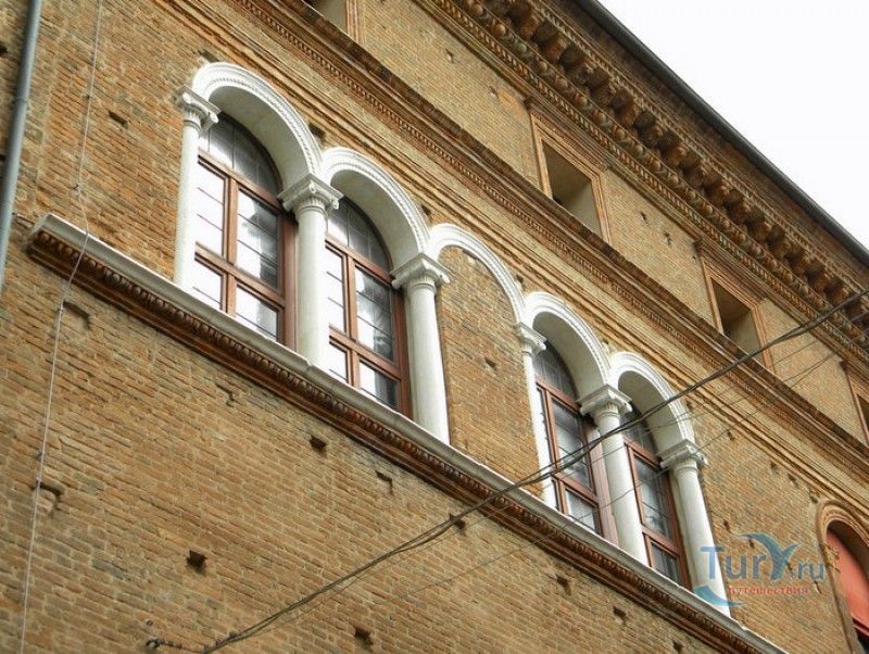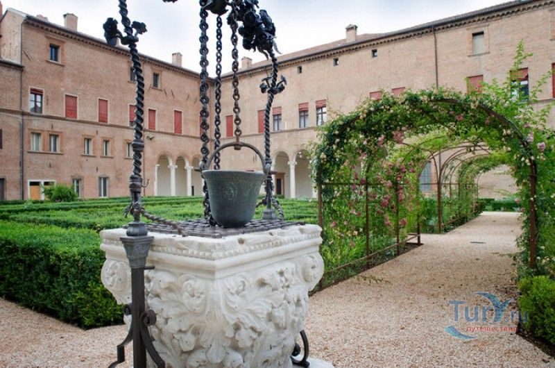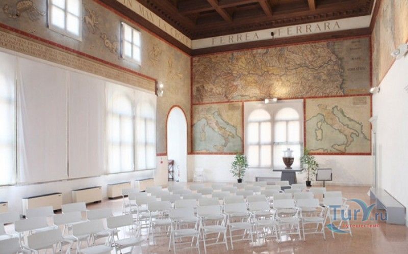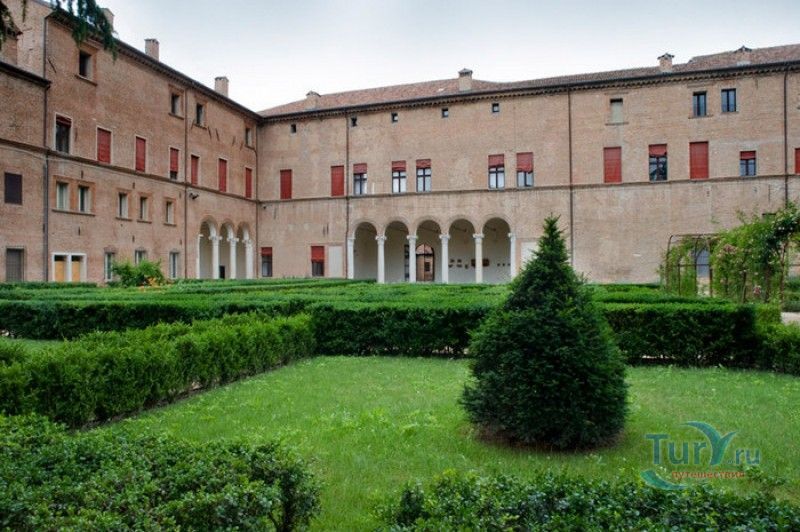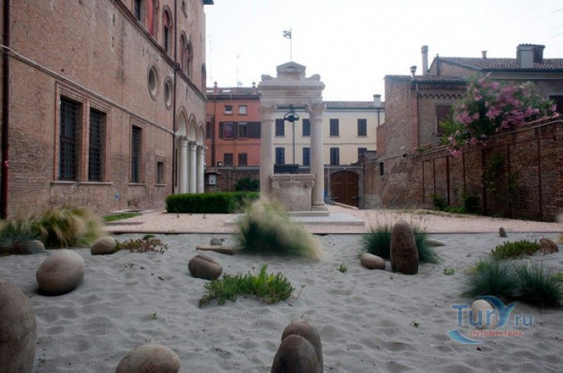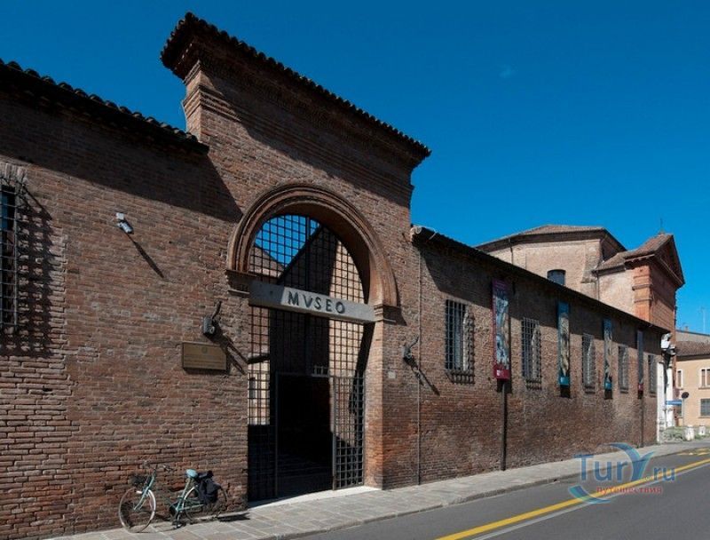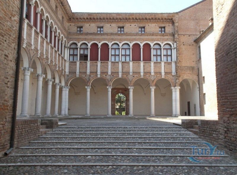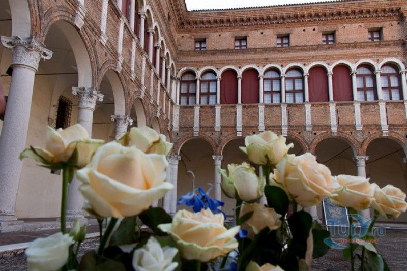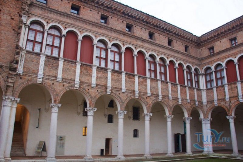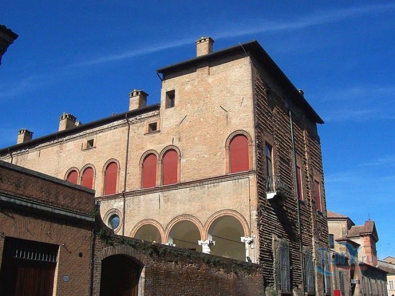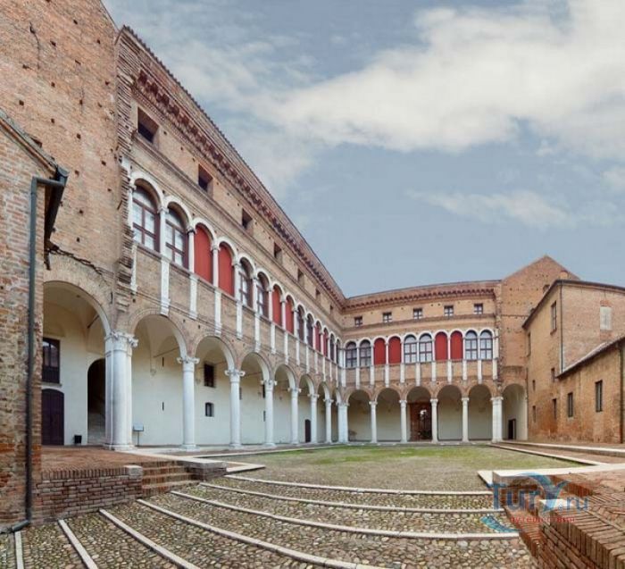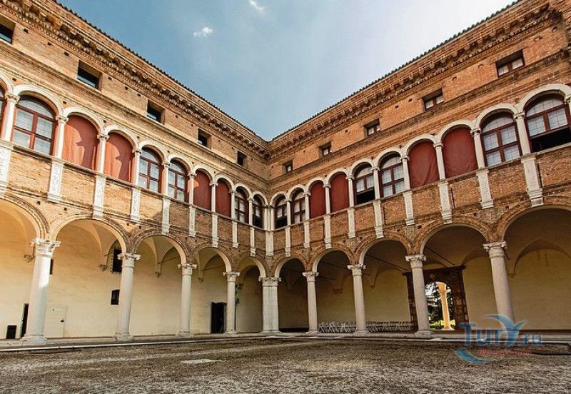 Дворец Костабили (Национальный Археологический Музей Феррары) расположен в историческом центре города Феррара, в составе которого внесен в список Всемирного наследия ЮНЕСКО. Дворец в стиле Ренессанс был построен для Антонио Костабили - официального посла и секретаря герцога Миланского Людовико Мария Сфорца (Людовико иль Моро), представлявшего его интересы при дворе Эрколе I д'Эсте. Часто дворец называют Палаццо Людовико или Моро, так как некоторые исторические источники утверждали, что дворец был построен для самого Людовико Сфорца, женатого на Беатриче д'Эсте, и рассчитывавшего, в случае изгнания из Милана, найти приют у родственников своей супруги - правителей Феррары. Строительство дворца было поручено выдающемуся архитектору эпохи Возрождения Бьяджо Россетти, построившему не одно здание в Ферраре. Работы велись в 1495-1504 годах, на строительстве работали 1500 каменщиков, штукатуров и других мастеров, однако, грандиозный замысел архитектора так и остался незавершённым. Дворец Костабили состоит из нескольких зданий, соединённых между собой. Кирпичный фасад палаццо, выходящий на улицу, практически лишён каких-либо декоративных украшений, зато парадный внутренний двор представляет собой шедевр ренессансной архитектуры. По периметру двора проходит двойная галерея, полностью завершённая только с двух сторон. Нижний ярус представляет собой открытую аркаду, опирающуюся на мраморные колонны с коринфскими капителями. Аркада верхнего яруса галереи, опирающаяся на тонкие мраморные колонки, изначально вся состояла из попарно чередующихся открытых и закрытых пролётов-окон. Во время реставрации 1930-х годов все окна были открыты и застеклены, поэтому сейчас, чтобы дать представление о прежнем облике палаццо, бывшие "слепые" окна занавешены красными шторами. Во дворе палаццо был разбит сад в стиле Ренессанс, полностью воссозданный в первоначальном виде в 2009-2010 годах. От великолепного убранства внутренних помещений до наших дней сохранилась монументальная мраморная лестница, ведущая с первого на второй этаж, работы скульптора-каменщика Габриэле Фризони, выполнявшего заказы Бьяджо Россетти по оформлению многочисленных герцогских дворцов в Ферраре. Из залов дворца особого внимания заслуживает Зал Сокровищ, который использовался в качестве музыкального салона или библиотеки, а также для хранения собрания произведений искусства. Потолок и верхнюю часть стен зала украшает огромная фреска, выполненная в 1503-1506 годах Бенвенуто Тизи (Гарофало) - выдающимся представителем феррарской школы живописи эпохи Возрождения. Роспись выполнена по подобию знаменитой комнаты Камера Пикта (Брачный чертог) в Палаццо Дукале в Мантуе, расписанной фресками Андреа Мантеньи. Потолочный плафон представлен в виде открытого балкона с балюстрадой, на которой "вывешены" яркие восточные ковры. На балконе изображены городские жители и придворные, многие - с музыкальными инструментами. Над головой у них - беседка, увитая ветвями фруктовых деревьев и украшенная фризом с медальонами, на которых изображены сцены из мифов древнего Рима. Под потолочным плафоном располагаются люнеты, на которых изображены сцены из мифов об Эросе и Антеросе. После того, как в конце XVI века скончался последний прямой наследник рода Костабили, дворец сменил множество владельцев. 