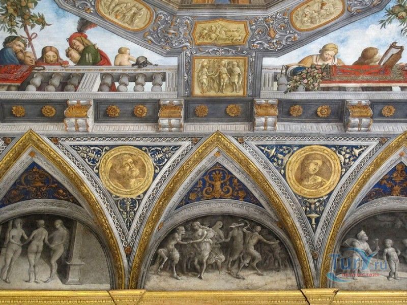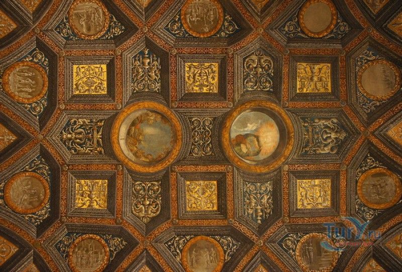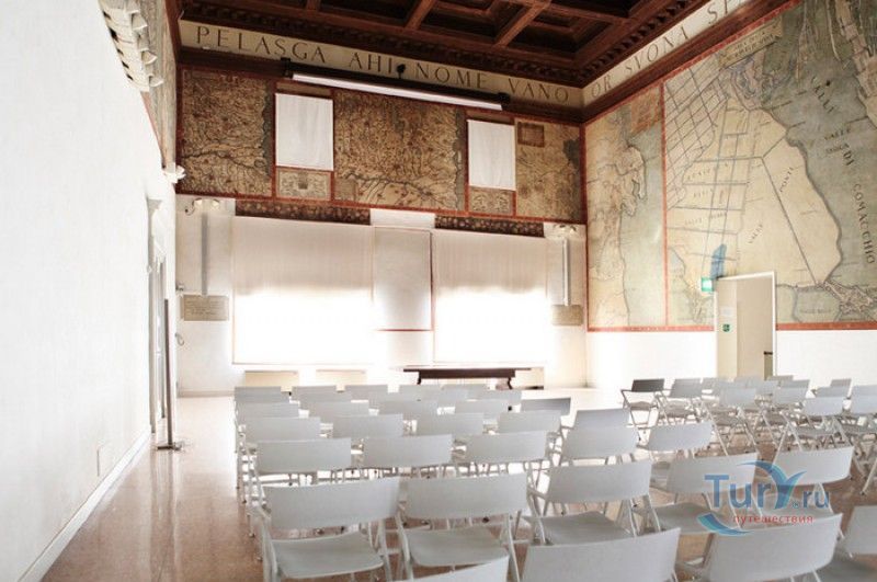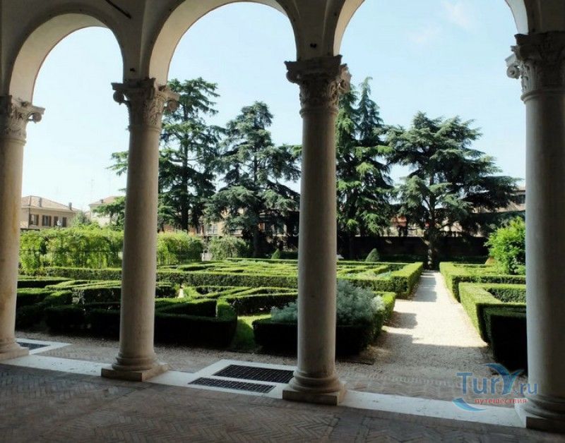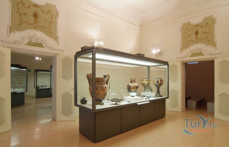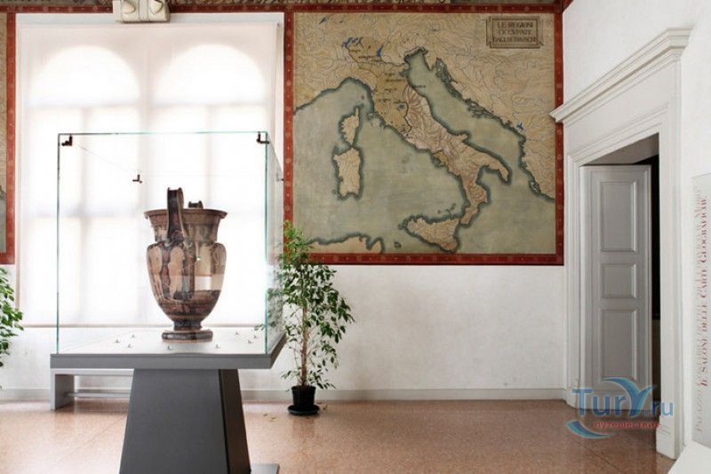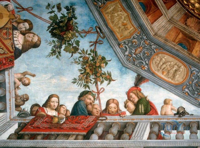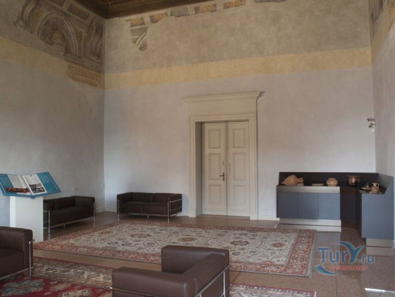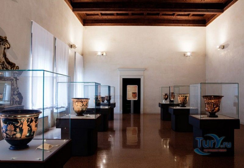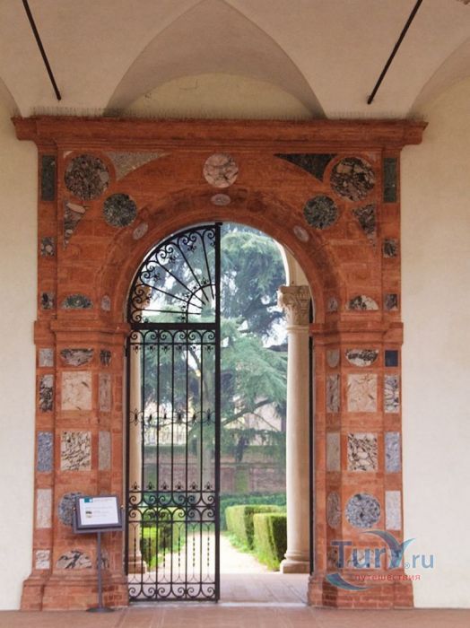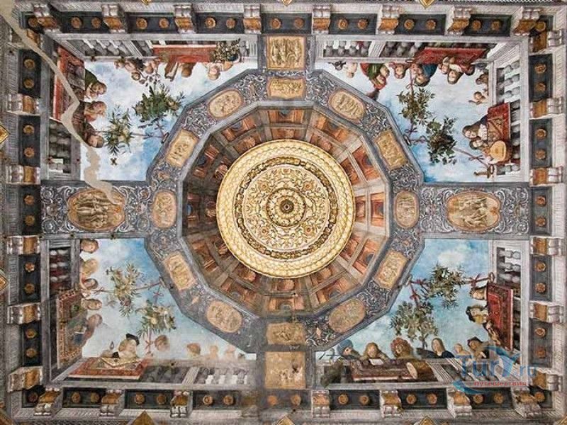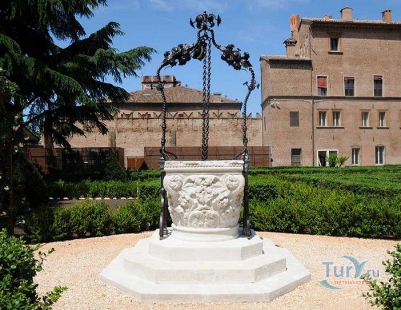 Дворец Костабили (Национальный Археологический Музей Феррары) расположен в историческом центре города Феррара, в составе которого внесен в список Всемирного наследия ЮНЕСКО. Дворец в стиле Ренессанс был построен для Антонио Костабили - официального посла и секретаря герцога Миланского Людовико Мария Сфорца (Людовико иль Моро), представлявшего его интересы при дворе Эрколе I д'Эсте. Часто дворец называют Палаццо Людовико или Моро, так как некоторые исторические источники утверждали, что дворец был построен для самого Людовико Сфорца, женатого на Беатриче д'Эсте, и рассчитывавшего, в случае изгнания из Милана, найти приют у родственников своей супруги - правителей Феррары. Строительство дворца было поручено выдающемуся архитектору эпохи Возрождения Бьяджо Россетти, построившему не одно здание в Ферраре. Работы велись в 1495-1504 годах, на строительстве работали 1500 каменщиков, штукатуров и других мастеров, однако, грандиозный замысел архитектора так и остался незавершённым. Дворец Костабили состоит из нескольких зданий, соединённых между собой. Кирпичный фасад палаццо, выходящий на улицу, практически лишён каких-либо декоративных украшений, зато парадный внутренний двор представляет собой шедевр ренессансной архитектуры. По периметру двора проходит двойная галерея, полностью завершённая только с двух сторон. Нижний ярус представляет собой открытую аркаду, опирающуюся на мраморные колонны с коринфскими капителями. Аркада верхнего яруса галереи, опирающаяся на тонкие мраморные колонки, изначально вся состояла из попарно чередующихся открытых и закрытых пролётов-окон. Во время реставрации 1930-х годов все окна были открыты и застеклены, поэтому сейчас, чтобы дать представление о прежнем облике палаццо, бывшие "слепые" окна занавешены красными шторами. Во дворе палаццо был разбит сад в стиле Ренессанс, полностью воссозданный в первоначальном виде в 2009-2010 годах. От великолепного убранства внутренних помещений до наших дней сохранилась монументальная мраморная лестница, ведущая с первого на второй этаж, работы скульптора-каменщика Габриэле Фризони, выполнявшего заказы Бьяджо Россетти по оформлению многочисленных герцогских дворцов в Ферраре. Из залов дворца особого внимания заслуживает Зал Сокровищ, который использовался в качестве музыкального салона или библиотеки, а также для хранения собрания произведений искусства. Потолок и верхнюю часть стен зала украшает огромная фреска, выполненная в 1503-1506 годах Бенвенуто Тизи (Гарофало) - выдающимся представителем феррарской школы живописи эпохи Возрождения. Роспись выполнена по подобию знаменитой комнаты Камера Пикта (Брачный чертог) в Палаццо Дукале в Мантуе, расписанной фресками Андреа Мантеньи. Потолочный плафон представлен в виде открытого балкона с балюстрадой, на которой "вывешены" яркие восточные ковры. На балконе изображены городские жители и придворные, многие - с музыкальными инструментами. Над головой у них - беседка, увитая ветвями фруктовых деревьев и украшенная фризом с медальонами, на которых изображены сцены из мифов древнего Рима. Под потолочным плафоном располагаются люнеты, на которых изображены сцены из мифов об Эросе и Антеросе. После того, как в конце XVI века скончался последний прямой наследник рода Костабили, дворец сменил множество владельцев. 