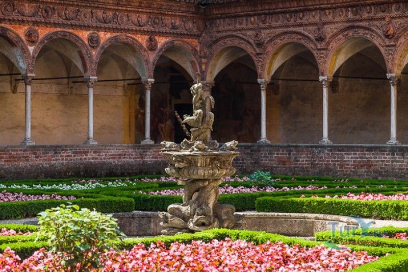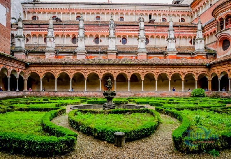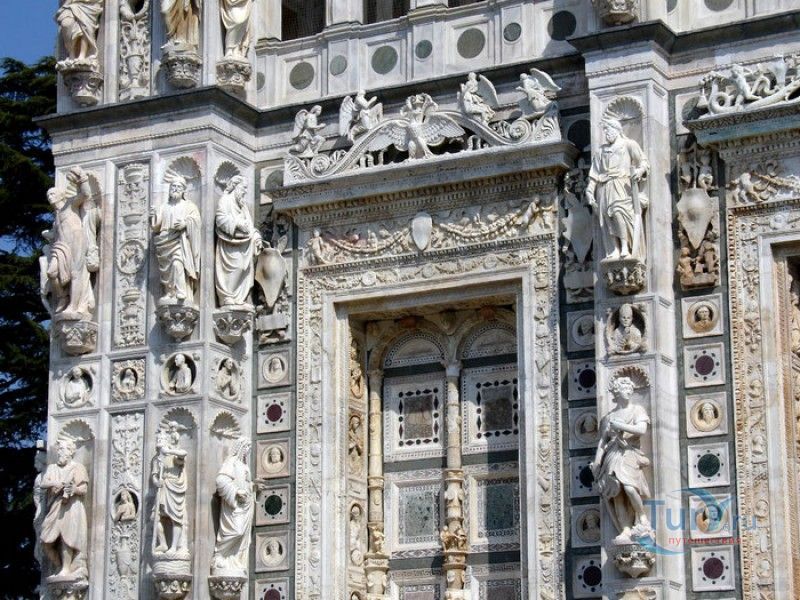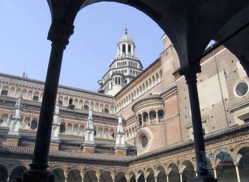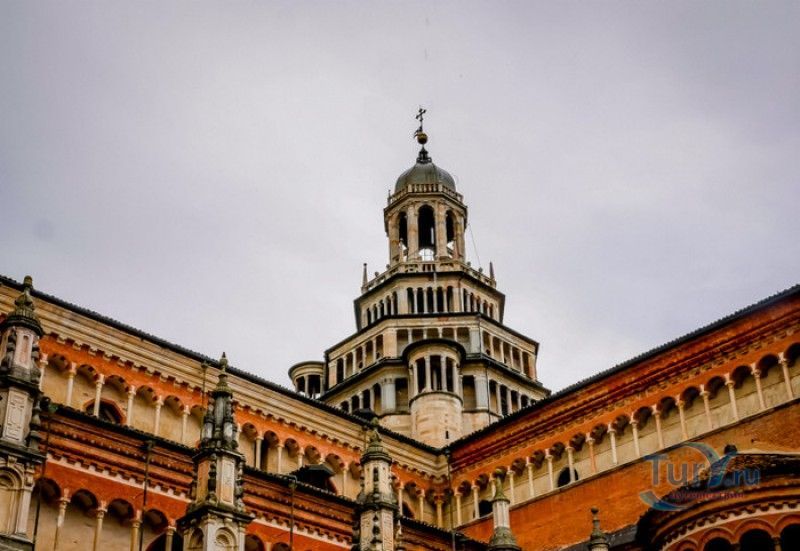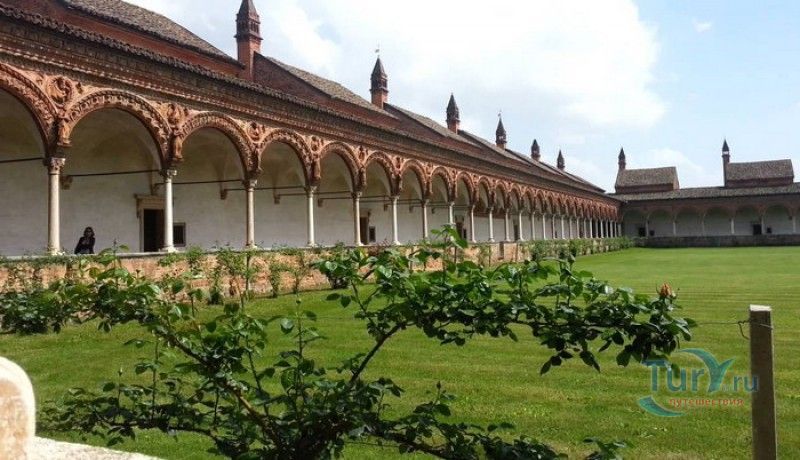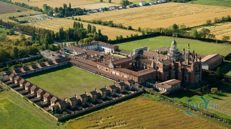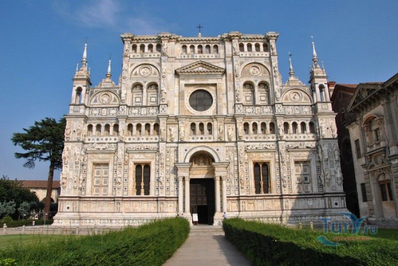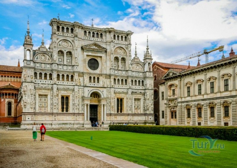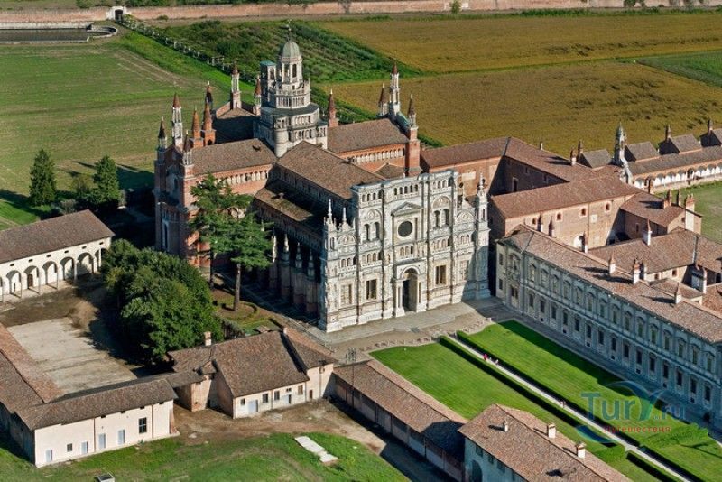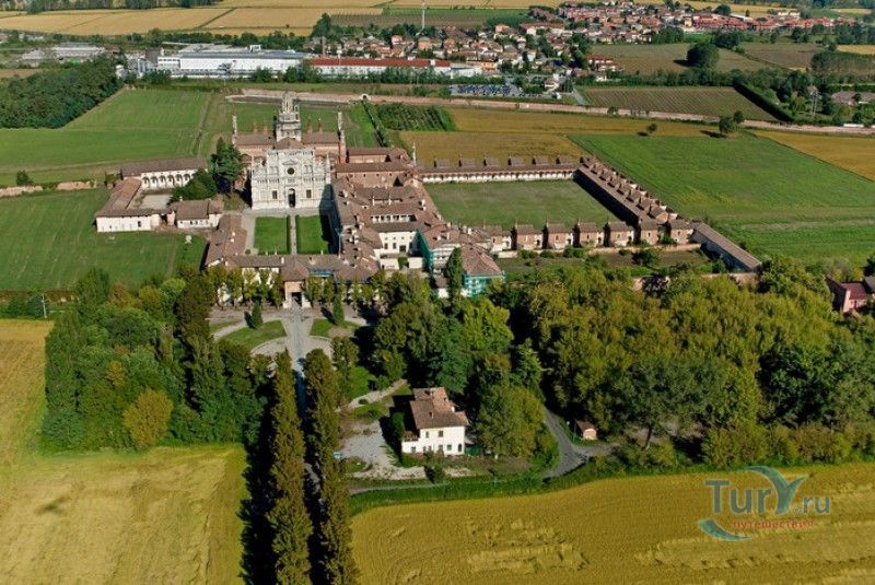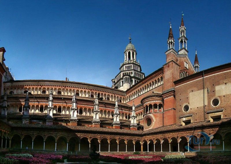 Картезианский Монастырь Павийская Чертоза расположен на территории коммуны Чертоза-ди-Павия, в 8 километрах к северу от города Павия и в 30 километрах от Милана. Монастырский комплекс был основан в 1396 году по указу Джана Галеаццо Висконти, первого герцога Миланского, во исполнения обета, данного его женой Екатериной Висконти. Под строительство монастыря были отведены обширные охотничьи угодья близ города Павия, принадлежавшие семейству Висконти. Первый камень в основание обители был заложен 27 августа 1396 года, первым архитектором, который руководил строительством, был Марко Солари. Первоначально обитель для ордена Картезианцев возводилась в готическом стиле, завершали её строительство уже в стиле Ренессанс архитекторы Джованни и Гвинифорте Солари. Свой окончательный вид Павийская Чертоза приобрела под руководством архитектора Джованни Антонио Амадео. Церковь монастыря, освящённая 3 мая 1497 года в честь Санта-Мария-делле-Грацие, по замыслу герцога, должна была стать усыпальницей для членов семьи Висконти, а затем - и Сфорца (после смерти последнего герцога Висконти в 1447 году, титул герцога Миланского получил Франческо Сфорца). Монастырский комплекс состоит из церкви Санта-Мария-делле-Грацие, двух клуатров (большого и малого), Герцогского дворца, монашеских келий и хозяйственных построек. В архитектурном плане Павийская Чертоза является шедевром ломбардийского зодчества XV века, в котором гармонично объединены готический и ренессансный архитектурные стили. Несомненно, красивейшим зданием ансамбля является церковь Санта-Мария-делле-Грацие. Трёхнефный храм с апсидой, трансептом и боковыми часовнями в плане имеет форму латинского креста, крестообразный готический свод, расписанный под звёздное небо и украшенный геометрическим орнаментом, поддерживают мощные каменные колонны с капителями. Настоящим произведением искусства является мраморный фасад церкви, украшенный скульптурами, небольшими шпилями с контрофорсами, гербами, медальонами и барельефами с изображениями древнеримских императоров, философов и учёных, христианских пророков и апостолов. Над оформлением фасада работали лучшие мастера того времени - Амадео, Ломбардо, Бриоско, Пиольтелло, Алесси, делла Порто. Великолепный мраморный портал со сдвоенными колоннами, украшенными резными барельефами, был выполнен Бенедетто Бриоско по проекту Джованни Антонио Амадео. Оформление интерьера ничуть не уступает экстерьеру пышностью и богатством убранства. В церкви сохранились фрески, написанные Амброджо Бергоньоне, а также картины его кисти - "Святой Амвросий", "Святой Сир" и "Распятие". Кроме того, в храме можно увидеть скульптуры и полотна работы Перуджино, Черано, Луини, Мораццоне, Гверчино, Франческо Каиро и цикл фресок кисти Даниеле Креспи. Резные деревянные хоры, огромная бронзовая люстра и витражи на окнах храма были выполнены в XV веке лучшими мастерами Ломбардии. В старой ризнице находится резной триптих из слоновой кости, состоящий из 62 панелей с изображениями Иисуса Христа, Девы Марии и волхвов, изготовленный в 1400-1409 годах специально для Павийской Чертозы. В церкви Санта-Мария-делле-Грацие установлены мраморные гробницы Джана Галеаццо Висконти (в правой части трансепта) и Лодовико Сфорца (Лодовико иль Моро) и его жены Беатриче д'Эсте (в левой части трансепт