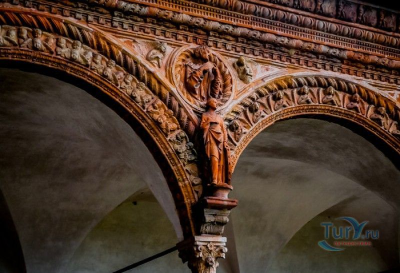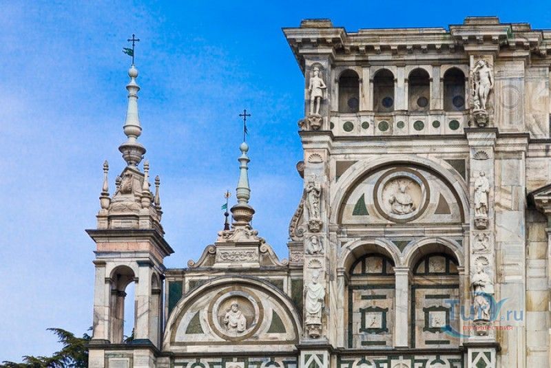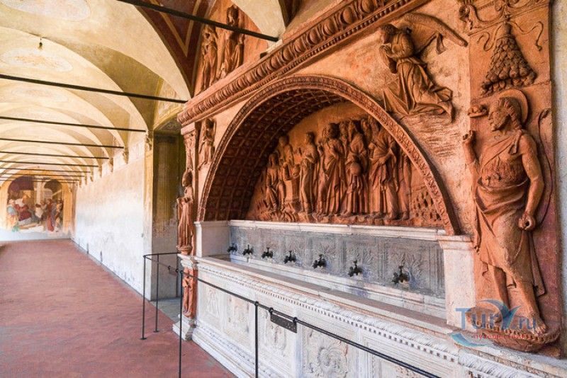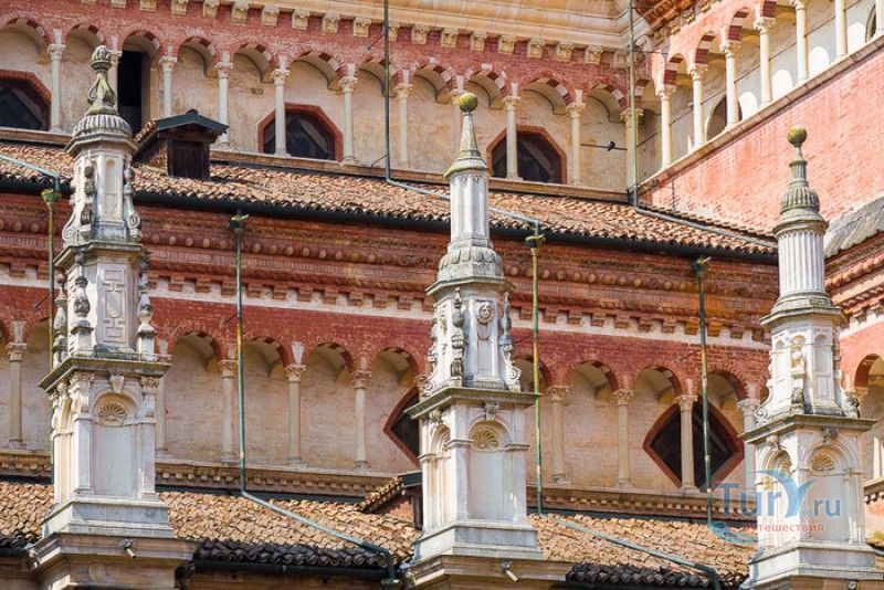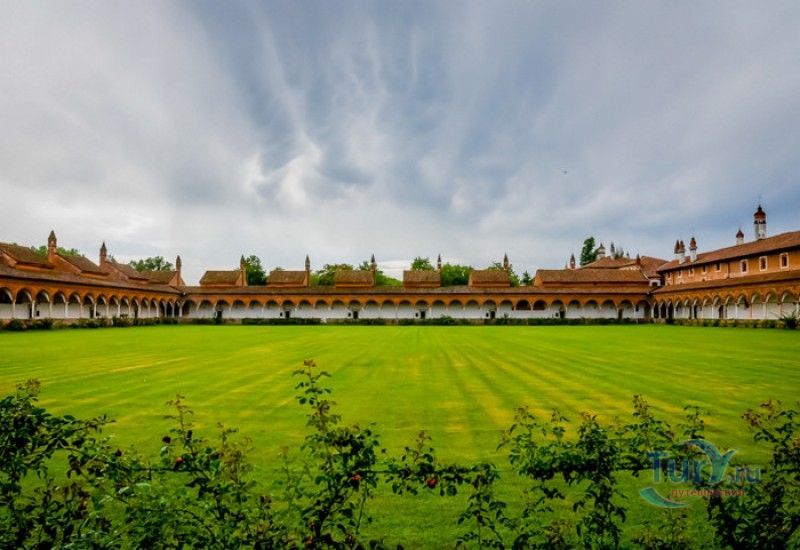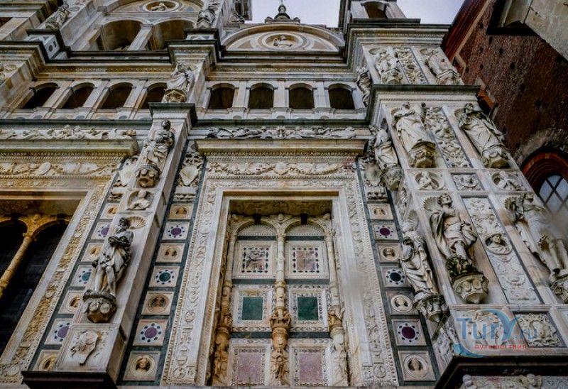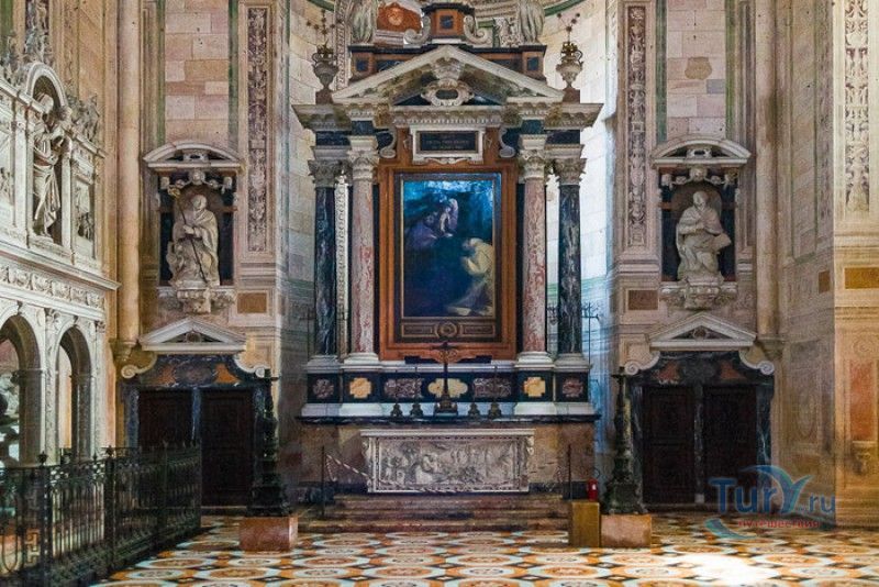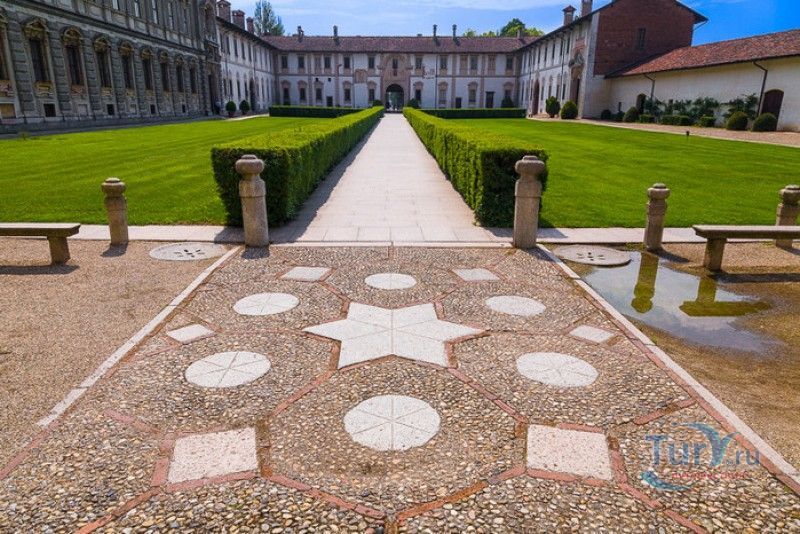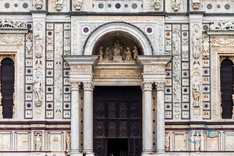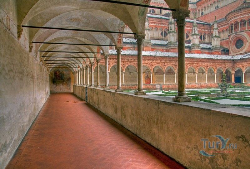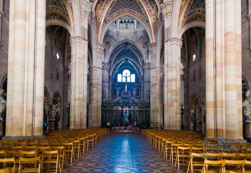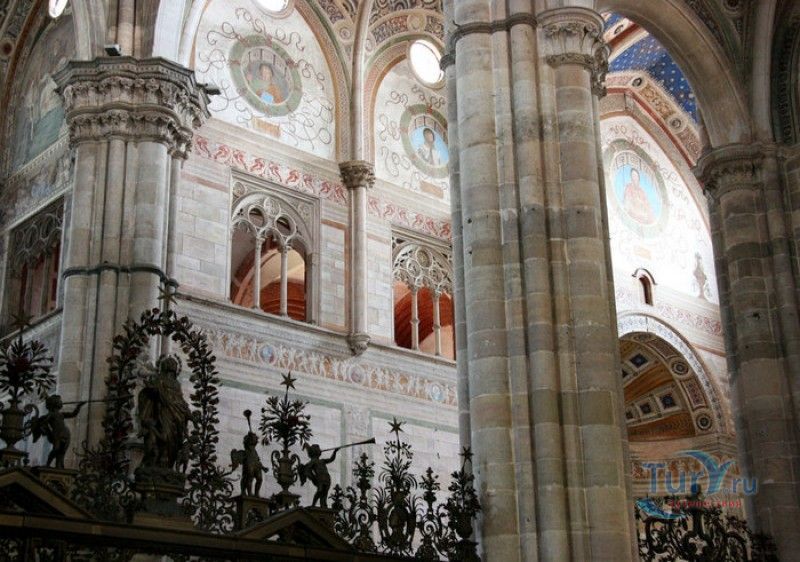 Картезианский Монастырь Павийская Чертоза расположен на территории коммуны Чертоза-ди-Павия, в 8 километрах к северу от города Павия и в 30 километрах от Милана. Монастырский комплекс был основан в 1396 году по указу Джана Галеаццо Висконти, первого герцога Миланского, во исполнения обета, данного его женой Екатериной Висконти. Под строительство монастыря были отведены обширные охотничьи угодья близ города Павия, принадлежавшие семейству Висконти. Первый камень в основание обители был заложен 27 августа 1396 года, первым архитектором, который руководил строительством, был Марко Солари. Первоначально обитель для ордена Картезианцев возводилась в готическом стиле, завершали её строительство уже в стиле Ренессанс архитекторы Джованни и Гвинифорте Солари. Свой окончательный вид Павийская Чертоза приобрела под руководством архитектора Джованни Антонио Амадео. Церковь монастыря, освящённая 3 мая 1497 года в честь Санта-Мария-делле-Грацие, по замыслу герцога, должна была стать усыпальницей для членов семьи Висконти, а затем - и Сфорца (после смерти последнего герцога Висконти в 1447 году, титул герцога Миланского получил Франческо Сфорца). Монастырский комплекс состоит из церкви Санта-Мария-делле-Грацие, двух клуатров (большого и малого), Герцогского дворца, монашеских келий и хозяйственных построек. В архитектурном плане Павийская Чертоза является шедевром ломбардийского зодчества XV века, в котором гармонично объединены готический и ренессансный архитектурные стили. Несомненно, красивейшим зданием ансамбля является церковь Санта-Мария-делле-Грацие. Трёхнефный храм с апсидой, трансептом и боковыми часовнями в плане имеет форму латинского креста, крестообразный готический свод, расписанный под звёздное небо и украшенный геометрическим орнаментом, поддерживают мощные каменные колонны с капителями. Настоящим произведением искусства является мраморный фасад церкви, украшенный скульптурами, небольшими шпилями с контрофорсами, гербами, медальонами и барельефами с изображениями древнеримских императоров, философов и учёных, христианских пророков и апостолов. Над оформлением фасада работали лучшие мастера того времени - Амадео, Ломбардо, Бриоско, Пиольтелло, Алесси, делла Порто. Великолепный мраморный портал со сдвоенными колоннами, украшенными резными барельефами, был выполнен Бенедетто Бриоско по проекту Джованни Антонио Амадео. Оформление интерьера ничуть не уступает экстерьеру пышностью и богатством убранства. В церкви сохранились фрески, написанные Амброджо Бергоньоне, а также картины его кисти - "Святой Амвросий", "Святой Сир" и "Распятие". Кроме того, в храме можно увидеть скульптуры и полотна работы Перуджино, Черано, Луини, Мораццоне, Гверчино, Франческо Каиро и цикл фресок кисти Даниеле Креспи. Резные деревянные хоры, огромная бронзовая люстра и витражи на окнах храма были выполнены в XV веке лучшими мастерами Ломбардии. В старой ризнице находится резной триптих из слоновой кости, состоящий из 62 панелей с изображениями Иисуса Христа, Девы Марии и волхвов, изготовленный в 1400-1409 годах специально для Павийской Чертозы. В церкви Санта-Мария-делле-Грацие установлены мраморные гробницы Джана Галеаццо Висконти (в правой части трансепта) и Лодовико Сфорца (Лодовико иль Моро) и его жены Беатриче д'Эсте (в левой части трансепт