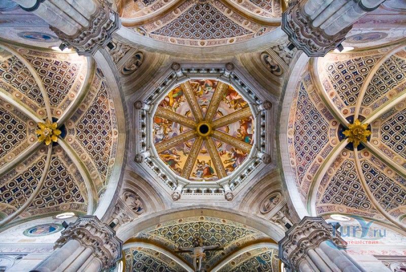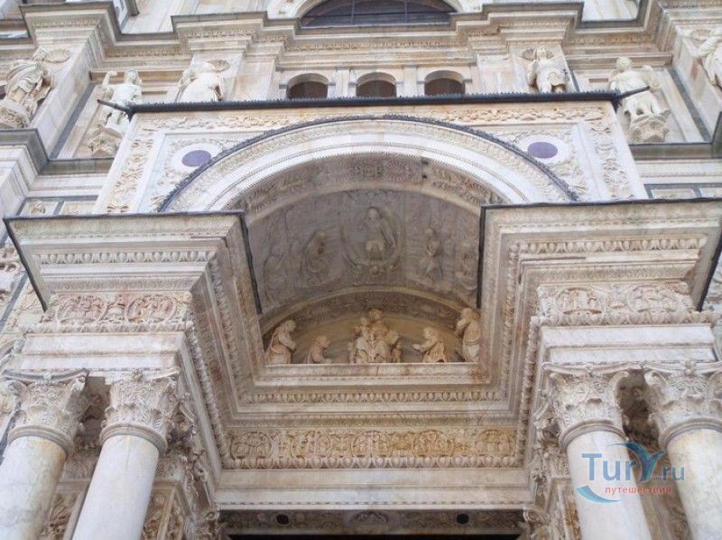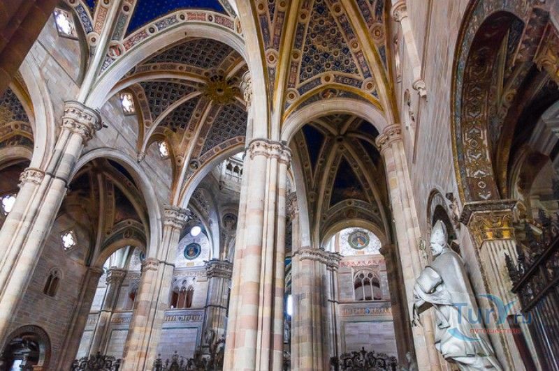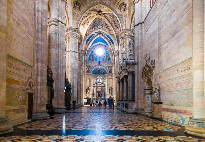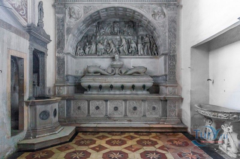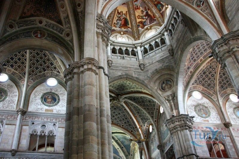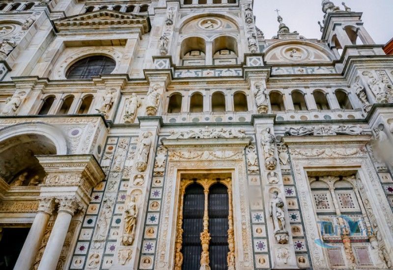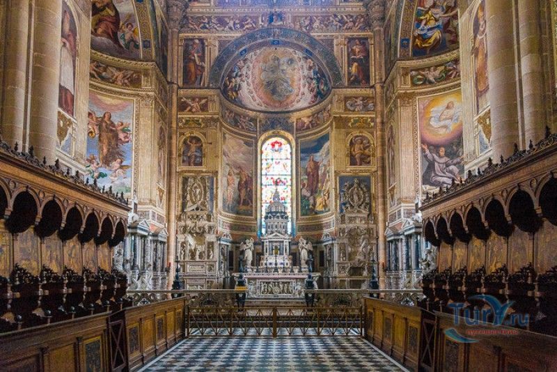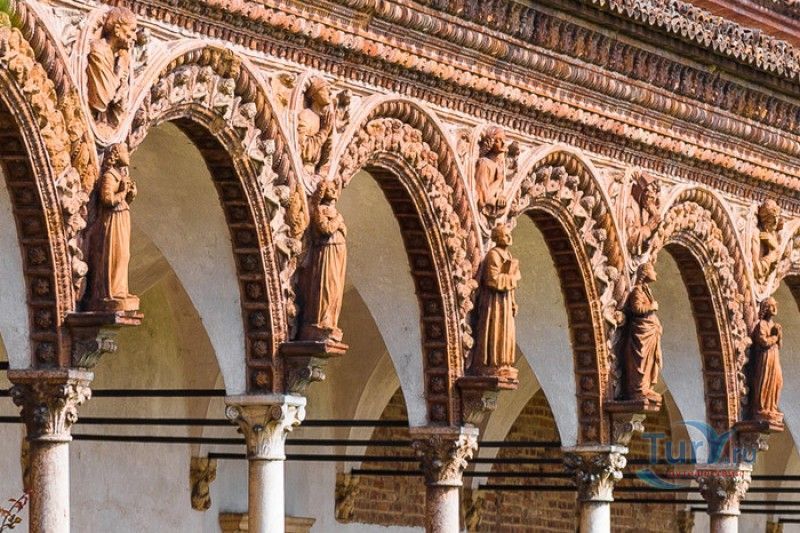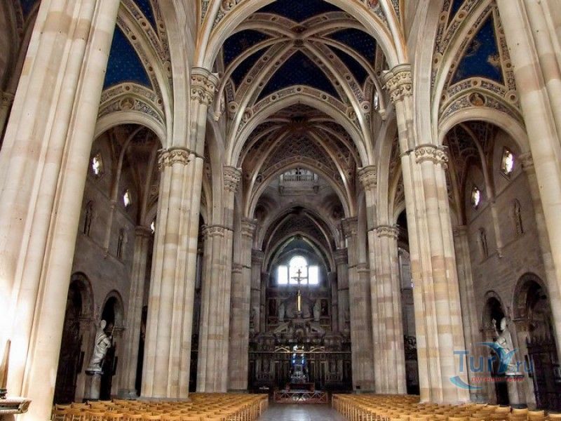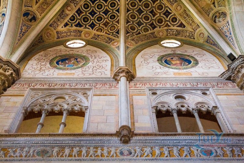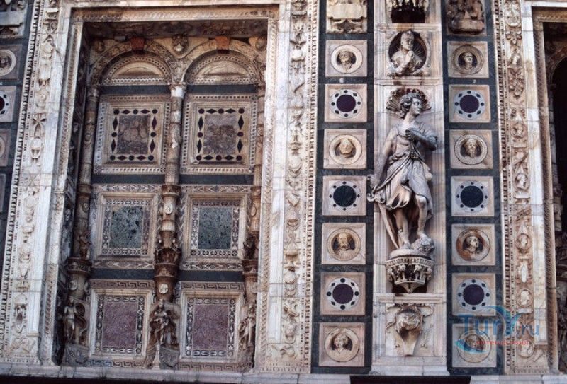 Картезианский Монастырь Павийская Чертоза расположен на территории коммуны Чертоза-ди-Павия, в 8 километрах к северу от города Павия и в 30 километрах от Милана. Монастырский комплекс был основан в 1396 году по указу Джана Галеаццо Висконти, первого герцога Миланского, во исполнения обета, данного его женой Екатериной Висконти. Под строительство монастыря были отведены обширные охотничьи угодья близ города Павия, принадлежавшие семейству Висконти. Первый камень в основание обители был заложен 27 августа 1396 года, первым архитектором, который руководил строительством, был Марко Солари. Первоначально обитель для ордена Картезианцев возводилась в готическом стиле, завершали её строительство уже в стиле Ренессанс архитекторы Джованни и Гвинифорте Солари. Свой окончательный вид Павийская Чертоза приобрела под руководством архитектора Джованни Антонио Амадео. Церковь монастыря, освящённая 3 мая 1497 года в честь Санта-Мария-делле-Грацие, по замыслу герцога, должна была стать усыпальницей для членов семьи Висконти, а затем - и Сфорца (после смерти последнего герцога Висконти в 1447 году, титул герцога Миланского получил Франческо Сфорца). Монастырский комплекс состоит из церкви Санта-Мария-делле-Грацие, двух клуатров (большого и малого), Герцогского дворца, монашеских келий и хозяйственных построек. В архитектурном плане Павийская Чертоза является шедевром ломбардийского зодчества XV века, в котором гармонично объединены готический и ренессансный архитектурные стили. Несомненно, красивейшим зданием ансамбля является церковь Санта-Мария-делле-Грацие. Трёхнефный храм с апсидой, трансептом и боковыми часовнями в плане имеет форму латинского креста, крестообразный готический свод, расписанный под звёздное небо и украшенный геометрическим орнаментом, поддерживают мощные каменные колонны с капителями. Настоящим произведением искусства является мраморный фасад церкви, украшенный скульптурами, небольшими шпилями с контрофорсами, гербами, медальонами и барельефами с изображениями древнеримских императоров, философов и учёных, христианских пророков и апостолов. Над оформлением фасада работали лучшие мастера того времени - Амадео, Ломбардо, Бриоско, Пиольтелло, Алесси, делла Порто. Великолепный мраморный портал со сдвоенными колоннами, украшенными резными барельефами, был выполнен Бенедетто Бриоско по проекту Джованни Антонио Амадео. Оформление интерьера ничуть не уступает экстерьеру пышностью и богатством убранства. В церкви сохранились фрески, написанные Амброджо Бергоньоне, а также картины его кисти - "Святой Амвросий", "Святой Сир" и "Распятие". Кроме того, в храме можно увидеть скульптуры и полотна работы Перуджино, Черано, Луини, Мораццоне, Гверчино, Франческо Каиро и цикл фресок кисти Даниеле Креспи. Резные деревянные хоры, огромная бронзовая люстра и витражи на окнах храма были выполнены в XV веке лучшими мастерами Ломбардии. В старой ризнице находится резной триптих из слоновой кости, состоящий из 62 панелей с изображениями Иисуса Христа, Девы Марии и волхвов, изготовленный в 1400-1409 годах специально для Павийской Чертозы. В церкви Санта-Мария-делле-Грацие установлены мраморные гробницы Джана Галеаццо Висконти (в правой части трансепта) и Лодовико Сфорца (Лодовико иль Моро) и его жены Беатриче д'Эсте (в левой части трансепт
