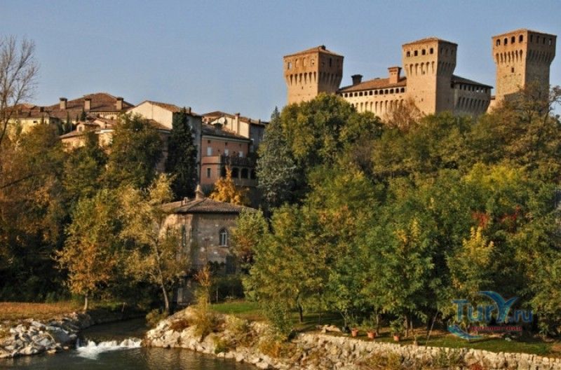 Замок Виньолы (Рокка-ди-Виньола) - средневековый замок в городе Виньола, расположенный на берегу реки Понаро, в 20 километрах к югу от Модены. Точная дата строительства замка неизвестна, в исторических хрониках упоминания о нём датируются концом X века, временем окончания правления династии Каролингов, первое же документальное подтверждение существования крепости в Виньоле появилось в 1178 году. Скорей всего, крепость была построена для защиты города и аббатства Нонантола (Abbazia di Nonantola), расположенного в 10 километрах от Модены, от нападений венгров. Вплоть до XV века фортификационные сооружения Виньолы имели только военно-оборонительное назначение. В XIII столетии крепость часто переходила из рук в руки от гвельфов (Болонья) к гиббелинам (Модена) и наоборот. В 1336 году власть над Виньолой захватил правитель Феррары и Модены герцог Обиццо III д'Эсте, в 1401 году Никколо III д'Эсте передаёт часть своих ленных земель (в том числе и крепость Виньолы) своему верному вассалу - Юджоччино Контрари, при котором Рокка-ди-Виньола была превращена в роскошную резиденцию аристократического семейства. Замок был значительно расширен и перестроен, внутренние помещения богато украшены фресками и лепниной. После смерти последнего наследника семьи Контрари в 1575 году, замок Виньолы снова вернулся во владение рода д'Эсте, а в 1577 году был куплен сыном папы Григория XIII - маркизом Виньола Джакомо Бонкомпаньи. Семья Бонкомпаньи-Людовизи, владеющая замком до 1796 года, никогда постоянно не жила в Рокка-ди-Виньола, управление замком было поручено доверенным лицам. В 1796 году, после завоевания итальянских земель Наполеоном Бонопартом, феодальная собственность была отменена, и замок был конфискован. В конце XIX - начале XX веков в замке размещались муниципалитет, библиотека и отделение банка Виньолы. В 1965 году замок был приобретен Сберегательным банком Виньолы (Cassa di Risparmio di Vignola), а в 1998 году владельцем Рокка-ди-Виньола стал Фонд Виньолы (Fondazione di Vignola), занимающейся защитой, сохранением и популяризацией исторического и художественного наследия Виньолы. Замок Виньолы состоит из пяти этажей, в цокольном этаже расположены залы Контрари и Грассони со сводчатыми потолками, используемые в настоящее время для проведения конференций и концертов. Этажом выше расположены парадные покои - зал Львов и Леопардов, зал Голубей и зал Колец, а также личные апартаменты бывших владельцев замка - Дамский номер, Павильонный зал, зал Гербов, зал Деревьев и часовня Контрари. Стены и потолки помещений богато украшены фресками, гобеленами и декоративной лепниной. Часовню украшает цикл фресок в стиле поздней готики с изображением сцен из жизни Иисуса Христа, написанных в начале XV века по заказу Юджоччино Контрари неизвестным художником, оставившим свой след в истории под именем "Мастер из Виньолы". На второй этаж ведёт крутая лестница, здесь расположены помещения, в которых жили солдаты гарнизона крепости и прислуга. После того, как Рокка-ди-Виньола утратила своё военное назначение, большинство этих помещений использовались в качестве тюрьмы. На верхнем этаже были оборудованы дорожки и крытые проходы с рядами небольших арочных окон, соединяющие все три башни Рокка-ди-Виньола - башню Нонантола, Женскую башню и башню Понелло. Эти проходы использовались гарнизоном для патрулирования и защиты замка