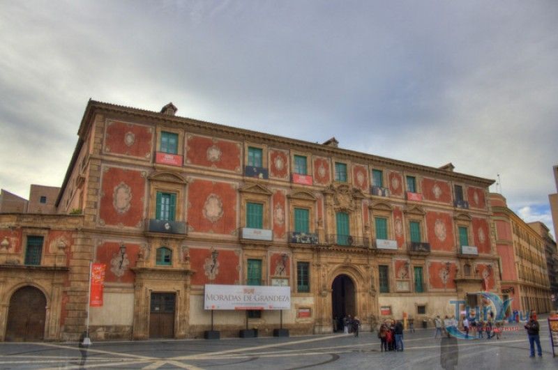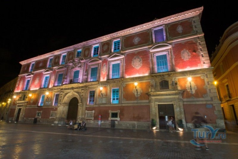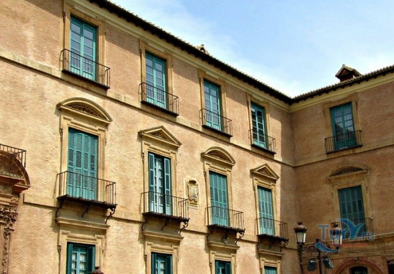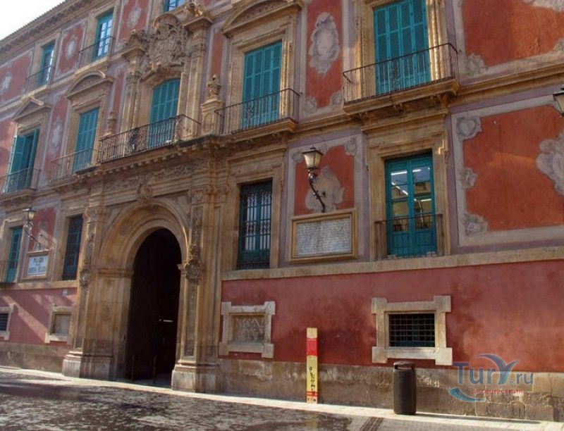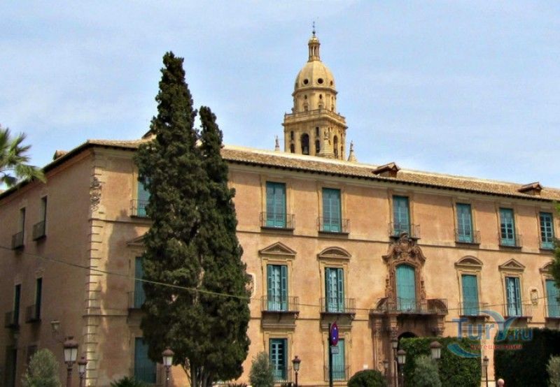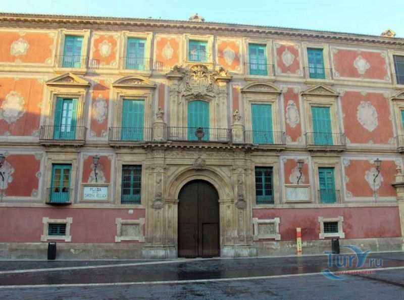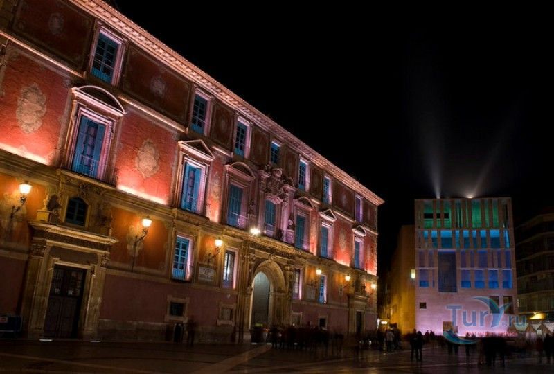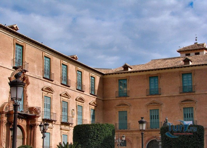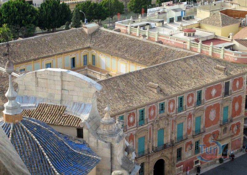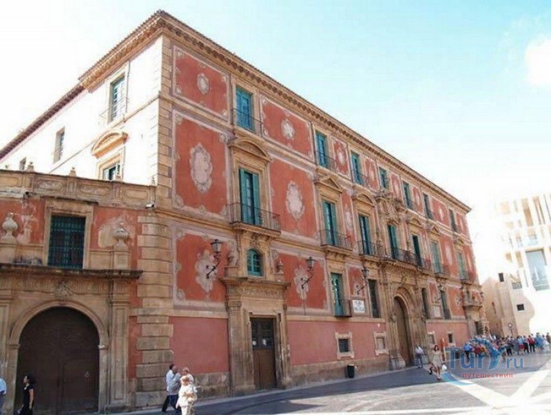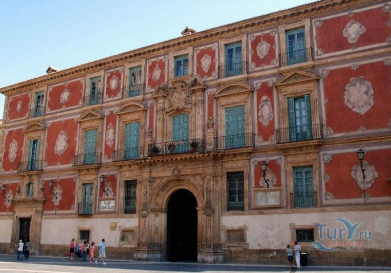 Епископский Дворец расположен в старой части города Мурсия, на площади Кардинала Бельюга, рядом с Кафедральным собором. Строительство дворца-резиденции епископа Картахены велось в 1748-1768 годах, в его строительстве принимали участие лучшие мастера-каменщики того времени. Существует предание, что дворец построен по указу епископа Хуана Матео, пожелавшего видеть из окон своей резиденции великолепный фасад недавно построенного Кафедрального собора Мурсии. Епископский дворец состоит из двух соединённых между собой зданий. В первую очередь была возведена так называемая "смотровая площадка епископа" или "дворцовый молот" - возвышающееся над остальной частью дворца здание, построенное, чтобы обеспечить вид на реку Сегура и набережную Пасео дель Аренал. Главный корпус дворца был построен чуть позже, в его архитектуре явно прослеживается влияние позднего итальянского маньеризма. Декоративное оформление фасада напоминает римские и неаполитанские дворцы - фресковые орнаменты, декоративные фризы, геральдические щиты. Центральный арочный портал с балконом и два боковых входа выполнены по подобию дворца Фарнезе в Риме, над оформлением которого работал сам Микеланджело. Внутренний двор Епископского дворца представляет собой патио, образованное тремя аркадами дорического ордера. Интерьер дворца оформлен в стилях барокко и рококо. Парадная (императорская) лестница дворца, выполненная в стиле римского барокко, соединяет аркаду внутреннего двора с первым этажом резиденции. Лестницу украшают медальоны с гербами всех епископов Картахены, витражные окна и огромная кованая люстра. Небольшая епископская часовня, построенная в 1744 году, имеет круглую форму, оформлена в стилях барокко и рококо - колонны с коринфскими пилястрами, декоративный карниз с лепниной, пол из цветного мрамора, мраморный алтарь и хрустальные люстры. В ознаменование окончания строительства Епископский дворца над балконом центрального портала был размещён щит с гербом епископа Роха, при котором работы по возведению резиденции были завершены.