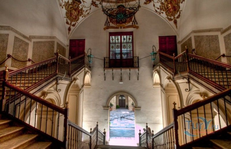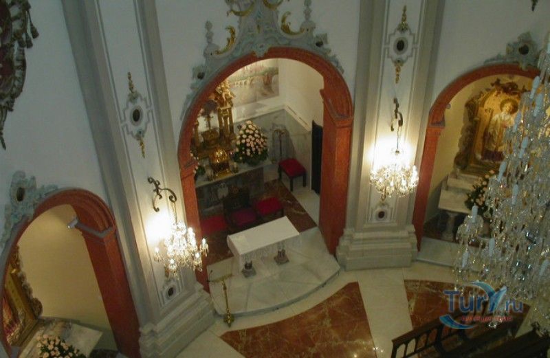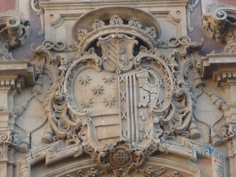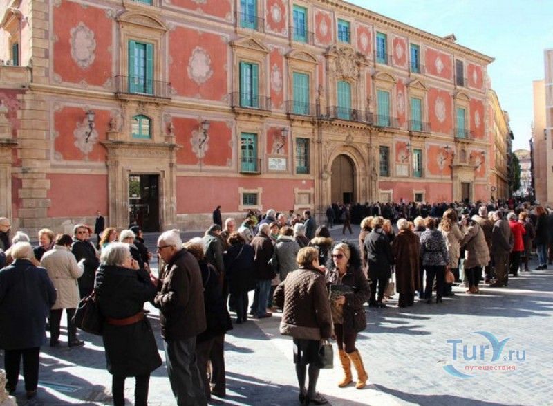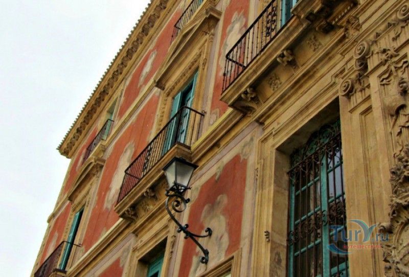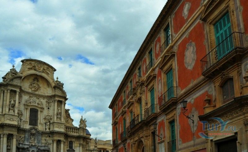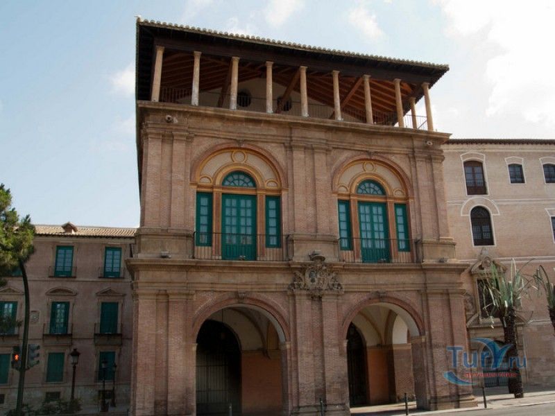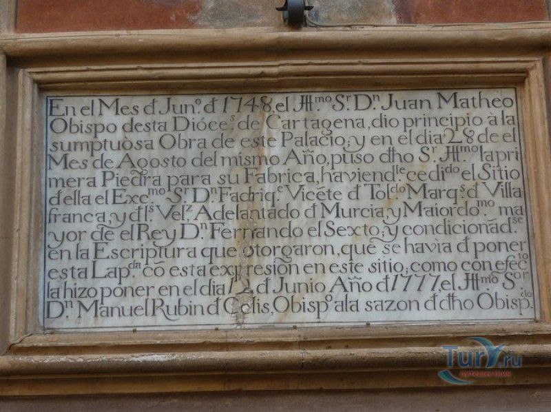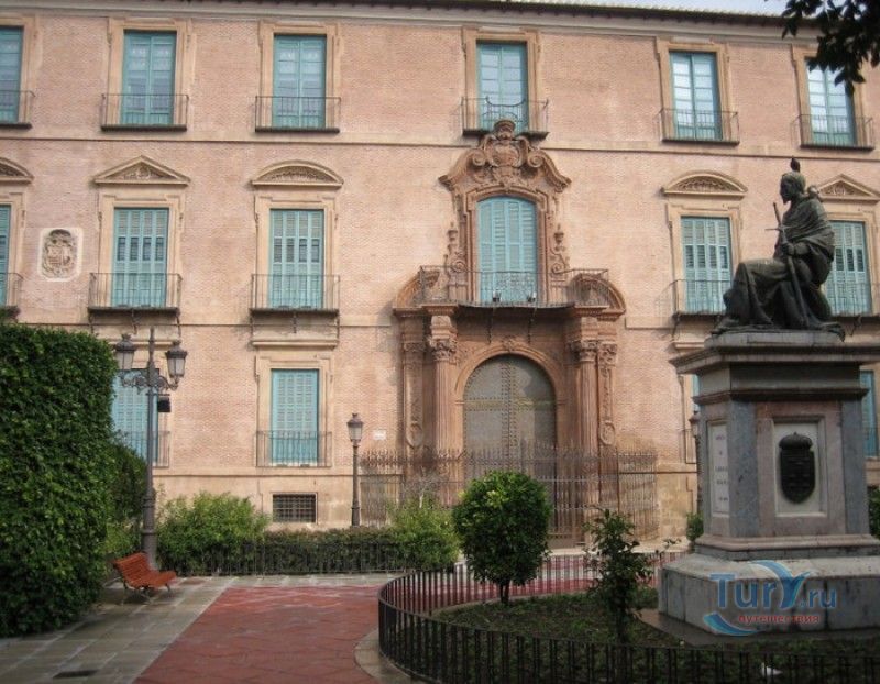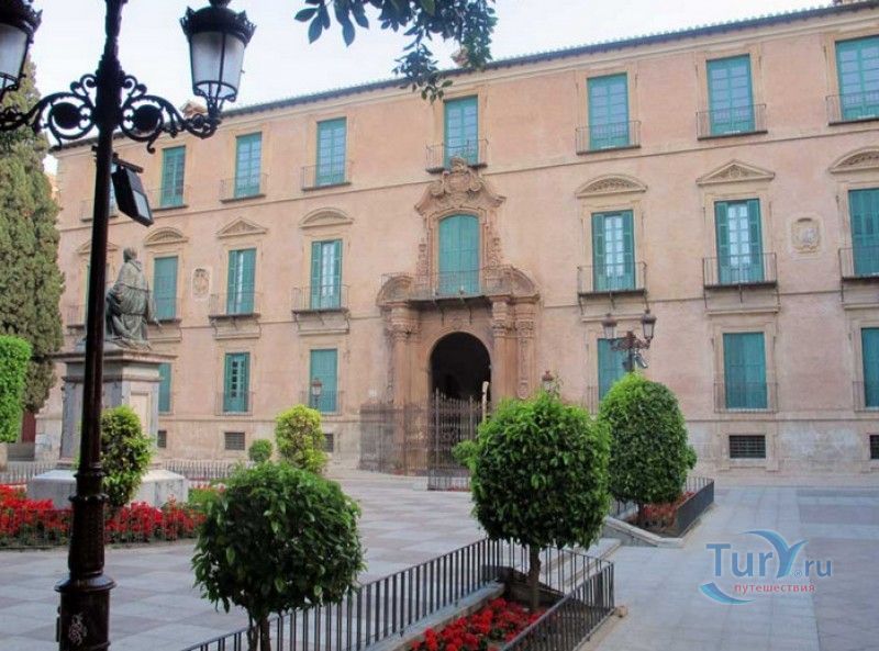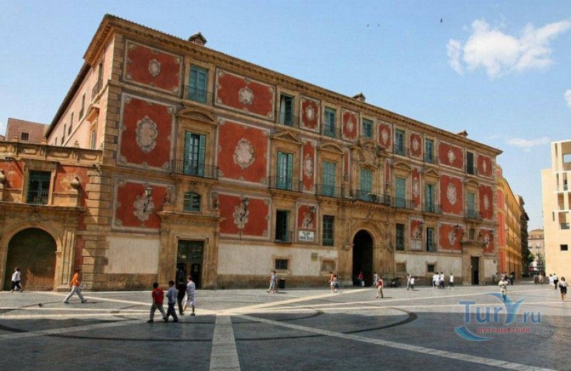 Епископский Дворец расположен в старой части города Мурсия, на площади Кардинала Бельюга, рядом с Кафедральным собором. Строительство дворца-резиденции епископа Картахены велось в 1748-1768 годах, в его строительстве принимали участие лучшие мастера-каменщики того времени. Существует предание, что дворец построен по указу епископа Хуана Матео, пожелавшего видеть из окон своей резиденции великолепный фасад недавно построенного Кафедрального собора Мурсии. Епископский дворец состоит из двух соединённых между собой зданий. В первую очередь была возведена так называемая "смотровая площадка епископа" или "дворцовый молот" - возвышающееся над остальной частью дворца здание, построенное, чтобы обеспечить вид на реку Сегура и набережную Пасео дель Аренал. Главный корпус дворца был построен чуть позже, в его архитектуре явно прослеживается влияние позднего итальянского маньеризма. Декоративное оформление фасада напоминает римские и неаполитанские дворцы - фресковые орнаменты, декоративные фризы, геральдические щиты. Центральный арочный портал с балконом и два боковых входа выполнены по подобию дворца Фарнезе в Риме, над оформлением которого работал сам Микеланджело. Внутренний двор Епископского дворца представляет собой патио, образованное тремя аркадами дорического ордера. Интерьер дворца оформлен в стилях барокко и рококо. Парадная (императорская) лестница дворца, выполненная в стиле римского барокко, соединяет аркаду внутреннего двора с первым этажом резиденции. Лестницу украшают медальоны с гербами всех епископов Картахены, витражные окна и огромная кованая люстра. Небольшая епископская часовня, построенная в 1744 году, имеет круглую форму, оформлена в стилях барокко и рококо - колонны с коринфскими пилястрами, декоративный карниз с лепниной, пол из цветного мрамора, мраморный алтарь и хрустальные люстры. В ознаменование окончания строительства Епископский дворца над балконом центрального портала был размещён щит с гербом епископа Роха, при котором работы по возведению резиденции были завершены.