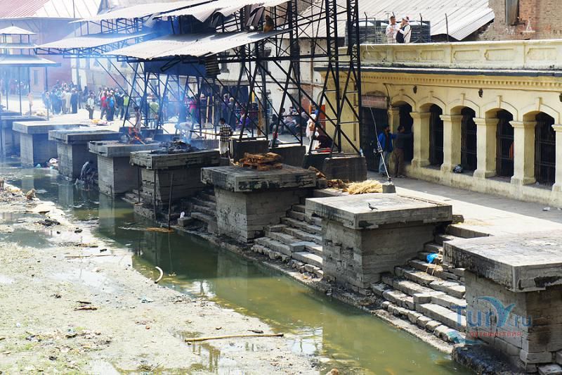 На западном берегу реки стоят основные храмы, в большой храмовый двор вход закрыт для неиндусов, но комплекс хорошо просматривается с другого берега реки, и можно наблюдать погребальные церемонии. Вдоль реки расположены постаменты для погребальных костров. У храмов — дом ожидающих смерти, куда приходят старики, и живут там последние недели под присмотром астрологов, точно определяющих момент их смерти. К северу от моста сжигают представителей высших каст, специальный постамент — для членов королевского рода. К югу от моста — постаменты для низких каст. Погребальный ритуал довольно сложен, правильное его исполнение способствует хорошему перерождению в следующей реинкарнации. После сожжения прах пускают вниз по реке. В Багмати, как в Ганге, купаются для ритуального очищения. Там же омывают мёртвых перед погребением. По реке пускают вещи, которые ниже вылавливают йоги.