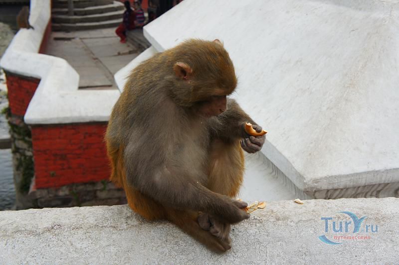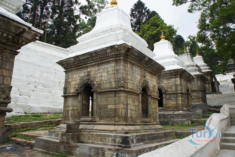 На другой стороне реки — 11 маленьких храмов Шивы с лингамами, за которыми стоят галереи шиваистских лингамов и йони. Всего в комплексе 108 лингамов. По ступеням поднимаешься в обезьяний парк, где сотни обезьян прыгают и висят на ветках. Пашупати — покровитель животных, поэтому обезьянам уютно у храмов комплекса.