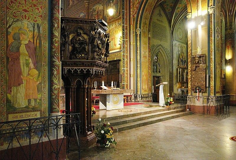 Каждый час с Вышеграда разносятся по городу перезвон колокола на храме ,который за 900 лет существования прошёл многочисленными перестройками. В 1903 г. была завершена последняя из них, которая придала внешнему виду костела неоготический вид. Интерьеры богато украшены орнаментальным и фигурным декором в виде настенных росписей. В сокровищнице храма для просмотра открыта экспозиция ювелирных изделий и драгоценных тканей Вышеградской капитулы.