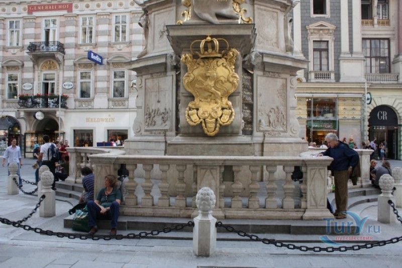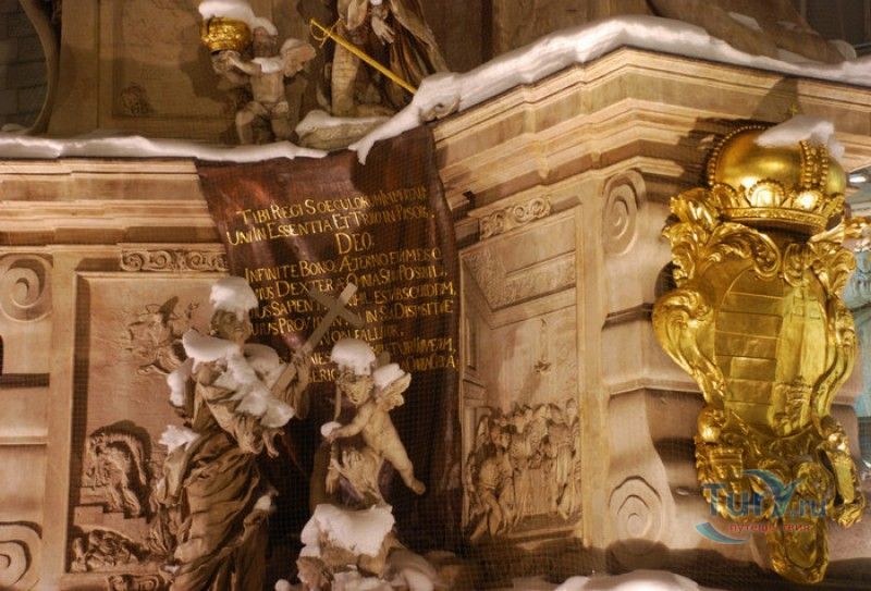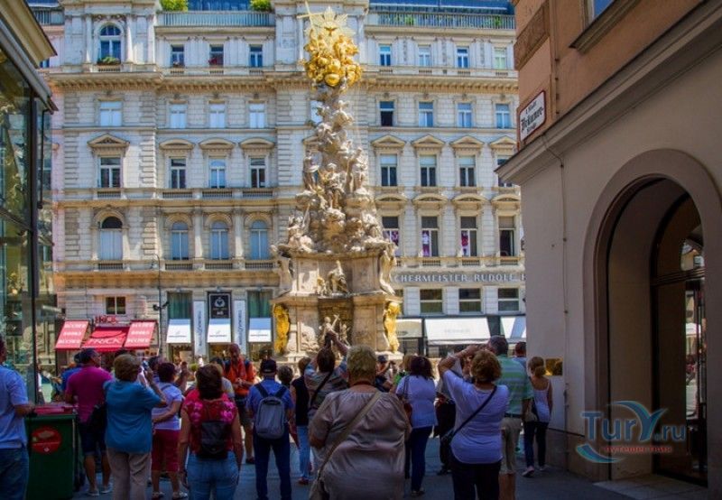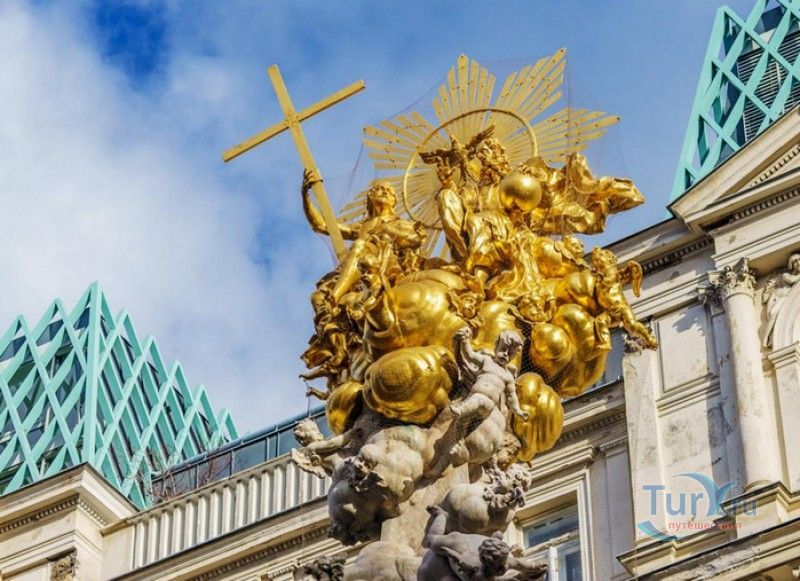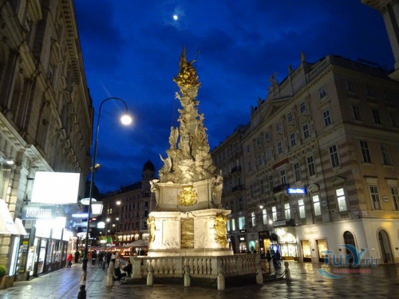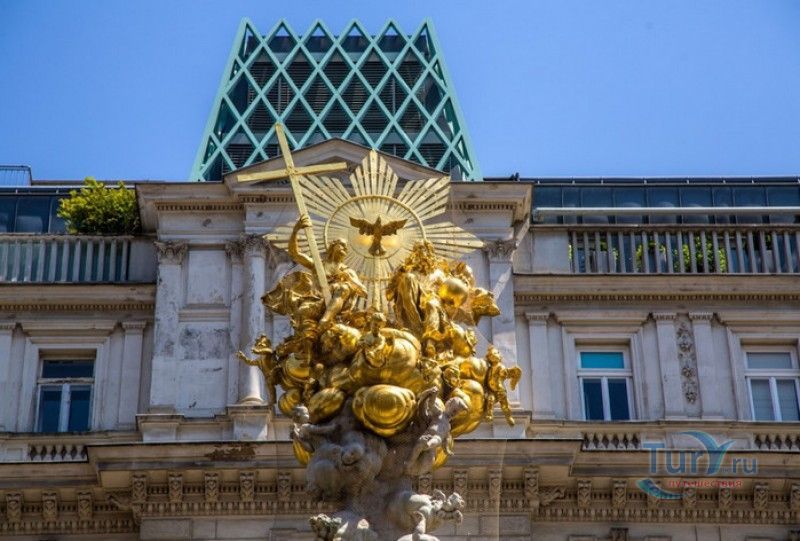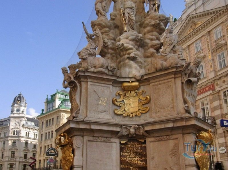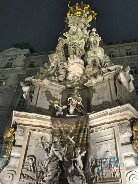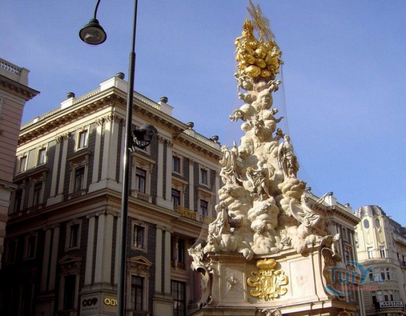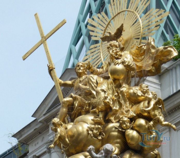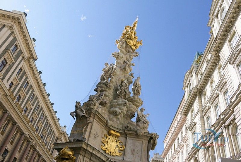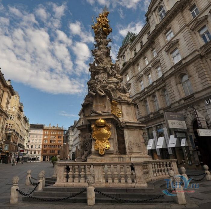 Чумная Колонна (Колонна Святой Троицы) в Вене - один из самых известных скульптурных памятников в стиле Высокого барокко в столице Австрии, она расположена в историческом центре города, на улице Грабен. История колонны связана с Великой эпидемией чумы в Вене - одной из самых страшных эпидемий бубонной чумы не только в Австрии, но и во всей Европе, свирепствовавшей в Вене в 1679 году. Эпидемия, которую современники окрестили "венской смертью", унесла жизни более 76 000 горожан. В городе, погибающем от чумы, заботу о больных взяло на себя братство Святой Троицы, организовавшее в Вене специальные больницы для детей и взрослых. Медицина того времени "лечила" чуму с помощью рвотных средств, кровопускания и сомнительных мазей, реально победить эпидемию стало возможно только после организации вывоза с улиц города трупов жертв чумы и сжигания их за пределами Вены. В ознаменование победы над эпидемией чумы в 1679 году в Вене был установлен чумной столб - такое обещание дал своему народу император Леопольд I, покинувший столицу в самом начале эпидемии. Первоначально столб был выполнен из дерева по проекту скульптора Иоганна Фрууерта. Колонна была украшена символами девяти ангельских хоров и увенчана скульптурной группой, изображающей Святую Троицу (обычно чумные столбы посвящали Деве Марии, но венская колонна была установлена в честь Святой Троицы). В 1682 году было решено заменить деревянный столб на мраморный, проект нового памятника был заказан скульптору Матиасу Раухмюллеру, после смерти которого проектирование и строительство Чумной колонны курировал Пауль Штрудель. Первый камень в фундамент будущего памятника был заложен 30 июня 1687 года лично Леопольдом I, а 29 октября 1693 года Чумная колонна Святой Троицы была торжественно открыта. Колонна представляет собой сложную иконографическую композицию, в основе которой лежит идея победы над чумой благодаря смиренным молитвам императора Леопольда I. На колонне размещены три скульптуры императора Лепольда I - в верхней части пьедестала, где монарх изображён в виде молящегося Богу заступника, среди фигур ангелов - в качестве посредника между Богом и людьми, и в самой верхней части колонны. На боковых поверхностях основания колонны размещены шесть рельефов, гербы Австрии, Венгрии и Чехии, а также таблички с текстами молитв на латинском зыке. Над пьедесталом расположено пирамидальное "облако" со статуями ангелов, венчает колонну скульптурная композиция, изображающая Святую Троицу. За свою более чем трёхвековую историю Чумная колонна ни разу не "покидала" своего места на улице Грабен, избежала разрушений и каких-либо существенных повреждений. В 1980-1981 годах Колонна Святой Троицы была полностью отреставрирована.